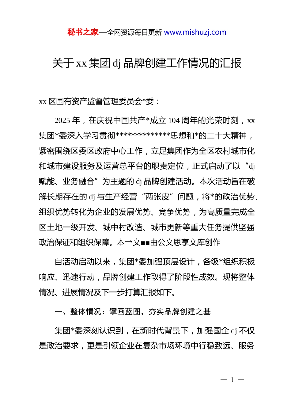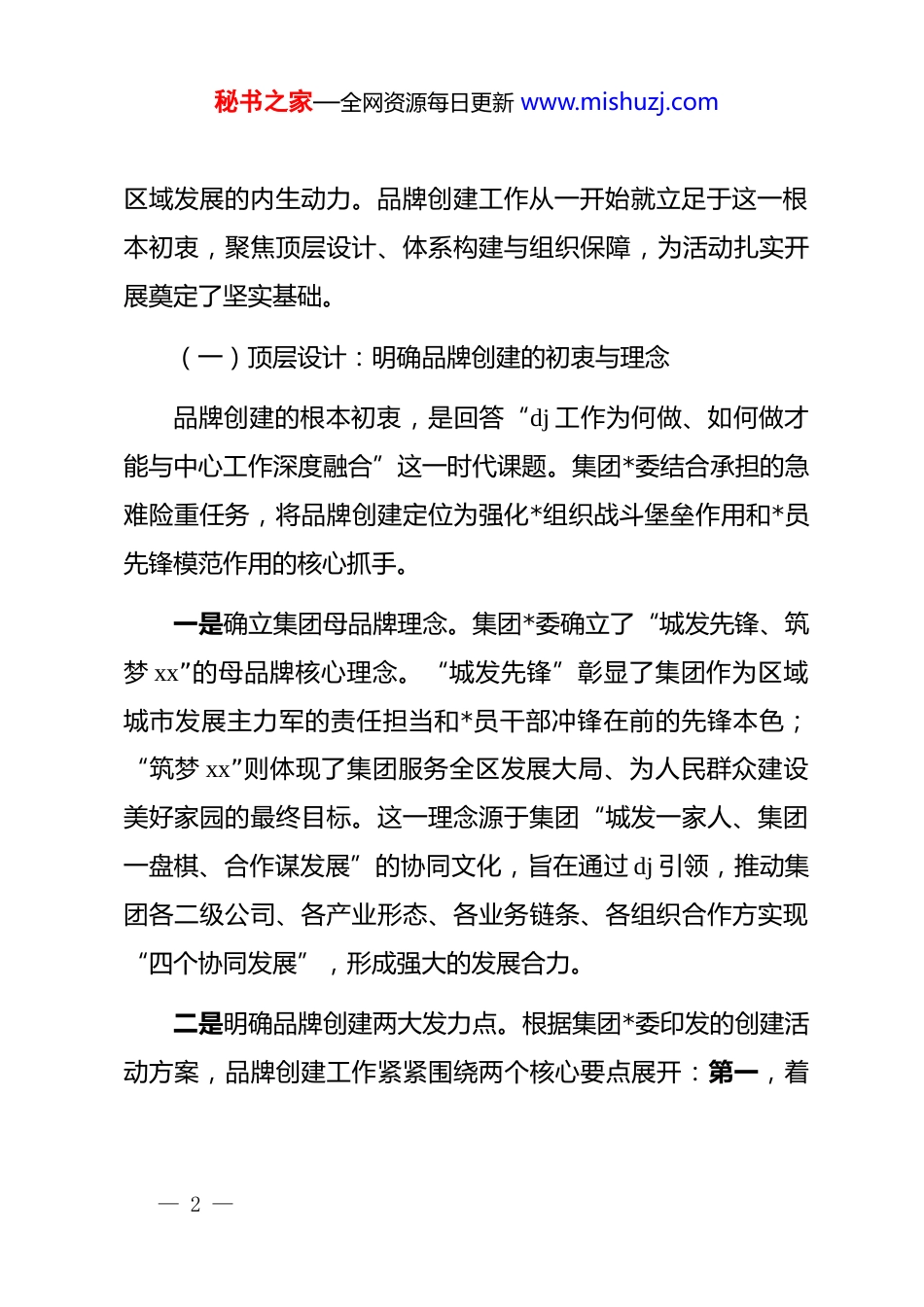 秘书之家—全网资源每日更新 www.mishuzj.com关于 xx 集团 dj 品牌创建工作情况的汇报xx 区国有资产监督管理委员会*委:2025 年,在庆祝中国共产*成立 104 周年的光荣时刻,xx集团*委深入学习贯彻**************思想和*的二十大精神,紧密围绕区委区政府中心工作,立足集团作为全区农村城市化和城市建设服务及运营总平台的职责定位,正式启动了以“dj赋能、业务融合”为主题的 dj 品牌创建活动。本次活动旨在破解长期存在的 dj 与生产经营“两张皮”问题,将*的政治优势、组织优势转化为企业的发展优势、竞争优势,为高质量完成全区土地一级开发、城中村改造、城市更新等重大任务提供坚强政治保证和组织保障。本→文■■由公文思享文库创作自活动启动以来,集团*委加强顶层设计,各级*组织积极响应、迅速行动,品牌创建工作取得了阶段性成效。现将整体情况、进展情况及下一步打算汇报如下。一、整体情况:擘画蓝图,夯实品牌创建之基集团*委深刻认识到,在新时代背景下,加强国企 dj 不仅是政治要求,更是引领企业在复杂市场环境中行稳致远、服务— 1 —秘书之家—全网资源每日更新 www.mishuzj.com区域发展的内生动力。品牌创建工作从一开始就立足于这一根本初衷,聚焦顶层设计、体系构建与组织保障,为活动扎实开展奠定了坚实基础。(一)顶层设计:明确品牌创建的初衷与理念品牌创建的根本初衷,是回答“dj 工作为何做、如何做才能与中心工作深度融合”这一时代课题。集团*委结合承担的急难险重任务,将品牌创建定位为强化*组织战斗堡垒作用和*员先锋模范作用的核心抓手。一是确立集团母品牌理念。集团*委确立了“城发先锋、筑梦 xx”的母品牌核心理念。“城发先锋”彰显了集团作为区域城市发展主力军的责任担当和*员干部冲锋在前的先锋本色;“筑梦 xx”则体现了集团服务全区发展大局、为人民群众建设美好家园的最终目标。这一理念源于集团“城发一家人、集团一盘棋、合作谋发展”的协同文化,旨在通过 dj 引领,推动集团各二级公司、各产业形态、各业务链条、各组织合作方实现“四个协同发展”,形成强大的发展合力。二是明确品牌创建两大发力点。根据集团*委印发的创建活动方案,品牌创建工作紧紧围绕两个核心要点展开:第一,着— 2 —秘书之家—全网资源每日更新 www.mishuzj.com力于“两个作用”的充分发挥,要求把*组织建在项目上、工作落在工地上,完善*员先锋队、*员“揭榜挂帅”等机制,使*组织和*员在攻坚克难中成为最可靠的力量。第二,着力于“四个协同”的有效实现,通过区域 dj 共同体、产业链 dj 联盟等形式,打破组织壁垒,凝聚各方智慧与力量,共同破解发展难题。(二)体系构建:打造“一核多元”的母子品牌矩阵为确保品牌创建既有一致性又有差异化,集团*委设计了“一核多元”的母子品牌矩阵架构。“一核”即以集团*委“城发先锋、筑梦 xx”母品牌为统领核心。集团*委负责统一规划、统一部署、统一考核,确保所有子品牌创建工作始终围绕集团整体战略和 dj 工作大局。“多元”即鼓励所属各二级公司*支部结合自身业务特点,创建富有特色的子品牌。无论是承担土地一级开发的、负责安置房建设的,还是从事资产运营的,都能找到 dj 与业务的契合点,形成“一支部一品牌、一品牌一特色”的生动局面。目前,集团所属的四家二级公司中,已有三家完成子品牌主题、内涵和行动路径的申报工作,初步形成了百花齐放的创建格局。(三)组织保障:建立上下联动的推进与考核机制— 3 —秘书之家—全网资源每日更新 www.mishuzj.com为确保品牌创建不流于形式,集团*委建立了一套行之有效的组织保障体系。一是明确时间表与路线图。方案要求各基层*组织在 2025年 6 月底前完成品牌方案设计,并成立由*组织书记亲自挂帅的工作小组;10 月底前要形成初步成效,接受集团*委的现场调研指导;12 月底前,创建成果将正式纳入 dj 考核与书记述职评议,形成工作闭环。二是强化过程指导与调度。集团*委于 2025 年 8 月组织召开了 dj 品牌创建工作推进调度会,听取了各支部的工作汇报,针对创建过程中遇到的困惑和问题进行了现场“会...