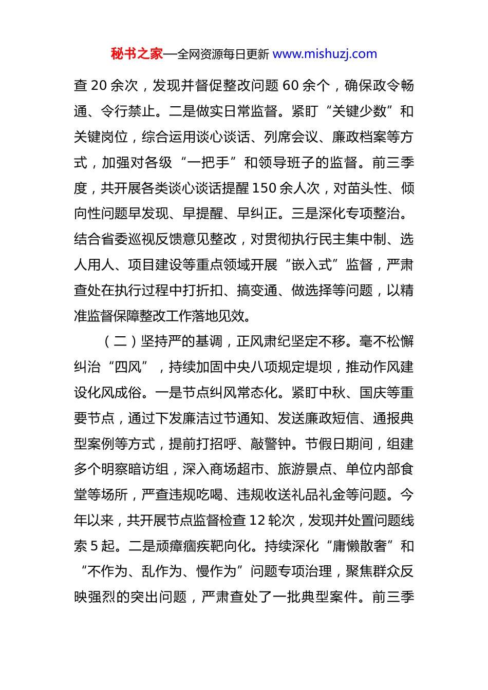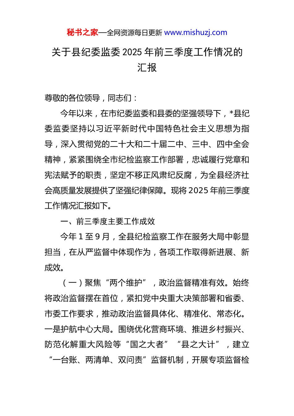 秘书之家—全网资源每日更新 www.mishuzj.com关于县纪委监委 2025 年前三季度工作情况的汇报 尊敬的各位领导,同志们:今年以来,在市纪委监委和县委的坚强领导下,*县纪委监委坚持以习近平新时代中国特色社会主义思想为指导,深入贯彻党的二十大和二十届二中、三中、四中全会精神,紧紧围绕全市纪检监察工作部署,忠诚履行党章和宪法赋予的职责,坚定不移正风肃纪反腐,为全县经济社会高质量发展提供了坚强纪律保障。现将 2025 年前三季度工作情况汇报如下。一、前三季度主要工作成效今年 1 至 9 月,全县纪检监察工作在服务大局中彰显担当,在从严监督中体现作为,各项工作取得新进展、新成效。(一)聚焦“两个维护”,政治监督精准有效。始终将政治监督摆在首位,紧扣党中央重大决策部署和省委、市委工作要求,推动政治监督具体化、精准化、常态化。一是护航中心大局。围绕优化营商环境、推进乡村振兴、防范化解重大风险等“国之大者”“县之大计”,建立“一台账、两清单、双问责”监督机制,开展专项监督检秘书之家—全网资源每日更新 www.mishuzj.com查 20 余次,发现并督促整改问题 60 余个,确保政令畅通、令行禁止。二是做实日常监督。紧盯“关键少数”和关键岗位,综合运用谈心谈话、列席会议、廉政档案等方式,加强对各级“一把手”和领导班子的监督。前三季度,共开展各类谈心谈话提醒 150 余人次,对苗头性、倾向性问题早发现、早提醒、早纠正。三是深化专项整治。结合省委巡视反馈意见整改,对贯彻执行民主集中制、选人用人、项目建设等重点领域开展“嵌入式”监督,严肃查处在执行过程中打折扣、搞变通、做选择等问题,以精准监督保障整改工作落地见效。(二)坚持严的基调,正风肃纪坚定不移。毫不松懈纠治“四风”,持续加固中央八项规定堤坝,推动作风建设化风成俗。一是节点纠风常态化。紧盯中秋、国庆等重要节点,通过下发廉洁过节通知、发送廉政短信、通报典型案例等方式,提前打招呼、敲警钟。节假日期间,组建多个明察暗访组,深入商场超市、旅游景点、单位内部食堂等场所,严查违规吃喝、违规收送礼品礼金等问题。今年以来,共开展节点监督检查 12 轮次,发现并处置问题线索 5 起。二是顽瘴痼疾靶向化。持续深化“庸懒散奢”和“不作为、乱作为、慢作为”问题专项治理,聚焦群众反映强烈的突出问题,严肃查处了一批典型案件。前三季秘书之家—全网资源每日更新 www.mishuzj.com度,共查处违规发放津贴补贴或福利问题 4 起,处理 6人;查处公车私用、私车公养问题 2 起,处理 3 人;严肃处理不作为、乱作为干部 11 人,有力整治了干部队伍中的歪风邪气。三是制度笼子严密化。深刻剖析“四风”问题产生的根源,协助县委出台了《*县关于进一步规范党员干部操办婚丧喜庆事宜的规定》《*县公务接待管理实施细则》等制度文件,从源头上堵塞漏洞,扎紧制度的笼子,推动作风建设常态长效。(三)保持高压态势,惩贪治腐一体推进。坚持有腐必反、有贪必肃,一体推进不敢腐、不能腐、不想腐,反腐败斗争压倒性胜利持续巩固深化。一是拓宽线索来源渠道。充分发挥信访举报主渠道作用,优化“信、访、网、电”四位一体举报平台,畅通群众监督渠道,并加强与巡察、审计、司法等部门的协作配合,建立问题线索移送和信息共享机制。1 至 9 月,全县纪检监察机关共接收信访举报 280 件次,处置问题线索 410 件。二是提升案件查办质效。严格按照规定程序和权限开展审查调查工作,建立办案流程限时报备和领导首审制度,对重大疑难复杂案件及时召开专题会议分析研判,确保每一起案件都经得起历史和人民的检验。前三季度,全县纪检监察机关共立案 115件,同比增长 8.5%;给予党纪政务处分 102 人,其中乡秘书之家—全网资源每日更新 www.mishuzj.com科级干部 18 人;采取留置措施 8 人,移送司法机关 7 人,高压震慑持续强化。三是做深做实“后半篇文章”。坚持查处一案、警示一片、治理一域。针对查办的重点领域案件,深入剖析发案原因和监管漏洞,向涉案单位发出纪检监察建议书 22 份,督促其建章立制、完善内控,实现“...