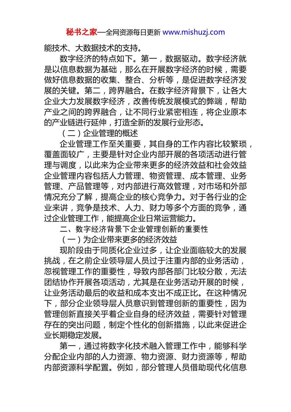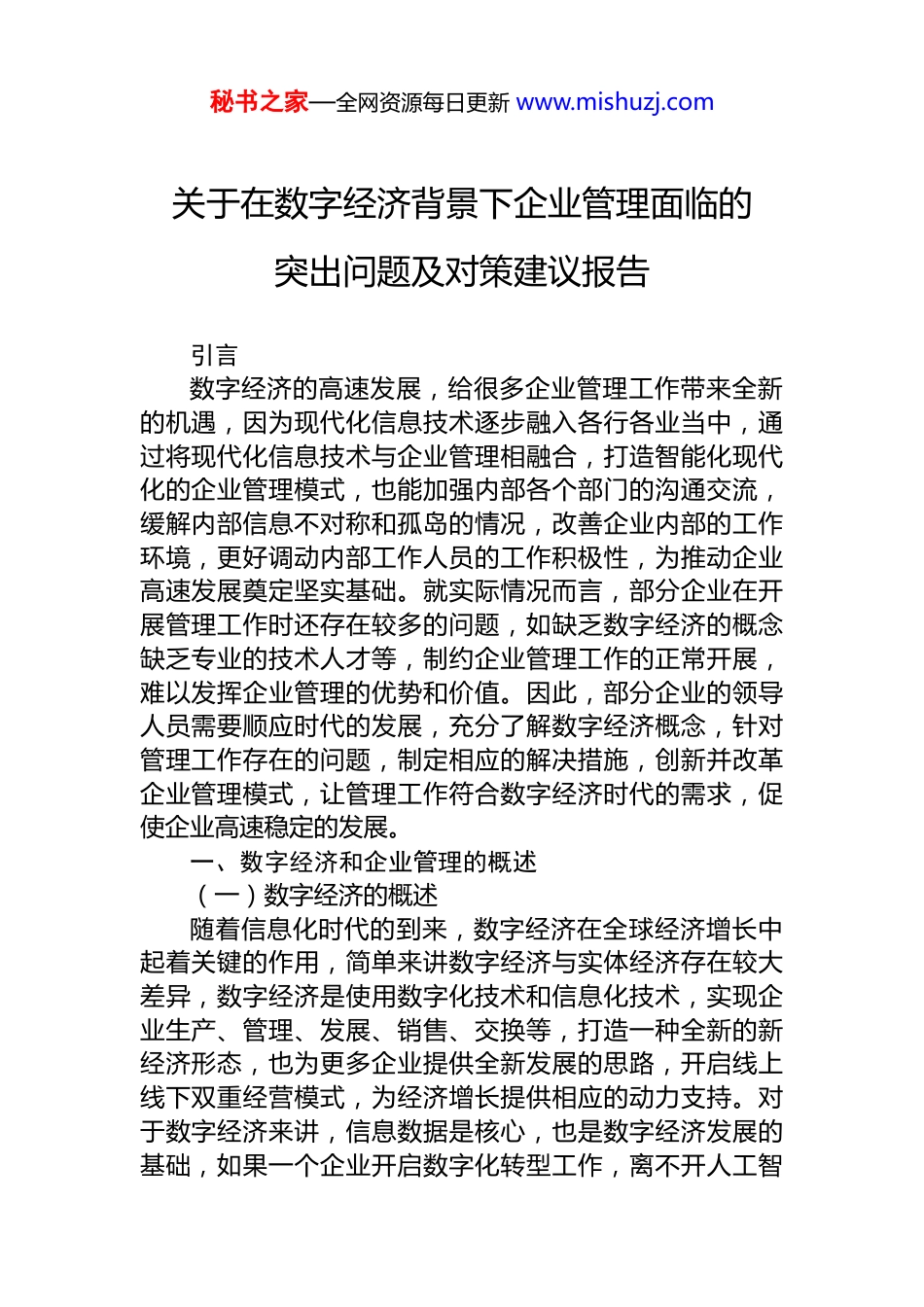 秘书之家—全网资源每日更新 www.mishuzj.com关于在数字经济背景下企业管理面临的突出问题及对策建议报告引言数字经济的高速发展,给很多企业管理工作带来全新的机遇,因为现代化信息技术逐步融入各行各业当中,通过将现代化信息技术与企业管理相融合,打造智能化现代化的企业管理模式,也能加强内部各个部门的沟通交流,缓解内部信息不对称和孤岛的情况,改善企业内部的工作环境,更好调动内部工作人员的工作积极性,为推动企业高速发展奠定坚实基础。就实际情况而言,部分企业在开展管理工作时还存在较多的问题,如缺乏数字经济的概念缺乏专业的技术人才等,制约企业管理工作的正常开展,难以发挥企业管理的优势和价值。因此,部分企业的领导人员需要顺应时代的发展,充分了解数字经济概念,针对管理工作存在的问题,制定相应的解决措施,创新并改革企业管理模式,让管理工作符合数字经济时代的需求,促使企业高速稳定的发展。一、数字经济和企业管理的概述(一)数字经济的概述随着信息化时代的到来,数字经济在全球经济增长中起着关键的作用,简单来讲数字经济与实体经济存在较大差异,数字经济是使用数字化技术和信息化技术,实现企业生产、管理、发展、销售、交换等,打造一种全新的新经济形态,也为更多企业提供全新发展的思路,开启线上线下双重经营模式,为经济增长提供相应的动力支持。对于数字经济来讲,信息数据是核心,也是数字经济发展的基础,如果一个企业开启数字化转型工作,离不开人工智秘书之家—全网资源每日更新 www.mishuzj.com能技术、大数据技术的支持。数字经济的特点如下。第一,数据驱动。数字经济就是以信息数据为基础,那么在开展数字经济的时候,需要做好信息数据的收集、整合、分析等,是促进数字经济发展的关键。第二,跨界融合。在数字经济背景下,让各大企业大力发展数字经济,改善传统发展模式的弊端,帮助产业之间的跨界融合,让不同行业紧密相连,将企业原本的产业链进行延伸,打造全新的发展行业形态。(二)企业管理的概述企业管理工作至关重要,其自身的工作内容比较繁琐,覆盖面较广,主要是针对企业内部开展的各项活动进行管理与调度,以此来为企业带来更多的经济效益和社会效益企业管理内容包括人力管理、物资管理、成本管理、业务管理、产品管理等,对内部进行高效管理,对市场和外部情况充分了解,提高企业的核心竞争力。对于各行业的企业来讲,竞争是技术、人力、财力等多个方面的竞争,通过企业管理工作,能提高企业日常运营能力。二、数字经济背景下企业管理创新的重要性(一)为企业带来更多的经济效益现阶段由于同质化企业过多,让企业面临较大的发展挑战,在之前企业领导层人员过于注重内部的业务活动,忽视管理工作的重要性,导致内部各部门比较分散,无法团结协作开展各项活动,尤其是在业务活动开展的时候,让业务活动最后的收益和成本支出不成正比。在这种情况下,部分企业领导层人员意识到管理创新的重要性,因为管理创新直接关乎着企业自身的经济效益,需要针对管理存在的突出问题,制定个性化的创新措施,以此来促进企业长期稳定发展。第一,通过将数字化技术融入管理工作中,能够科学分配企业内部的人力资源、物力资源、财力资源等,帮助内部资源科学配置。例如,部分管理人员借助现代化信息秘书之家—全网资源每日更新 www.mishuzj.com技术,打造人力资源管理信息化平台,定期对内部员工开展绩效考核工作,结合绩效考核的结果对员工的岗位进行调整。第二,通过创新企业内部的管理工作,能改善粗放式的管理理念,打造更加精细化的管理工作,在开展各项活动的时候,站在客户的角度进行思考,对市场的需求充分了解,不再生产同质化产品,而是不断创新与设计全新的产品,提高企业在市场上的份额,为企业带来更多的经济效益。(二)提高企业管理质量与效率对于各大企业来讲,都需要经历漫长的发展历程,管理工作在企业发展中起着辅助的作用,尤其是在市场竞争比较激烈的情况下,需要管理人员对市场情况充分了解,能及时发现市场的动态,帮助企业制定全新的发展战略。那么在开展管理工作时,若还在使用传统的管理理念,...