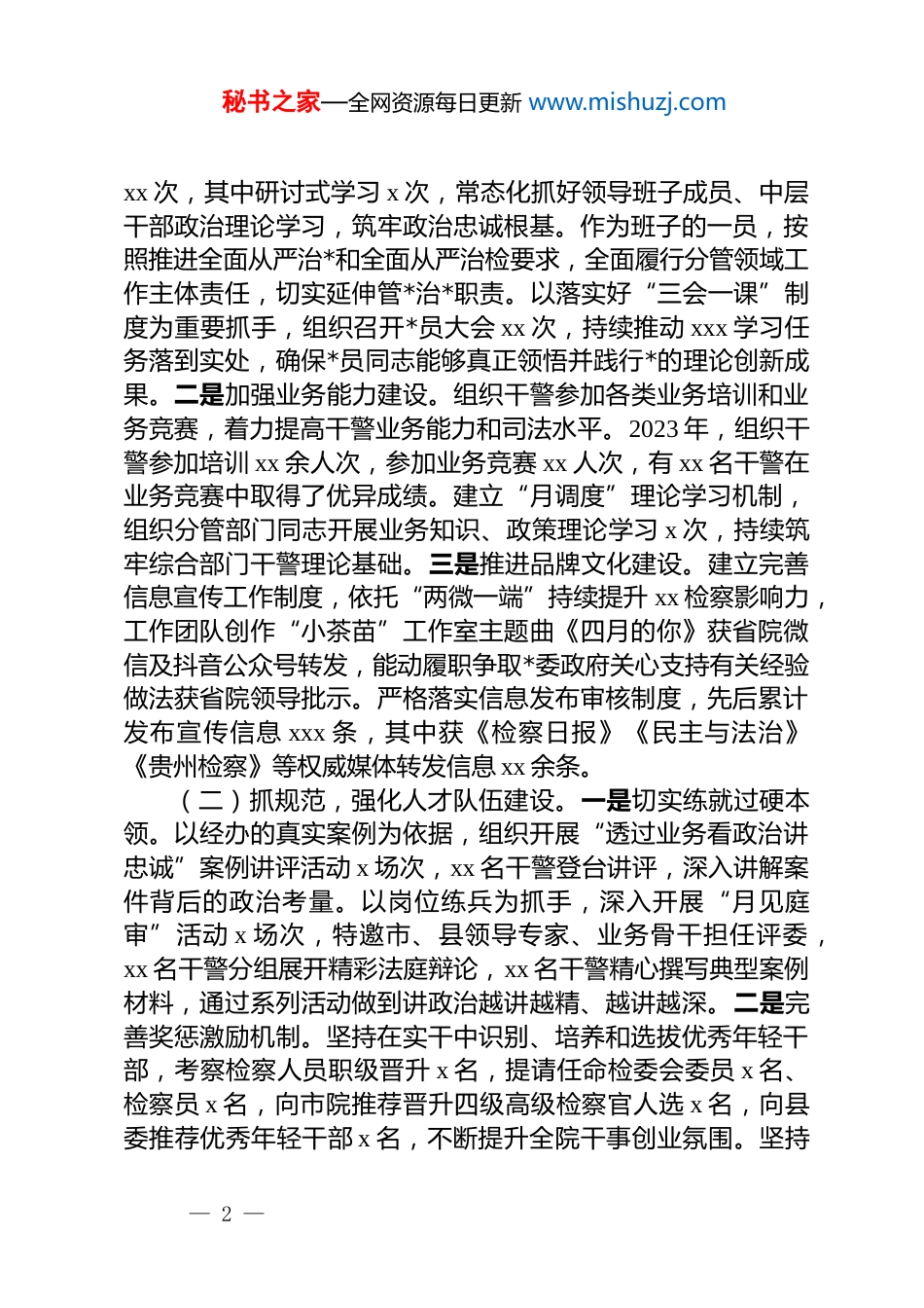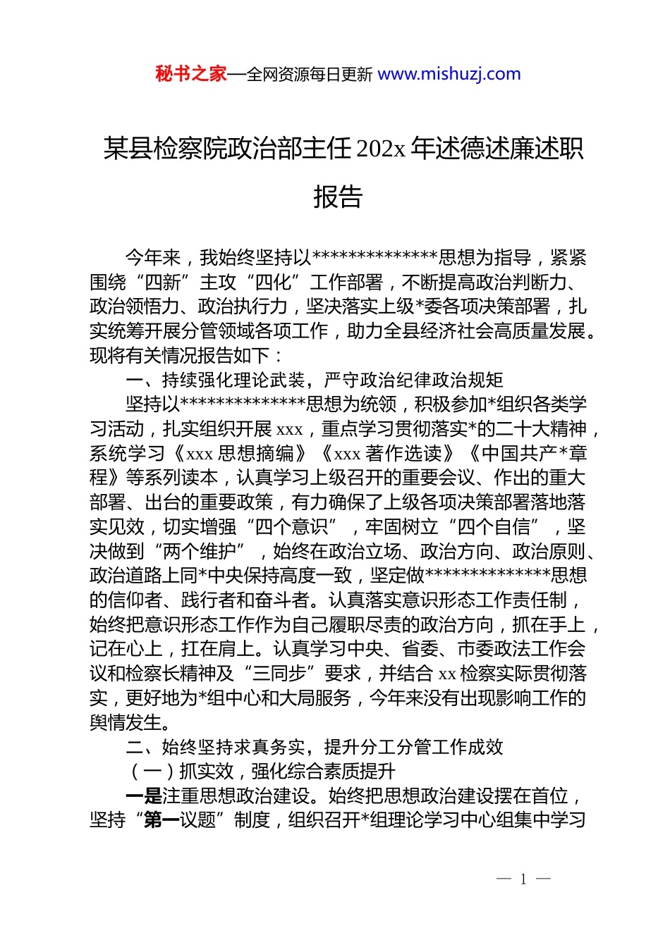 秘书之家—全网资源每日更新 www.mishuzj.com某县检察院政治部主任 202x 年述德述廉述职报告今年来,我始终坚持以**************思想为指导,紧紧围绕“四新”主攻“四化”工作部署,不断提高政治判断力、政治领悟力、政治执行力,坚决落实上级*委各项决策部署,扎实统筹开展分管领域各项工作,助力全县经济社会高质量发展。现将有关情况报告如下:一、持续强化理论武装,严守政治纪律政治规矩坚持以**************思想为统领,积极参加*组织各类学习活动,扎实组织开展 xxx,重点学习贯彻落实*的二十大精神,系统学习《xxx 思想摘编》《xxx 著作选读》《中国共产*章程》等系列读本,认真学习上级召开的重要会议、作出的重大部署、出台的重要政策,有力确保了上级各项决策部署落地落实见效,切实增强“四个意识”,牢固树立“四个自信”,坚决做到“两个维护”,始终在政治立场、政治方向、政治原则、政治道路上同*中央保持高度一致,坚定做**************思想的信仰者、践行者和奋斗者。认真落实意识形态工作责任制,始终把意识形态工作作为自己履职尽责的政治方向,抓在手上,记在心上,扛在肩上。认真学习中央、省委、市委政法工作会议和检察长精神及“三同步”要求,并结合 xx 检察实际贯彻落实,更好地为*组中心和大局服务,今年来没有出现影响工作的舆情发生。二、始终坚持求真务实,提升分工分管工作成效(一)抓实效,强化综合素质提升一是注重思想政治建设。始终把思想政治建设摆在首位,坚持“第一议题”制度,组织召开*组理论学习中心组集中学习— 1 —秘书之家—全网资源每日更新 www.mishuzj.comxx 次,其中研讨式学习 x 次,常态化抓好领导班子成员、中层干部政治理论学习,筑牢政治忠诚根基。作为班子的一员,按照推进全面从严治*和全面从严治检要求,全面履行分管领域工作主体责任,切实延伸管*治*职责。以落实好“三会一课”制度为重要抓手,组织召开*员大会 xx 次,持续推动 xxx 学习任务落到实处,确保*员同志能够真正领悟并践行*的理论创新成果。二是加强业务能力建设。组织干警参加各类业务培训和业务竞赛,着力提高干警业务能力和司法水平。2023 年,组织干警参加培训 xx 余人次,参加业务竞赛 xx 人次,有 xx 名干警在业务竞赛中取得了优异成绩。建立“月调度”理论学习机制,组织分管部门同志开展业务知识、政策理论学习 x 次,持续筑牢综合部门干警理论基础。三是推进品牌文化建设。建立完善信息宣传工作制度,依托“两微一端”持续提升 xx 检察影响力,工作团队创作“小茶苗”工作室主题曲《四月的你》获省院微信及抖音公众号转发,能动履职争取*委政府关心支持有关经验做法获省院领导批示。严格落实信息发布审核制度,先后累计发布宣传信息 xxx 条,其中获《检察日报》《民主与法治》《贵州检察》等权威媒体转发信息 xx 余条。(二)抓规范,强化人才队伍建设。一是切实练就过硬本领。以经办的真实案例为依据,组织开展“透过业务看政治讲忠诚”案例讲评活动 x 场次,xx 名干警登台讲评,深入讲解案件背后的政治考量。以岗位练兵为抓手,深入开展“月见庭审”活动 x 场次,特邀市、县领导专家、业务骨干担任评委,xx 名干警分组展开精彩法庭辩论,xx 名干警精心撰写典型案例材料,通过系列活动做到讲政治越讲越精、越讲越深。二是完善奖惩激励机制。坚持在实干中识别、培养和选拔优秀年轻干部,考察检察人员职级晋升 x 名,提请任命检委会委员 x 名、检察员 x 名,向市院推荐晋升四级高级检察官人选 x 名,向县委推荐优秀年轻干部 x 名,不断提升全院干事创业氛围。坚持— 2 —秘书之家—全网资源每日更新 www.mishuzj.com民主集中制,扎实组织开展司法绩效考核,通过民主投票、综合评分,评选“一等次”x 名、“二等次”xx 名、“三等次”x名,依照等次发放司法绩效,切实起到激励先进鞭策后进的目的。三是拓宽干部成长渠道。选派第一书记 x 名、驻村干部 x名、结对帮扶干部 xx 名,持续推动检察职能前移,积极办理国家司法救助案件 xx 件,发放救助金 xx 万元,在全力消除信访隐患...