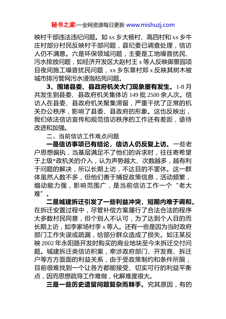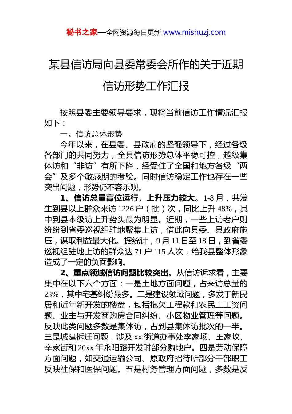 秘书之家—全网资源每日更新 www.mishuzj.com某县信访局向县委常委会所作的关于近期信访形势工作汇报按照县委主要领导要求,现将当前信访工作情况汇报如下:一、信访总体形势今年以来,在县委、县政府的坚强领导下,经过各级各部门的共同努力,全县信访形势总体平稳可控,越级集体访和“非访”有所下降,经受住了全国和地方各级“两会”及多个敏感期的考验。同时信访稳定工作也存在一些突出问题,形势仍不容乐观。1、信访总量高位运行,上升压力较大。1-8 月,共发生到县以上群众来访 1226 户(批)次,同比上升 48%,其中到县本级访上升势头最为明显。近期,一些上访老户则纷纷到省委巡视组驻地聚集上访,借此向县委、县政府施压,谋取利益最大化。据统计,9 月 11 日至 18 日,到省委巡视组驻地上访的群众达 71 户 115 人次,给我县整体形象造成了一定的负面影响。2、重点领域信访问题比较突出。从信访诉求看,主要集中在以下六个方面:一是土地方面问题,占来访总量的23%,其中宅基纠纷最多。二是建设领域问题,多发于新民居和近年新开发的楼盘,包括拖欠工程款和农民工工资问题、业主与开发商购房合同纠纷、小区物业管理等问题。反映此类问题多数是集体访,占到县集体访批次的一半。三是城建拆迁问题,涉及 xx 街道办事处李家场、王家坟、辛家街和 20xx 年永阳路开发时部分购地户。四是劳动保障方面问题,如交通运输公司、原政府招待所部分干部职工反映社保和医保问题。五是村务管理方面问题,多数是反秘书之家—全网资源每日更新 www.mishuzj.com映村干部违法违纪问题。如 xx 乡大杨村、高四村和 xx 乡牛庄村部分村民反映村干部问题,县纪委已调查处理,信访人仍不满意。六是环保领域问题,主要是工地噪音扰民、污水排放问题,如经济开发区大赵村王 x 等人反映御景园项目夜间施工噪音扰民问题,xx 乡东章村郑 x 反映其树木被城市排污管网污水浸泡枯死问题。3、围堵县委、县政府机关大门现象屡有发生。1-8 月共发生到县委、县政府机关集体访 149 批 2500 余人次。信访人在县委、县政府机关聚集滞留,严重干扰了正常的机关办公秩序,影响了县委、县政府的形象。这也反映出,我们依法信访宣传和规范信访秩序的工作还有差距,亟待改进和加强。二、当前信访工作难点问题一是信访事项已有结论,信访人仍反复上访。一些老户思想偏执,当基层满足不了他们的诉求时,往往寄希望于上级*政机关的介入,认为声势越大、次数越多,越有利于问题的解决,所以长期上访,不达目的不罢休。这一群体虽然人数不多,但他们善于捕捉政策信息,活动频繁,煽动能力强,影响范围广,是当前信访工作一个“老大难”。二是城建拆迁引发了一些利益冲突,短期内难于调和。在拆迁安置过程中,尽管补偿方案履行了合法合法的程序大多数村民同意,但个别人不认可,为了达到个人目的而长期上访,如李家场村李 x 等人。还有一些是因为当时政府部门工作失误或疏漏,给部分群众造成了损失。如汪某反映 2002 年永阳路开发时购买的商业地块至今未拆迁交付问题。城建拆迁类信访积案,牵涉政府部门、开发商、拆迁户等方方面面的利益关系,由于受政策制约和条件所限,目前很难找到一个让各方都能接受、切实可行的利益平衡点,因而思想疏导工作难做,化解难度很大。三是一些历史遗留问题复杂而棘手。究其原因,有的秘书之家—全网资源每日更新 www.mishuzj.com是诉求过高,无法实现,久而久之,成为了遗留问题。如xx 镇韩村张 xx 反映孙女(聋哑人)十年前受到了别人性侵害,当时是事发后几个月才报的案,公安部门无法取证,张便反映公安部门不作为,要求将犯罪嫌疑人绳之以法。因为于法无据,公安部门始终满足不了张的诉求。有的是时间跨度长,如 xx 乡姚庄村姚 x 反映 70 年代末在市社系统工作时待遇问题,当时已有结论。现在信访人又提供不出新的证据,加之也没有相关政策,处理起来无处下手。有的是政策发生了变化。如职教中心中专班部分退费生反映待遇问题,虽有一定道理,但不符合政策,根本无法实现诸如此类的问题很多。四是向上协调运作的难度越来越大。在越级集体...