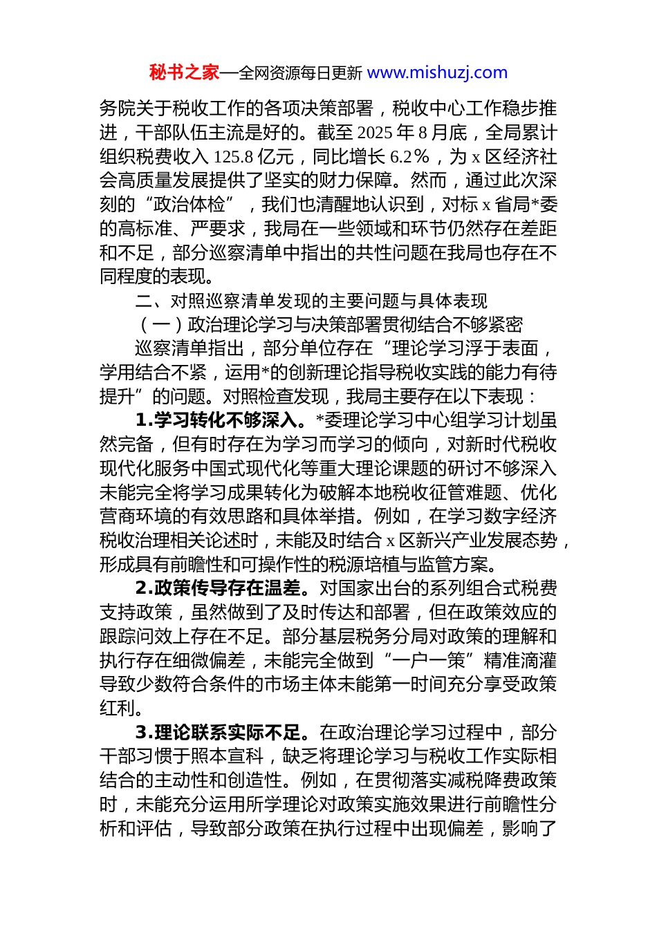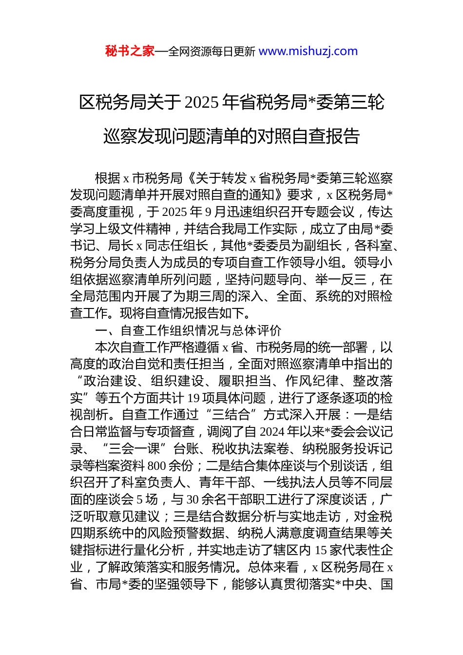 秘书之家—全网资源每日更新 www.mishuzj.com区税务局关于 2025 年省税务局*委第三轮巡察发现问题清单的对照自查报告根据 x 市税务局《关于转发 x 省税务局*委第三轮巡察发现问题清单并开展对照自查的通知》要求,x 区税务局*委高度重视,于 2025 年 9 月迅速组织召开专题会议,传达学习上级文件精神,并结合我局工作实际,成立了由局*委书记、局长 x 同志任组长,其他*委委员为副组长,各科室、税务分局负责人为成员的专项自查工作领导小组。领导小组依据巡察清单所列问题,坚持问题导向、举一反三,在全局范围内开展了为期三周的深入、全面、系统的对照检查工作。现将自查情况报告如下。一、自查工作组织情况与总体评价本次自查工作严格遵循 x 省、市税务局的统一部署,以高度的政治自觉和责任担当,全面对照巡察清单中指出的“政治建设、组织建设、履职担当、作风纪律、整改落实”等五个方面共计 19 项具体问题,进行了逐条逐项的检视剖析。自查工作通过“三结合”方式深入开展:一是结合日常监督与专项督查,调阅了自 2024 年以来*委会会议记录、“三会一课”台账、税收执法案卷、纳税服务投诉记录等档案资料 800 余份;二是结合集体座谈与个别谈话,组织召开了科室负责人、青年干部、一线执法人员等不同层面的座谈会 5 场,与 30 余名干部职工进行了深度谈话,广泛听取意见建议;三是结合数据分析与实地走访,对金税四期系统中的风险预警数据、纳税人满意度调查结果等关键指标进行量化分析,并实地走访了辖区内 15 家代表性企业,了解政策落实和服务情况。总体来看,x 区税务局在 x省、市局*委的坚强领导下,能够认真贯彻落实*中央、国秘书之家—全网资源每日更新 www.mishuzj.com务院关于税收工作的各项决策部署,税收中心工作稳步推进,干部队伍主流是好的。截至 2025 年 8 月底,全局累计组织税费收入 125.8 亿元,同比增长 6.2%,为 x 区经济社会高质量发展提供了坚实的财力保障。然而,通过此次深刻的“政治体检”,我们也清醒地认识到,对标 x 省局*委的高标准、严要求,我局在一些领域和环节仍然存在差距和不足,部分巡察清单中指出的共性问题在我局也存在不同程度的表现。二、对照巡察清单发现的主要问题与具体表现(一)政治理论学习与决策部署贯彻结合不够紧密巡察清单指出,部分单位存在“理论学习浮于表面,学用结合不紧,运用*的创新理论指导税收实践的能力有待提升”的问题。对照检查发现,我局主要存在以下表现:1.学习转化不够深入。*委理论学习中心组学习计划虽然完备,但有时存在为学习而学习的倾向,对新时代税收现代化服务中国式现代化等重大理论课题的研讨不够深入未能完全将学习成果转化为破解本地税收征管难题、优化营商环境的有效思路和具体举措。例如,在学习数字经济税收治理相关论述时,未能及时结合 x 区新兴产业发展态势,形成具有前瞻性和可操作性的税源培植与监管方案。2.政策传导存在温差。对国家出台的系列组合式税费支持政策,虽然做到了及时传达和部署,但在政策效应的跟踪问效上存在不足。部分基层税务分局对政策的理解和执行存在细微偏差,未能完全做到“一户一策”精准滴灌导致少数符合条件的市场主体未能第一时间充分享受政策红利。3.理论联系实际不足。在政治理论学习过程中,部分干部习惯于照本宣科,缺乏将理论学习与税收工作实际相结合的主动性和创造性。例如,在贯彻落实减税降费政策时,未能充分运用所学理论对政策实施效果进行前瞻性分析和评估,导致部分政策在执行过程中出现偏差,影响了秘书之家—全网资源每日更新 www.mishuzj.com政策目标的实现。4.学习机制有待完善。目前的学习机制更多侧重于形式上的完成,而对学习效果的考核和反馈机制尚不健全。缺乏对学习成果的定期检验和评估,导致部分干部在学习过程中存在敷衍了事的现象,未能真正将政治理论学习入脑入心,进而影响了决策部署的贯彻执行效果。(二)基层*组织战斗堡垒作用发挥不充分巡察清单指出,个别基层*组织存在“dj 与业务‘两张皮’现象,组织生活不够规范,*员先锋模范作用发挥不明显”的问题。对照检查...