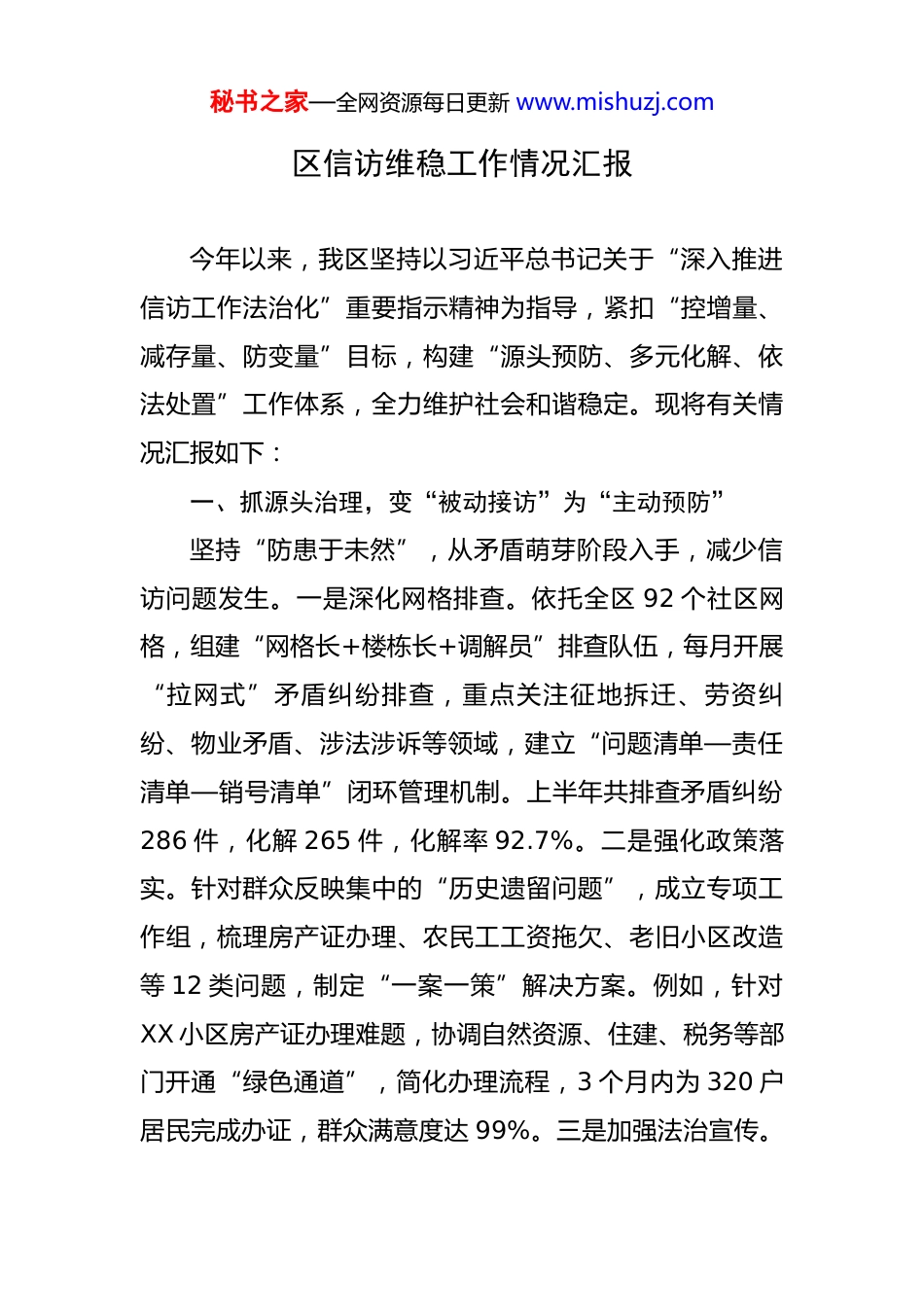 秘书之家—全网资源每日更新 www.mishuzj.com区信访维稳工作情况汇报 今年以来,我区坚持以习近平总书记关于“深入推进信访工作法治化”重要指示精神为指导,紧扣“控增量、减存量、防变量”目标,构建“源头预防、多元化解、依法处置”工作体系,全力维护社会和谐稳定。现将有关情况汇报如下:一、抓源头治理,变“被动接访”为“主动预防”坚持“防患于未然”,从矛盾萌芽阶段入手,减少信访问题发生。一是深化网格排查。依托全区 92 个社区网格,组建“网格长+楼栋长+调解员”排查队伍,每月开展“拉网式”矛盾纠纷排查,重点关注征地拆迁、劳资纠纷、物业矛盾、涉法涉诉等领域,建立“问题清单—责任清单—销号清单”闭环管理机制。上半年共排查矛盾纠纷286 件,化解 265 件,化解率 92.7%。二是强化政策落实。针对群众反映集中的“历史遗留问题”,成立专项工作组,梳理房产证办理、农民工工资拖欠、老旧小区改造等 12 类问题,制定“一案一策”解决方案。例如,针对XX 小区房产证办理难题,协调自然资源、住建、税务等部门开通“绿色通道”,简化办理流程,3 个月内为 320 户居民完成办证,群众满意度达 99%。三是加强法治宣传。秘书之家—全网资源每日更新 www.mishuzj.com开展“信访法治进社区”活动,通过法治讲座、案例展播、发放宣传手册等形式,普及《信访工作条例》等法律法规,引导群众“依法信访、理性维权”。上半年举办宣传活动 20 场,覆盖群众 6000 余人次,越级访、重复访同比分别下降 20%、25%。二、抓多元化解,变“单一调解”为“协同作战”整合资源力量,构建“人民调解、行政调解、司法调解”联动格局,提升矛盾化解质效。一是建强调解平台。依托区社会治理综合服务中心,设立“信访接待、劳动仲裁、法律援助、心理疏导”等 10 个功能窗口,推行“一站式受理、全流程服务、多部门联动”,上半年受理群众诉求 1500 件,办结 1450 件,办结率 96.7%,平均办理时长缩短至 10 天。二是培育专业队伍。组建“律师+心理咨询师+行业专家”调解团队,针对婚姻家庭、邻里纠纷、劳动争议等常见问题,提供“个性化”调解服务;在建筑、餐饮、物业等行业成立 15 个专业调解委员会,上半年化解行业纠纷 108 件,成功率 92%。三是推动“数字赋能”。开发“网上信访平台”和“信访 APP”,实现诉求提交、进度查询、结果反馈“一网通办”,上半年网上信访占比达70%,群众“少跑腿、多办事”的获得感显著增强。三、抓重点攻坚,变“积案难案”为“案结事了”秘书之家—全网资源每日更新 www.mishuzj.com聚焦“钉子案”“骨头案”,集中力量攻坚,全力维护群众合法权益。一是领导包案促化解。实行“区级领导包案+责任单位主抓+信访部门督办”机制,对 18 件重点信访积案实行“一案一专班”,明确包案领导、化解时限和责任要求,定期召开调度会,听取进展汇报,协调解决问题。目前,15 件已化解,3 件取得实质性突破,化解率达 83%。二是依法处置树权威。对极少数缠访闹访、以访施压、扰乱社会秩序的行为,联合公安、司法部门依法处理,上半年训诫教育 15 人,行政拘留 4 人,形成“有理有序信访受保护、无理取闹必追责”的鲜明导向。三是暖心帮扶减存量。对生活困难的信访群众,落实“救助+帮扶”措施,协调民政、人社、教育等部门解决低保、就业、子女入学等问题 28 件,既解“事结”又解“心结”,从根本上减少重复访和越级访。下一步,我们将始终站稳群众立场,以“时时放心不下”的责任感和“事事落实到位”的执行力,重点抓好三方面工作:一是深化源头治理,完善矛盾排查化解机制;二是强化多元共治,提升矛盾化解效能;三是压实工作责任,推动信访工作法治化,为我区高质量发展营造和谐稳定的社会环境。