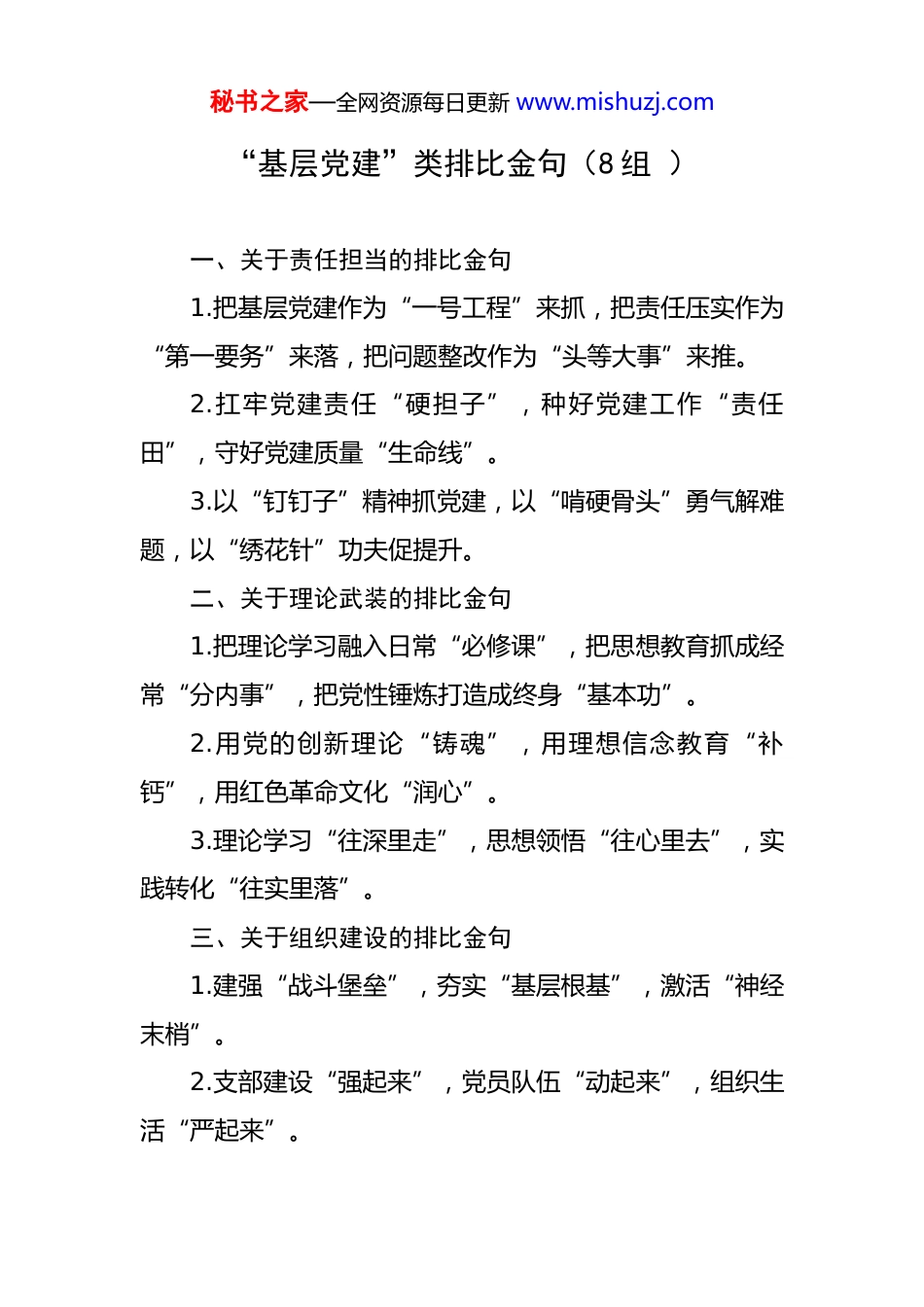 秘书之家—全网资源每日更新 www.mishuzj.com“基层党建”类排比金句(8 组 )一、关于责任担当的排比金句1.把基层党建作为“一号工程”来抓,把责任压实作为“第一要务”来落,把问题整改作为“头等大事”来推。2.扛牢党建责任“硬担子”,种好党建工作“责任田”,守好党建质量“生命线”。3.以“钉钉子”精神抓党建,以“啃硬骨头”勇气解难题,以“绣花针”功夫促提升。二、关于理论武装的排比金句1.把理论学习融入日常“必修课”,把思想教育抓成经常“分内事”,把党性锤炼打造成终身“基本功”。2.用党的创新理论“铸魂”,用理想信念教育“补钙”,用红色革命文化“润心”。3.理论学习“往深里走”,思想领悟“往心里去”,实践转化“往实里落”。三、关于组织建设的排比金句1.建强“战斗堡垒”,夯实“基层根基”,激活“神经末梢”。2.支部建设“强起来”,党员队伍“动起来”,组织生活“严起来”。秘书之家—全网资源每日更新 www.mishuzj.com3.优化组织设置“织密网”,强化班子建设“选强将”,提升支部活力“增动能”。四、关于服务群众的排比金句1.把群众需求作为“风向标”,把群众满意作为“试金石”,把群众福祉作为“落脚点”。2.沉下身子“访民情”,迈开步子“解民忧”,甩开膀子“办实事”。3.服务群众“零距离”,解决问题“零推诿”,关爱帮扶“零遗漏”。五、关于创新发展的排比金句1.以“数字党建”破局,以“品牌党建”提质,以“融合党建”增效。2.创新载体“搭平台”,创新机制“激活力”,创新方法“解新题”。3.用“新思维”谋划党建,用“新举措”推动党建,用“新成效”检验党建。六、关于党员作用的排比金句1.让党员“亮身份”,让党旗“飘起来”,让党徽“闪起来”。2.党员带头“冲在前”,党员示范“干在先”,党员引领“作表率”。秘书之家—全网资源每日更新 www.mishuzj.com3.关键时刻“站得出”,危急关头“豁得出”,平常时候“看得出来”。七、关于作风建设的排比金句1.严抓作风“治庸”,严管纪律“治懒”,严格考核“治散”。2.作风建设“常态化”,纪律约束“长效化”,监督问责“制度化”。3.杜绝“走过场”的形式主义,破除“做样子”的官僚主义,摒弃“混日子”的消极心态。八、关于融合发展的排比金句1.党建与乡村振兴“同频”,党建与基层治理“共振”,党建与产业发展“联动”。2.把党建融入发展“全链条”,把党建嵌入治理“各环节”,把党建植入服务“全过程”。3.以党建引领发展“加速度”,以发展检验党建“含金量”,以治理彰显党建“战斗力”。