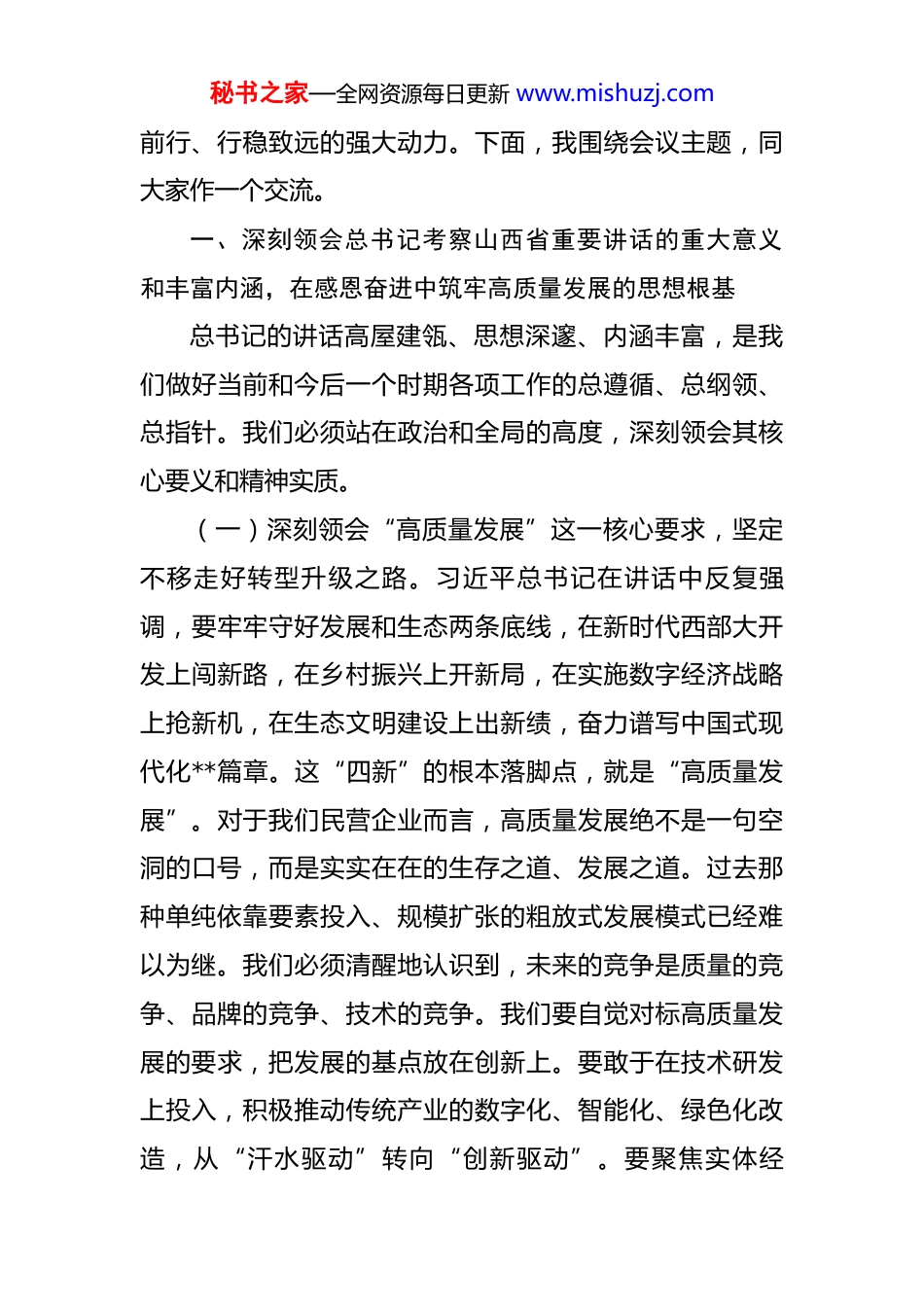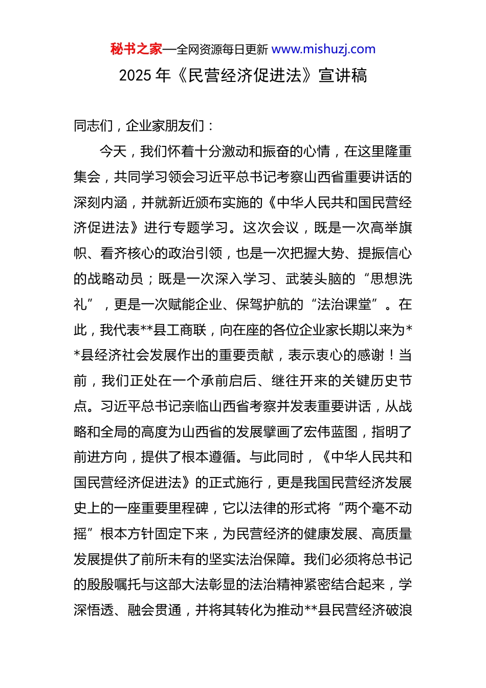秘书之家—全网资源每日更新 www.mishuzj.com2025 年《民营经济促进法》宣讲稿 同志们,企业家朋友们:今天,我们怀着十分激动和振奋的心情,在这里隆重集会,共同学习领会习近平总书记考察山西省重要讲话的深刻内涵,并就新近颁布实施的《中华人民共和国民营经济促进法》进行专题学习。这次会议,既是一次高举旗帜、看齐核心的政治引领,也是一次把握大势、提振信心的战略动员;既是一次深入学习、武装头脑的“思想洗礼”,更是一次赋能企业、保驾护航的“法治课堂”。在此,我代表**县工商联,向在座的各位企业家长期以来为**县经济社会发展作出的重要贡献,表示衷心的感谢!当前,我们正处在一个承前启后、继往开来的关键历史节点。习近平总书记亲临山西省考察并发表重要讲话,从战略和全局的高度为山西省的发展擘画了宏伟蓝图,指明了前进方向,提供了根本遵循。与此同时,《中华人民共和国民营经济促进法》的正式施行,更是我国民营经济发展史上的一座重要里程碑,它以法律的形式将“两个毫不动摇”根本方针固定下来,为民营经济的健康发展、高质量发展提供了前所未有的坚实法治保障。我们必须将总书记的殷殷嘱托与这部大法彰显的法治精神紧密结合起来,学深悟透、融会贯通,并将其转化为推动**县民营经济破浪秘书之家—全网资源每日更新 www.mishuzj.com前行、行稳致远的强大动力。下面,我围绕会议主题,同大家作一个交流。一、深刻领会总书记考察山西省重要讲话的重大意义和丰富内涵,在感恩奋进中筑牢高质量发展的思想根基总书记的讲话高屋建瓴、思想深邃、内涵丰富,是我们做好当前和今后一个时期各项工作的总遵循、总纲领、总指针。我们必须站在政治和全局的高度,深刻领会其核心要义和精神实质。(一)深刻领会“高质量发展”这一核心要求,坚定不移走好转型升级之路。习近平总书记在讲话中反复强调,要牢牢守好发展和生态两条底线,在新时代西部大开发上闯新路,在乡村振兴上开新局,在实施数字经济战略上抢新机,在生态文明建设上出新绩,奋力谱写中国式现代化**篇章。这“四新”的根本落脚点,就是“高质量发展”。对于我们民营企业而言,高质量发展绝不是一句空洞的口号,而是实实在在的生存之道、发展之道。过去那种单纯依靠要素投入、规模扩张的粗放式发展模式已经难以为继。我们必须清醒地认识到,未来的竞争是质量的竞争、品牌的竞争、技术的竞争。我们要自觉对标高质量发展的要求,把发展的基点放在创新上。要敢于在技术研发上投入,积极推动传统产业的数字化、智能化、绿色化改造,从“汗水驱动”转向“创新驱动”。要聚焦实体经秘书之家—全网资源每日更新 www.mishuzj.com济,坚守主业、做强实业,努力在各自的领域内打造一批“专精特新”企业,培育一批拥有核心竞争力的“百年老店”。特别是要大力发展现代山地特色高效农业,将我们的资源禀赋转化为产业优势和经济优势,在服务国家粮食安全和重要农产品供给中展现**作为。(二)深刻领会“深化改革开放”这一根本路径,在优化环境中激发市场主体活力。总书记指出,要坚持以改革开放为动力,推动发展。这为我们破除体制机制障碍、持续优化营商环境提供了行动指南。民营经济是市场经济中最具活力的组成部分,其活力的源泉就在于公平的竞争环境和高效的服务体系。近年来,我们县在优化营商环境方面做了大量工作,但与企业家的期望相比,与先进地区相比,仍有提升空间。我们要以总书记重要讲话精神为指引,坚定不移地推进市场化改革,全面落实市场准入负面清单制度,确保民营企业能够依法平等进入法律未禁止的行业和领域。政府部门要持续深化“放管服”改革,当好服务企业的“店小二”,主动靠前服务,精准解决企业在项目审批、土地供应、融资用工等方面的急难愁盼问题。我们工商联作为党和政府联系民营经济人士的桥梁纽带,更要发挥好作用,积极构建亲清政商关系,畅通政企沟通渠道,及时反映企业诉求,维护企业合法权益,让广大企业家在**县放心投资、安心经营、专心创业。秘书之家—全网资源每日更新 www.mishuzj.com(三)深刻领会“绿色发展”这一鲜明底色,在生态文明建设中抢占未来发展制高点。...