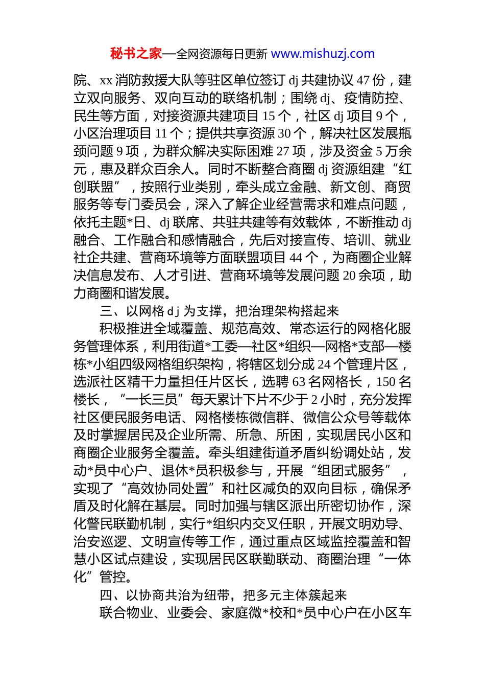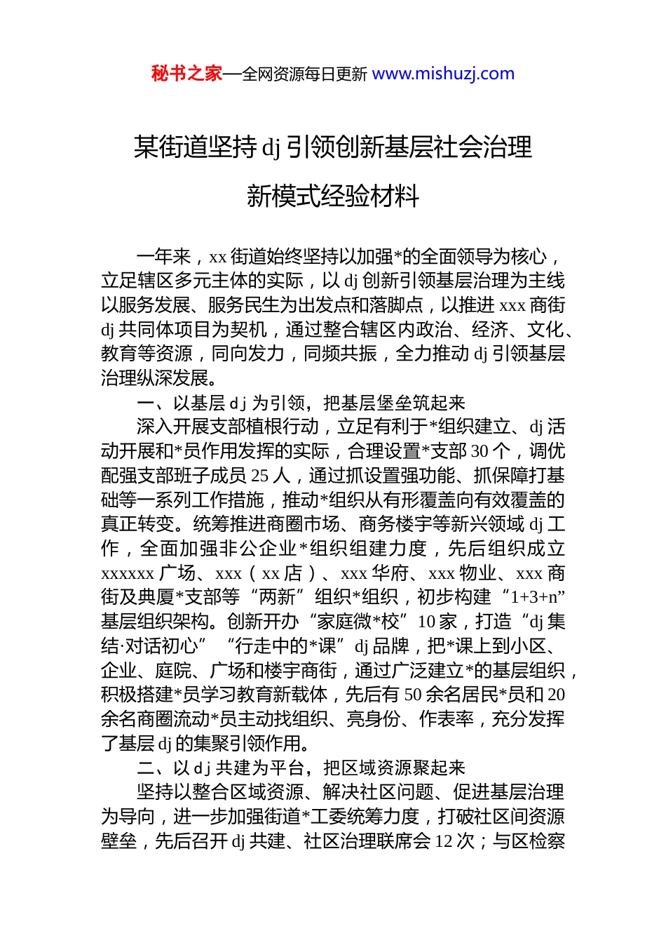 秘书之家—全网资源每日更新 www.mishuzj.com某街道坚持 dj 引领创新基层社会治理新模式经验材料一年来,xx 街道始终坚持以加强*的全面领导为核心,立足辖区多元主体的实际,以 dj 创新引领基层治理为主线以服务发展、服务民生为出发点和落脚点,以推进 xxx 商街dj 共同体项目为契机,通过整合辖区内政治、经济、文化、教育等资源,同向发力,同频共振,全力推动 dj 引领基层治理纵深发展。一、以基层 dj 为引领,把基层堡垒筑起来深入开展支部植根行动,立足有利于*组织建立、dj 活动开展和*员作用发挥的实际,合理设置*支部 30 个,调优配强支部班子成员 25 人,通过抓设置强功能、抓保障打基础等一系列工作措施,推动*组织从有形覆盖向有效覆盖的真正转变。统筹推进商圈市场、商务楼宇等新兴领域 dj 工作,全面加强非公企业*组织组建力度,先后组织成立xxxxxx 广场、xxx(xx 店)、xxx 华府、xxx 物业、xxx 商街及典厦*支部等“两新”组织*组织,初步构建“1+3+n”基层组织架构。创新开办“家庭微*校”10 家,打造“dj 集结·对话初心”“行走中的*课”dj 品牌,把*课上到小区、企业、庭院、广场和楼宇商街,通过广泛建立*的基层组织,积极搭建*员学习教育新载体,先后有 50 余名居民*员和 20余名商圈流动*员主动找组织、亮身份、作表率,充分发挥了基层 dj 的集聚引领作用。二、以 dj 共建为平台,把区域资源聚起来坚持以整合区域资源、解决社区问题、促进基层治理为导向,进一步加强街道*工委统筹力度,打破社区间资源壁垒,先后召开 dj 共建、社区治理联席会 12 次;与区检察秘书之家—全网资源每日更新 www.mishuzj.com院、xx 消防救援大队等驻区单位签订 dj 共建协议 47 份,建立双向服务、双向互动的联络机制;围绕 dj、疫情防控、民生等方面,对接资源共建项目 15 个,社区 dj 项目 9 个,小区治理项目 11 个;提供共享资源 30 个,解决社区发展瓶颈问题 9 项,为群众解决实际困难 27 项,涉及资金 5 万余元,惠及群众百余人。同时不断整合商圈 dj 资源组建“红创联盟”,按照行业类别,牵头成立金融、新文创、商贸服务等专门委员会,深入了解企业经营需求和难点问题,依托主题*日、dj 联席、共驻共建等有效载体,不断推动 dj融合、工作融合和感情融合,先后对接宣传、培训、就业社企共建、营商环境等方面联盟项目 44 个,为商圈企业解决信息发布、人才引进、营商环境等发展问题 20 余项,助力商圈和谐发展。三、以网格 dj 为支撑,把治理架构搭起来积极推进全域覆盖、规范高效、常态运行的网格化服务管理体系,利用街道*工委—社区*组织—网格*支部—楼栋*小组四级网格组织架构,将辖区划分成 24 个管理片区,选派社区精干力量担任片区长,选聘 63 名网格长,150 名楼长,“一长三员”每天累计下片不少于 2 小时,充分发挥社区便民服务电话、网格楼栋微信群、微信公众号等载体及时掌握居民及企业所需、所急、所困,实现居民小区和商圈企业服务全覆盖。牵头组建街道矛盾纠纷调处站,发动*员中心户、退休*员积极参与,开展“组团式服务”,实现了“高效协同处置”和社区减负的双向目标,确保矛盾及时化解在基层。同时加强与辖区派出所密切协作,深化警民联勤机制,实行*组织内交叉任职,开展文明劝导、治安巡逻、文明宣传等工作,通过重点区域监控覆盖和智慧小区试点建设,实现居民区联勤联动、商圈治理“一体化”管控。四、以协商共治为纽带,把多元主体簇起来联合物业、业委会、家庭微*校和*员中心户在小区车秘书之家—全网资源每日更新 www.mishuzj.com库、居民家中、景观凉亭设立小区睦邻点 16 个,并按照各自特点开展不同的活动,如棋牌室、相亲角、亲子教育等架起了政府与居民之间、居委与居民之间、居民与居民之间的“和谐之桥”,同时居民可通过睦邻点内的意见建议反映簿将自己的意见建议进行登记,由睦邻点负责人进行统一汇总报给社区。充分发挥区住建、城管、公安、市场监督、人社、司法等部门职能作用,实行社区“接单”、街道“转单”或“做单”工作流程,建立并推行“社...