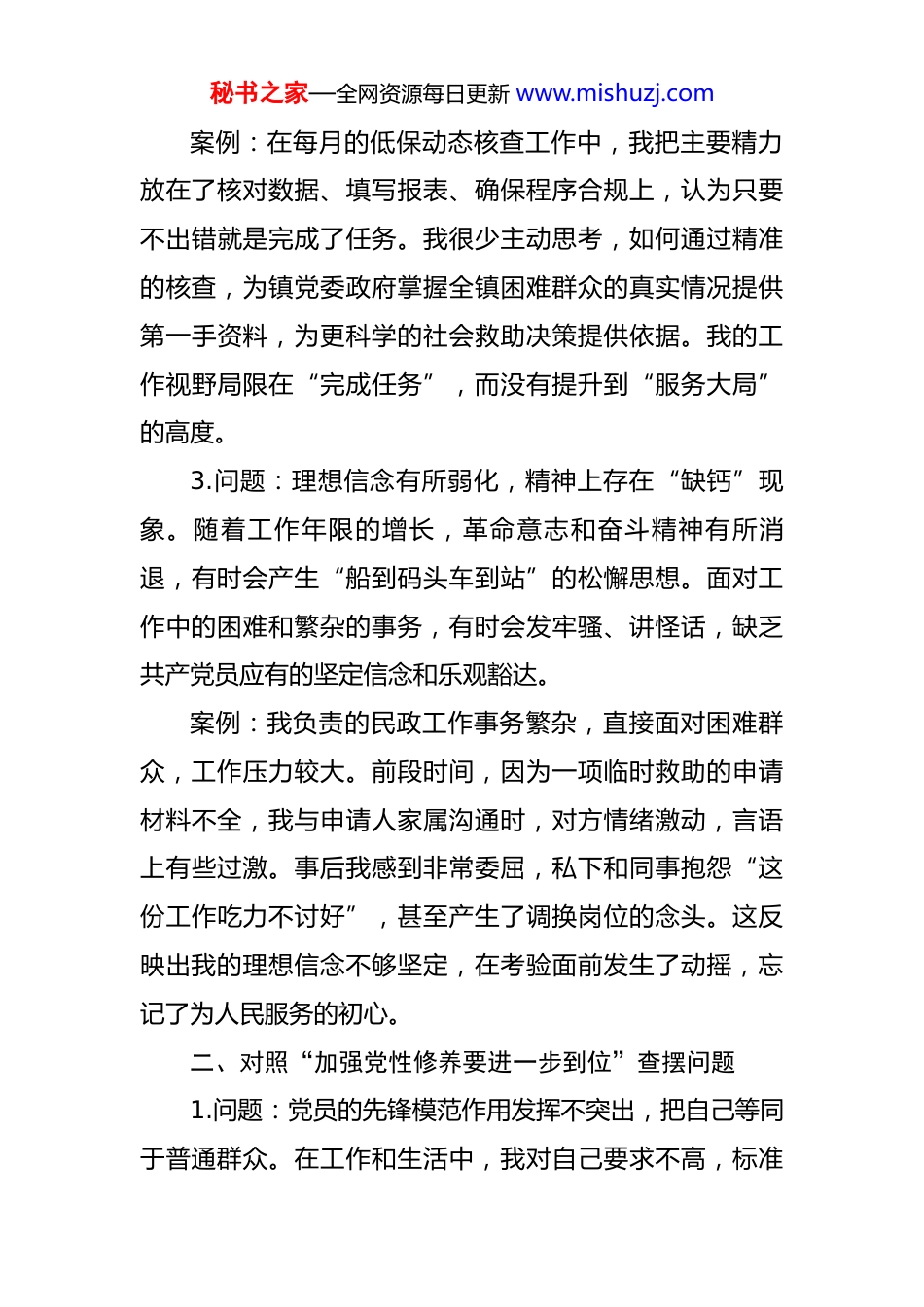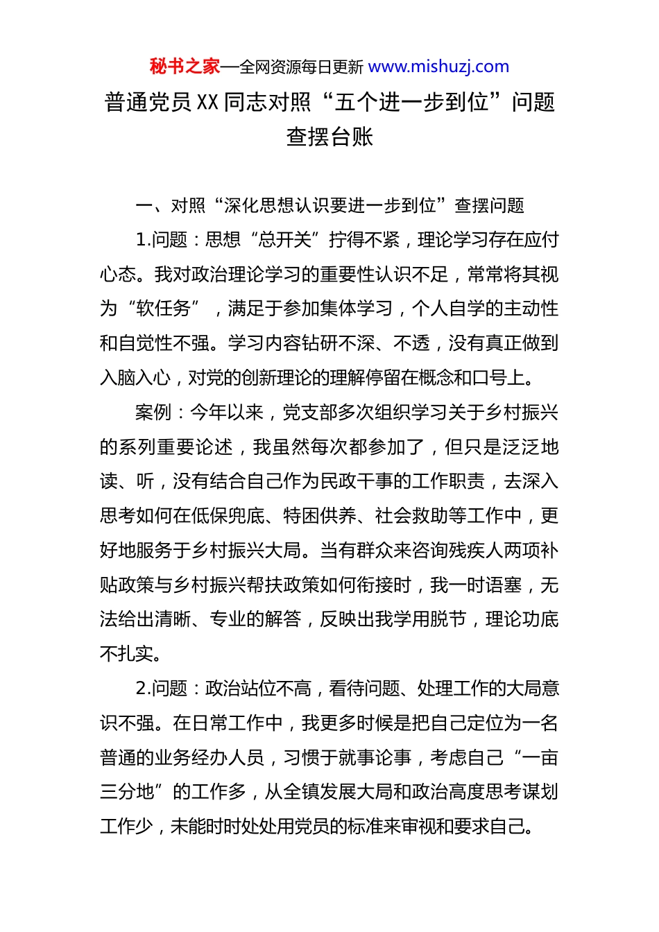 秘书之家—全网资源每日更新 www.mishuzj.com普通党员 XX 同志对照“五个进一步到位”问题查摆台账 一、对照“深化思想认识要进一步到位”查摆问题1.问题:思想“总开关”拧得不紧,理论学习存在应付心态。我对政治理论学习的重要性认识不足,常常将其视为“软任务”,满足于参加集体学习,个人自学的主动性和自觉性不强。学习内容钻研不深、不透,没有真正做到入脑入心,对党的创新理论的理解停留在概念和口号上。案例:今年以来,党支部多次组织学习关于乡村振兴的系列重要论述,我虽然每次都参加了,但只是泛泛地读、听,没有结合自己作为民政干事的工作职责,去深入思考如何在低保兜底、特困供养、社会救助等工作中,更好地服务于乡村振兴大局。当有群众来咨询残疾人两项补贴政策与乡村振兴帮扶政策如何衔接时,我一时语塞,无法给出清晰、专业的解答,反映出我学用脱节,理论功底不扎实。2.问题:政治站位不高,看待问题、处理工作的大局意识不强。在日常工作中,我更多时候是把自己定位为一名普通的业务经办人员,习惯于就事论事,考虑自己“一亩三分地”的工作多,从全镇发展大局和政治高度思考谋划工作少,未能时时处处用党员的标准来审视和要求自己。秘书之家—全网资源每日更新 www.mishuzj.com案例:在每月的低保动态核查工作中,我把主要精力放在了核对数据、填写报表、确保程序合规上,认为只要不出错就是完成了任务。我很少主动思考,如何通过精准的核查,为镇党委政府掌握全镇困难群众的真实情况提供第一手资料,为更科学的社会救助决策提供依据。我的工作视野局限在“完成任务”,而没有提升到“服务大局”的高度。3.问题:理想信念有所弱化,精神上存在“缺钙”现象。随着工作年限的增长,革命意志和奋斗精神有所消退,有时会产生“船到码头车到站”的松懈思想。面对工作中的困难和繁杂的事务,有时会发牢骚、讲怪话,缺乏共产党员应有的坚定信念和乐观豁达。案例:我负责的民政工作事务繁杂,直接面对困难群众,工作压力较大。前段时间,因为一项临时救助的申请材料不全,我与申请人家属沟通时,对方情绪激动,言语上有些过激。事后我感到非常委屈,私下和同事抱怨“这份工作吃力不讨好”,甚至产生了调换岗位的念头。这反映出我的理想信念不够坚定,在考验面前发生了动摇,忘记了为人民服务的初心。二、对照“加强党性修养要进一步到位”查摆问题1.问题:党员的先锋模范作用发挥不突出,把自己等同于普通群众。在工作和生活中,我对自己要求不高,标准秘书之家—全网资源每日更新 www.mishuzj.com不严,有时忘记了自己是一名共产党员,未能时刻以党员的先进性来激励自己。在完成本职工作之外,参与集体活动、服务群众的积极性、主动性不足。案例:去年冬天,镇里组织党员干部进行扫雪除冰活动。我虽然也参加了,但只是完成了自己负责的区域,看到有些区域人手不足、积雪很厚时,我想的是“反正有其他人负责”,没有主动上前帮忙。活动结束后便立刻回家,没有体现出党员应有的“冲在前、干在先”的模范带头作用,实际上是把自己混同于一名普通群众。2.问题:开展批评和自我批评不够坦诚,存在“闯关”思想。在参加组织生活会时,我进行自我批评往往是“穿靴戴帽”,讲一些放之四海而皆准的空话套话,对自己思想深处、工作细节上的问题,不敢揭短亮丑。对同志进行批评时,也多是“隔靴搔痒”,怕得罪人,没有起到帮助同志、增进团结的效果。案例:在最近一次党小组会上,我对自己的剖析是“服务群众的水平有待提高”,但没有具体说明是在哪个环节、哪件事情上服务不好,根源是什么。在给同事提意见时,我明明知道他在接待群众时有时态度生硬,但我说的却是“希望你以后和群众沟通时更有耐心”,话说得很委婉,没有点到痛处,完全没有达到“红脸出汗”的效果。秘书之家—全网资源每日更新 www.mishuzj.com3.问题:党性锻炼的主动性不足,组织纪律观念有所淡化。我对于参加党内政治生活,有时存在被动应付的思想,未能将其作为加强党性锻炼、提高政治觉悟的重要途径。对党的组织纪律,虽然没有公然违反,但在一些细节上要求不严,比如党费有时会忘记主动缴纳...
