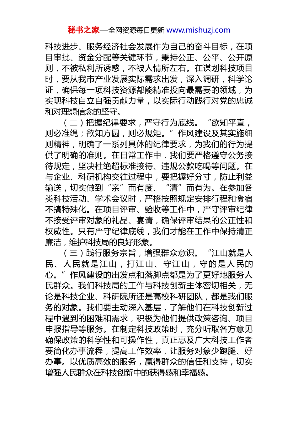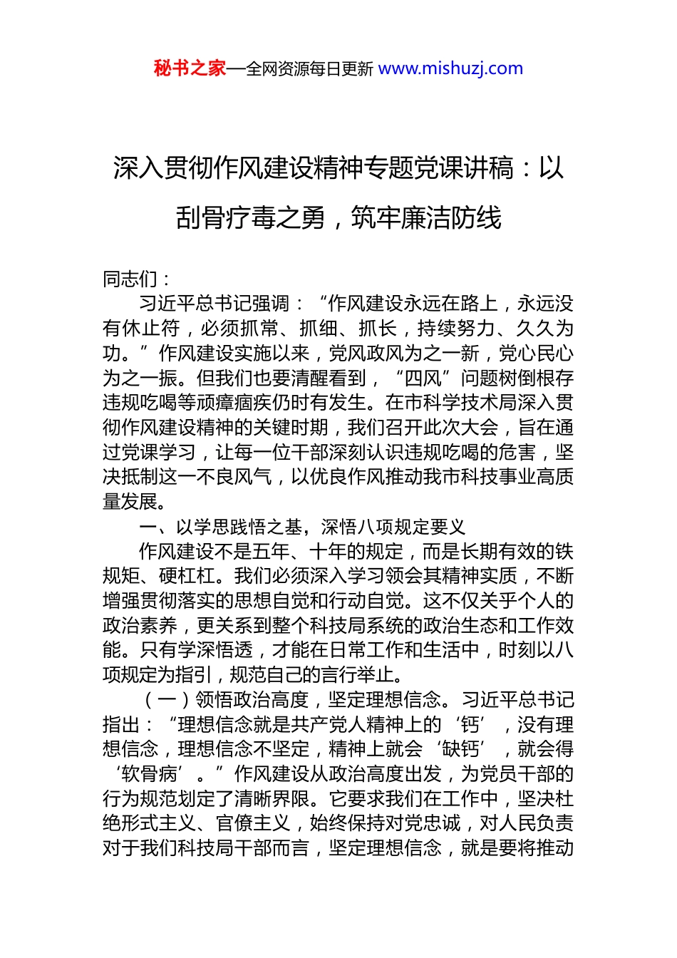 秘书之家—全网资源每日更新 www.mishuzj.com深入贯彻作风建设精神专题党课讲稿:以刮骨疗毒之勇,筑牢廉洁防线同志们:习近平总书记强调:“作风建设永远在路上,永远没有休止符,必须抓常、抓细、抓长,持续努力、久久为功。”作风建设实施以来,党风政风为之一新,党心民心为之一振。但我们也要清醒看到,“四风”问题树倒根存违规吃喝等顽瘴痼疾仍时有发生。在市科学技术局深入贯彻作风建设精神的关键时期,我们召开此次大会,旨在通过党课学习,让每一位干部深刻认识违规吃喝的危害,坚决抵制这一不良风气,以优良作风推动我市科技事业高质量发展。一、以学思践悟之基,深悟八项规定要义作风建设不是五年、十年的规定,而是长期有效的铁规矩、硬杠杠。我们必须深入学习领会其精神实质,不断增强贯彻落实的思想自觉和行动自觉。这不仅关乎个人的政治素养,更关系到整个科技局系统的政治生态和工作效能。只有学深悟透,才能在日常工作和生活中,时刻以八项规定为指引,规范自己的言行举止。(一)领悟政治高度,坚定理想信念。习近平总书记指出:“理想信念就是共产党人精神上的‘钙’,没有理想信念,理想信念不坚定,精神上就会‘缺钙’,就会得‘软骨病’。”作风建设从政治高度出发,为党员干部的行为规范划定了清晰界限。它要求我们在工作中,坚决杜绝形式主义、官僚主义,始终保持对党忠诚,对人民负责对于我们科技局干部而言,坚定理想信念,就是要将推动秘书之家—全网资源每日更新 www.mishuzj.com科技进步、服务经济社会发展作为自己的奋斗目标,在项目审批、资金分配等关键环节,秉持公正、公平、公开原则,不被私利所诱惑,不被人情所左右。在谋划科技项目时,要从我市产业发展实际需求出发,深入调研,科学论证,确保每一项科技资源都能精准投向最需要的领域,为实现科技自立自强贡献力量,以实际行动践行对党的忠诚和对理想信念的坚守。(二)把握纪律要求,严守行为底线。“欲知平直,则必准绳;欲知方圆,则必规矩。”作风建设及其实施细则精神,明确了一系列具体的纪律要求,为我们的行为提供了明确的准则。在日常工作中,我们要严格遵守公务接待规定,坚决杜绝超标准接待、违规公款吃喝等问题。在与企业、科研机构交往过程中,要把握好分寸,防止利益输送,切实做到“亲”而有度、“清”而有为。在参加各类科技活动、学术会议时,严格按照规定安排行程和食宿不搞特殊化。在项目评审、验收等工作中,严守评审纪律不接受评审对象的礼品、宴请,确保评审结果的公正性和权威性。只有严守纪律底线,我们才能在工作中保持清正廉洁,维护科技局的良好形象。(三)践行服务宗旨,增强群众意识。“江山就是人民、人民就是江山,打江山、守江山,守的是人民的心。”作风建设的出发点和落脚点都是为了更好地服务人民群众。我们科技局的工作与科技创新主体密切相关,无论是科技企业、科研院所还是高校科研团队,都是我们服务的对象。我们要主动深入基层,了解他们在科技创新过程中遇到的困难和需求,积极为他们提供政策咨询、项目申报指导等服务。在制定科技政策时,充分听取各方意见确保政策的科学性和可操作性,真正惠及广大科技工作者要简化办事流程,提高工作效率,让服务对象少跑腿、好办事。以优质高效的服务,赢得群众的信任和支持,切实增强人民群众在科技创新中的获得感和幸福感。秘书之家—全网资源每日更新 www.mishuzj.com(四)弘扬优良作风,树立良好形象。作风彰显形象,作风关乎事业成败。作风建设倡导的是一种求真务实、艰苦奋斗的优良作风。我们科技局干部要继承和发扬这种作风,在工作中真抓实干,勇于担当。面对科技创新中的难题,要敢于啃“硬骨头”,积极探索解决方案。在推动重大科技项目实施过程中,要深入一线,加强协调调度,确保项目顺利推进。在科技成果转化工作中,要积极搭建平台,促进产学研深度融合,让更多的科技成果转化为现实生产力。同时,要保持艰苦奋斗的本色,反对铺张浪费,合理使用科技经费,将每一分钱都用在刀刃上。以良好的作风,树立科技局干部的良好形象,为科技创新营造风清气正的环境。二、以典型案例为鉴,洞察违规...