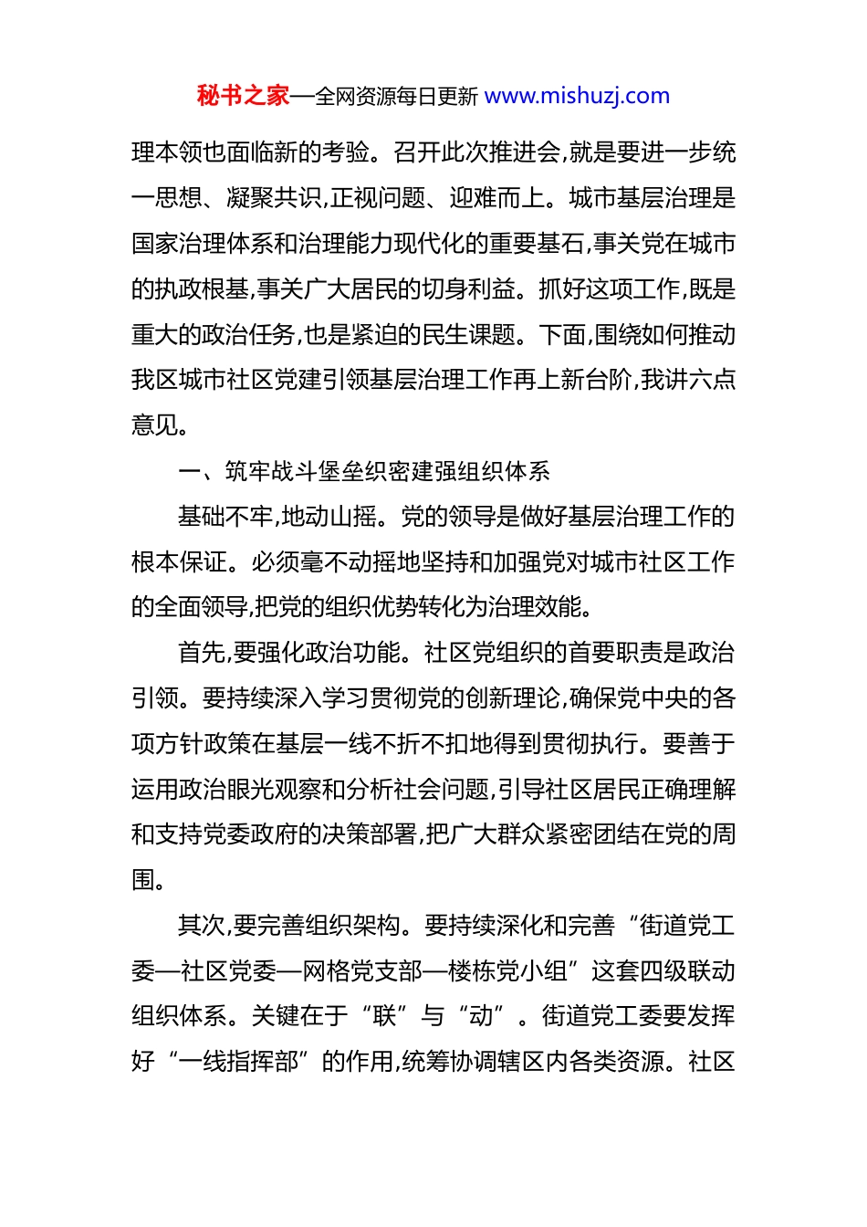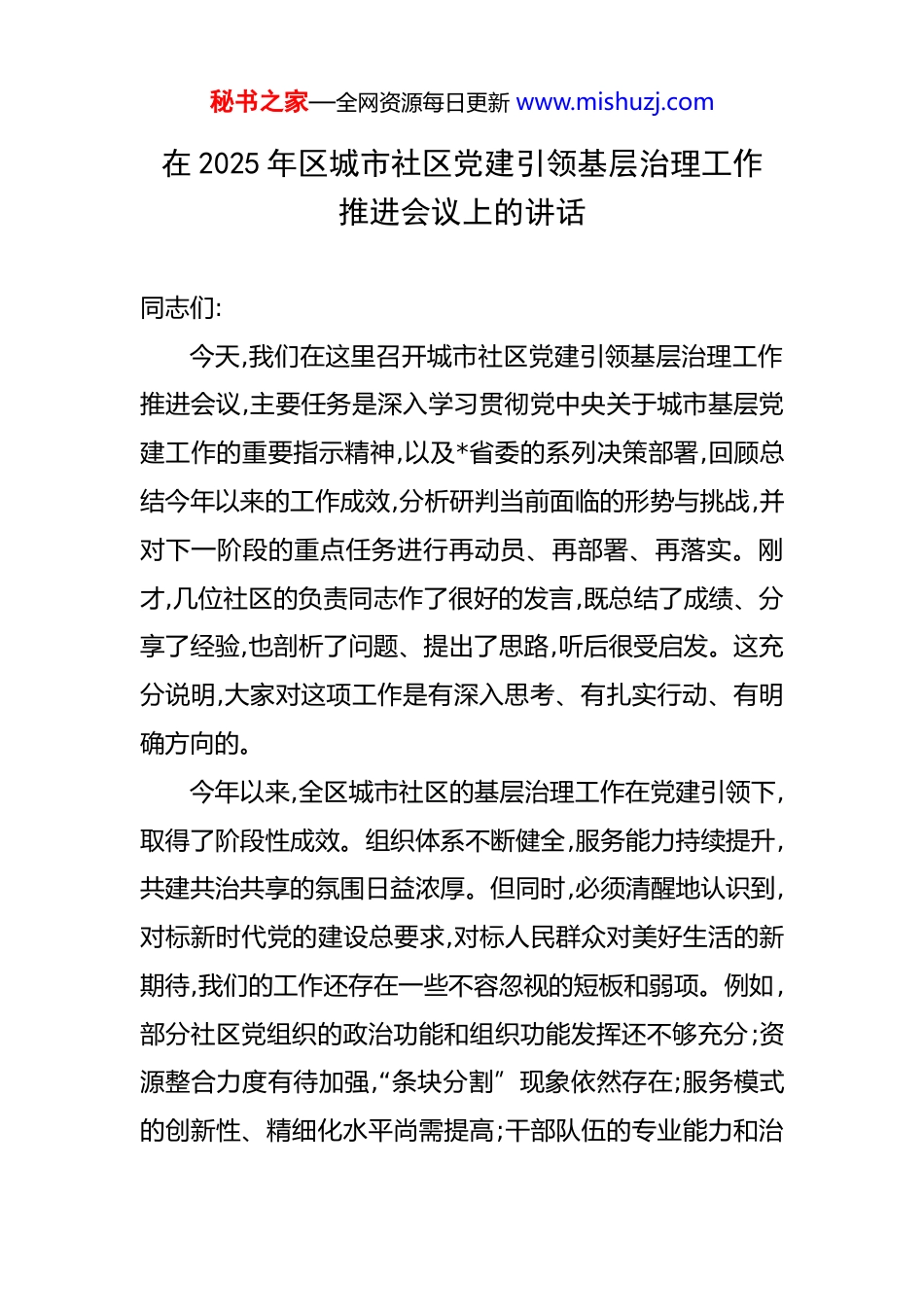 秘书之家—全网资源每日更新 www.mishuzj.com在 2025 年区城市社区党建引领基层治理工作推进会议上的讲话 同志们:今天,我们在这里召开城市社区党建引领基层治理工作推进会议,主要任务是深入学习贯彻党中央关于城市基层党建工作的重要指示精神,以及*省委的系列决策部署,回顾总结今年以来的工作成效,分析研判当前面临的形势与挑战,并对下一阶段的重点任务进行再动员、再部署、再落实。刚才,几位社区的负责同志作了很好的发言,既总结了成绩、分享了经验,也剖析了问题、提出了思路,听后很受启发。这充分说明,大家对这项工作是有深入思考、有扎实行动、有明确方向的。今年以来,全区城市社区的基层治理工作在党建引领下,取得了阶段性成效。组织体系不断健全,服务能力持续提升,共建共治共享的氛围日益浓厚。但同时,必须清醒地认识到,对标新时代党的建设总要求,对标人民群众对美好生活的新期待,我们的工作还存在一些不容忽视的短板和弱项。例如,部分社区党组织的政治功能和组织功能发挥还不够充分;资源整合力度有待加强,“条块分割”现象依然存在;服务模式的创新性、精细化水平尚需提高;干部队伍的专业能力和治秘书之家—全网资源每日更新 www.mishuzj.com理本领也面临新的考验。召开此次推进会,就是要进一步统一思想、凝聚共识,正视问题、迎难而上。城市基层治理是国家治理体系和治理能力现代化的重要基石,事关党在城市的执政根基,事关广大居民的切身利益。抓好这项工作,既是重大的政治任务,也是紧迫的民生课题。下面,围绕如何推动我区城市社区党建引领基层治理工作再上新台阶,我讲六点意见。一、筑牢战斗堡垒织密建强组织体系基础不牢,地动山摇。党的领导是做好基层治理工作的根本保证。必须毫不动摇地坚持和加强党对城市社区工作的全面领导,把党的组织优势转化为治理效能。首先,要强化政治功能。社区党组织的首要职责是政治引领。要持续深入学习贯彻党的创新理论,确保党中央的各项方针政策在基层一线不折不扣地得到贯彻执行。要善于运用政治眼光观察和分析社会问题,引导社区居民正确理解和支持党委政府的决策部署,把广大群众紧密团结在党的周围。其次,要完善组织架构。要持续深化和完善“街道党工委—社区党委—网格党支部—楼栋党小组”这套四级联动组织体系。关键在于“联”与“动”。街道党工委要发挥好“一线指挥部”的作用,统筹协调辖区内各类资源。社区秘书之家—全网资源每日更新 www.mishuzj.com党委要当好“主心骨”,把党的领导贯穿于社区建设和治理的各方面、全过程。网格党支部要成为“前沿阵地”,确保党的组织和工作第一时间延伸到居民家门口。楼栋党小组则要成为“神经末梢”,及时感知民情、传递党的声音。要确保到 2025 年底,全区所有符合条件的居民小区、商业楼宇党的组织覆盖率达到 100%,工作覆盖动态清零。最后,要提升组织能力。社区党组织的能力,最终要体现在领导基层治理、团结动员群众、推动改革发展的实际成效上。要定期开展组织生活,严格执行“三会一课”制度,增强党内政治生活的政治性、时代性、原则性、战斗性。要通过主题党日、组织生活会等形式,围绕社区治理的难点、痛点问题,组织党员开展讨论、献计献策,真正把社区党组织建设成为坚强有力的战斗堡垒。二、凝聚治理合力构建多元共治格局现代城市治理是一个复杂的系统工程,单靠社区自身的力量远远不够,必须树立系统思维,构建起一个区域统筹、条块协同、上下联动、共建共享的治理新格局。第一,要做实“大工委”“大党委”机制。这个机制不是挂个名、开个会,而是要实现实质性的融合联动。社区党组织要主动担当起“轴心”作用,积极与辖区内的机关、企事业单位、社会组织等建立常态化沟通协调机制。要推动秘书之家—全网资源每日更新 www.mishuzj.com驻区单位党组织切实履行“双报到”职责,不仅仅是党员个人来报到,更要推动单位的组织资源、服务资源、文化资源向社区开放共享。要探索建立需求、资源、项目“三张清单”,实现社区“点单”、单位“派单”、党员“接单”的精准对接,共同解决停车难、环境整治、扶老助残等一批群众急难愁盼问题。第二,要激发社会力量参与活力。要积极培育和引导社会组织、志...