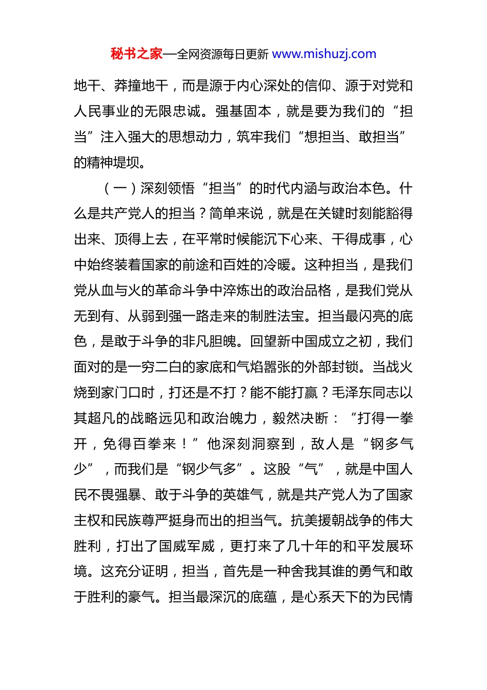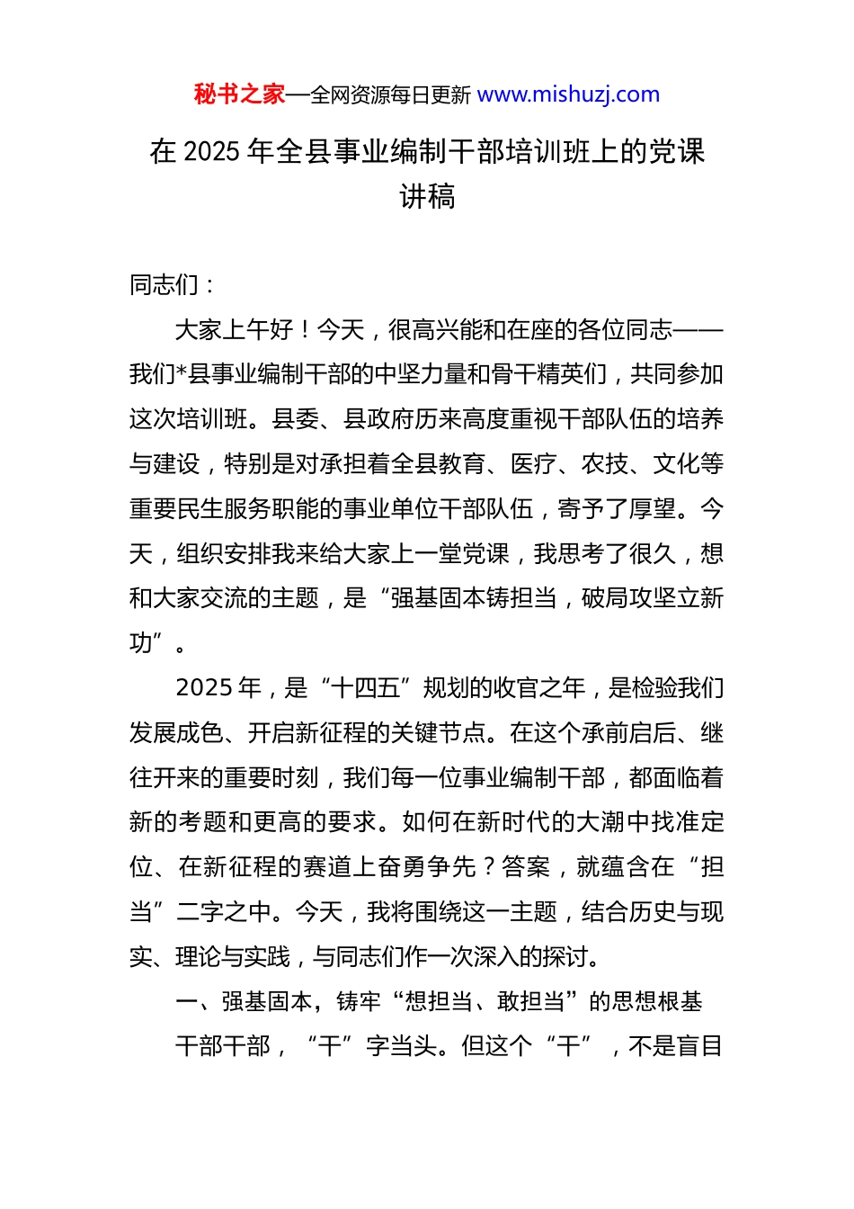 秘书之家—全网资源每日更新 www.mishuzj.com在 2025 年全县事业编制干部培训班上的党课讲稿 同志们:大家上午好!今天,很高兴能和在座的各位同志——我们*县事业编制干部的中坚力量和骨干精英们,共同参加这次培训班。县委、县政府历来高度重视干部队伍的培养与建设,特别是对承担着全县教育、医疗、农技、文化等重要民生服务职能的事业单位干部队伍,寄予了厚望。今天,组织安排我来给大家上一堂党课,我思考了很久,想和大家交流的主题,是“强基固本铸担当,破局攻坚立新功”。2025 年,是“十四五”规划的收官之年,是检验我们发展成色、开启新征程的关键节点。在这个承前启后、继往开来的重要时刻,我们每一位事业编制干部,都面临着新的考题和更高的要求。如何在新时代的大潮中找准定位、在新征程的赛道上奋勇争先?答案,就蕴含在“担当”二字之中。今天,我将围绕这一主题,结合历史与现实、理论与实践,与同志们作一次深入的探讨。一、强基固本,铸牢“想担当、敢担当”的思想根基干部干部,“干”字当头。但这个“干”,不是盲目秘书之家—全网资源每日更新 www.mishuzj.com地干、莽撞地干,而是源于内心深处的信仰、源于对党和人民事业的无限忠诚。强基固本,就是要为我们的“担当”注入强大的思想动力,筑牢我们“想担当、敢担当”的精神堤坝。(一)深刻领悟“担当”的时代内涵与政治本色。什么是共产党人的担当?简单来说,就是在关键时刻能豁得出来、顶得上去,在平常时候能沉下心来、干得成事,心中始终装着国家的前途和百姓的冷暖。这种担当,是我们党从血与火的革命斗争中淬炼出的政治品格,是我们党从无到有、从弱到强一路走来的制胜法宝。担当最闪亮的底色,是敢于斗争的非凡胆魄。回望新中国成立之初,我们面对的是一穷二白的家底和气焰嚣张的外部封锁。当战火烧到家门口时,打还是不打?能不能打赢?毛泽东同志以其超凡的战略远见和政治魄力,毅然决断:“打得一拳开,免得百拳来!”他深刻洞察到,敌人是“钢多气少”,而我们是“钢少气多”。这股“气”,就是中国人民不畏强暴、敢于斗争的英雄气,就是共产党人为了国家主权和民族尊严挺身而出的担当气。抗美援朝战争的伟大胜利,打出了国威军威,更打来了几十年的和平发展环境。这充分证明,担当,首先是一种舍我其谁的勇气和敢于胜利的豪气。担当最深沉的底蕴,是心系天下的为民情秘书之家—全网资源每日更新 www.mishuzj.com怀。北宋名臣范仲淹,一生坎坷,却始终坚守“先天下之忧而忧,后天下之乐而乐”的政治抱负。他出身贫寒,早年丧父,饱尝人间疾苦,这段经历让他对百姓的艰难有着切肤之痛。入仕后,他因直言敢谏、触动权贵利益,在短短七年内三遭贬谪。每一次被贬,对他而言都是一次政治上的重挫,但每一次磨难,都让他更加贴近底层、洞悉民情。他没有消沉,反而把被贬之地当作践行理想的战场,所到之处,修水利、办学堂、救灾荒,把抽象的“忧乐”情怀,转化为老百姓看得见、摸得着的具体实惠。范仲淹身上那股愈挫愈勇、为民请命的浩然正气,与我们共产党人全心全意为人民服务的根本宗旨,在精神内核上是高度契合、一脉相承的。从革命先辈“打得一拳开”的斗争精神,到古代先贤“先天下之忧而忧”的家国情怀,我们能清晰地看到,“担当”二字,承载的是对国家民族的无限忠诚,是对人民群众的深厚感情。这既是历史的昭示,更是新时代赋予我们的政治责任。(二)精准把握“强基”的实践要求与核心要义。空有担当之心,而无担当之能,则心有余而力不足。强基固本,正是要解决我们“本领恐慌”的问题,确保我们的能力素质能跟上时代发展的步伐,能匹配我们肩负的重任。“强基固本”是干部教育培训的先导性、基础性、战略性秘书之家—全网资源每日更新 www.mishuzj.com工程,其核心要义在于打牢三个基础。第一,强化理论武装,筑牢信仰之基。理论上的成熟是政治上成熟的基础,政治上的坚定源于理论上的清醒。习近平新时代中国特色社会主义思想,是当代中国马克思主义、二十一世纪马克思主义,是我们认识世界、改造世界的强大思想武器。学习这一科学理论,不是为了装点门面,而是为了“立根...