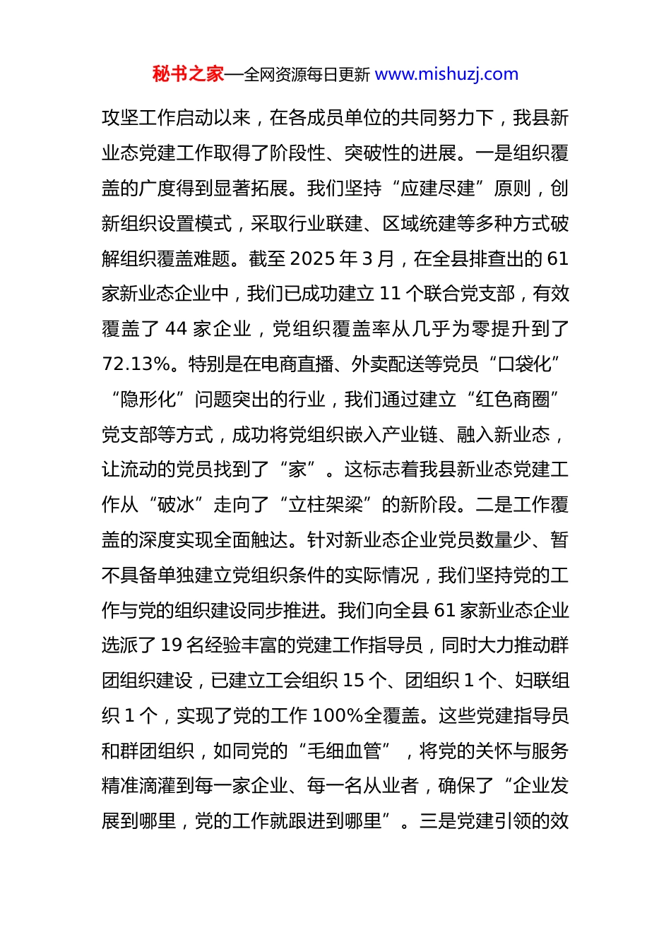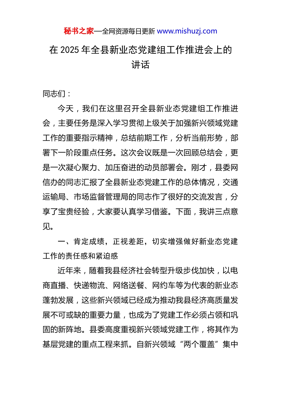 秘书之家—全网资源每日更新 www.mishuzj.com在 2025 年全县新业态党建组工作推进会上的讲话 同志们:今天,我们在这里召开全县新业态党建组工作推进会,主要任务是深入学习贯彻上级关于加强新兴领域党建工作的重要指示精神,总结前期工作,分析当前形势,部署下一阶段重点任务。这次会议既是一次回顾总结会,更是一次凝心聚力、加压奋进的动员部署会。刚才,县委网信办的同志汇报了全县新业态党建工作的总体情况,交通运输局、市场监督管理局的同志作了很好的交流发言,分享了宝贵经验,大家要认真学习借鉴。下面,我讲三点意见。一、肯定成绩,正视差距,切实增强做好新业态党建工作的责任感和紧迫感近年来,随着我县经济社会转型升级步伐加快,以电商直播、快递物流、网络送餐、网约车等为代表的新业态蓬勃发展,这些新兴领域已经成为推动我县经济高质量发展不可或缺的重要力量,也成为了党建工作必须占领和巩固的新阵地。县委高度重视新兴领域党建工作,将其作为基层党建的重点工程来抓。自新兴领域“两个覆盖”集中秘书之家—全网资源每日更新 www.mishuzj.com攻坚工作启动以来,在各成员单位的共同努力下,我县新业态党建工作取得了阶段性、突破性的进展。一是组织覆盖的广度得到显著拓展。我们坚持“应建尽建”原则,创新组织设置模式,采取行业联建、区域统建等多种方式破解组织覆盖难题。截至 2025 年 3 月,在全县排查出的 61家新业态企业中,我们已成功建立 11 个联合党支部,有效覆盖了 44 家企业,党组织覆盖率从几乎为零提升到了72.13%。特别是在电商直播、外卖配送等党员“口袋化”“隐形化”问题突出的行业,我们通过建立“红色商圈”党支部等方式,成功将党组织嵌入产业链、融入新业态,让流动的党员找到了“家”。这标志着我县新业态党建工作从“破冰”走向了“立柱架梁”的新阶段。二是工作覆盖的深度实现全面触达。针对新业态企业党员数量少、暂不具备单独建立党组织条件的实际情况,我们坚持党的工作与党的组织建设同步推进。我们向全县 61 家新业态企业选派了 19 名经验丰富的党建工作指导员,同时大力推动群团组织建设,已建立工会组织 15 个、团组织 1 个、妇联组织 1 个,实现了党的工作 100%全覆盖。这些党建指导员和群团组织,如同党的“毛细血管”,将党的关怀与服务精准滴灌到每一家企业、每一名从业者,确保了“企业发展到哪里,党的工作就跟进到哪里”。三是党建引领的效秘书之家—全网资源每日更新 www.mishuzj.com能初步彰显。我们始终坚持党建工作与企业发展深度融合,把党建工作的成效体现在服务发展、服务民生、服务群众上。例如,外卖配送行业联合党支部建立“诉求收集—分类处置—反馈评价”的闭环工作链条,有效解决了外卖骑手们反映的停车难、饮水难等急难愁盼问题。交通运输部门积极宣传并落实老旧营运货车报废更新补贴政策,已为 4 辆老旧货车申领补贴资金 9.4 万元,实实在在减轻了货车司机的经营压力。这些举措,不仅增强了党组织在新就业群体中的向心力和凝聚力,更将党的政治优势、组织优势转化为了实实在在的发展优势。在肯定成绩的同时,我们更要清醒地看到,对标上级的要求,对照高质量发展的需要,我县新业态党建工作仍然面临不少挑战和问题。这些问题不解决,党建引领作用就无法充分发挥。第一,覆盖质量仍有待提升。目前72.13%的党组织覆盖率虽然是重大突破,但距离全面覆盖的目标还有差距,“空白点”依然存在。更重要的是,在已覆盖的组织中,“有形覆盖”向“有效覆盖”的转化还不够充分。个别联合党支部还存在“空壳化”“僵尸化”的风险,组织生活不规范,作用发挥不明显。如何巩固覆盖成果,提升党组织建设质量,是我们面临的首要课题。第二,融合深度仍有待加强。当前,“党建是党建、业务秘书之家—全网资源每日更新 www.mishuzj.com是业务”的“两张皮”现象在一定程度上仍然存在。一些党组织活动与企业生产经营结合不紧密,满足于开开会、学学文件,未能真正找准党建工作服务企业发展的切入点和发力点。如何让党建工作真正内嵌到企业治理结构中,融入到生产经营各环节,赋能企业发...