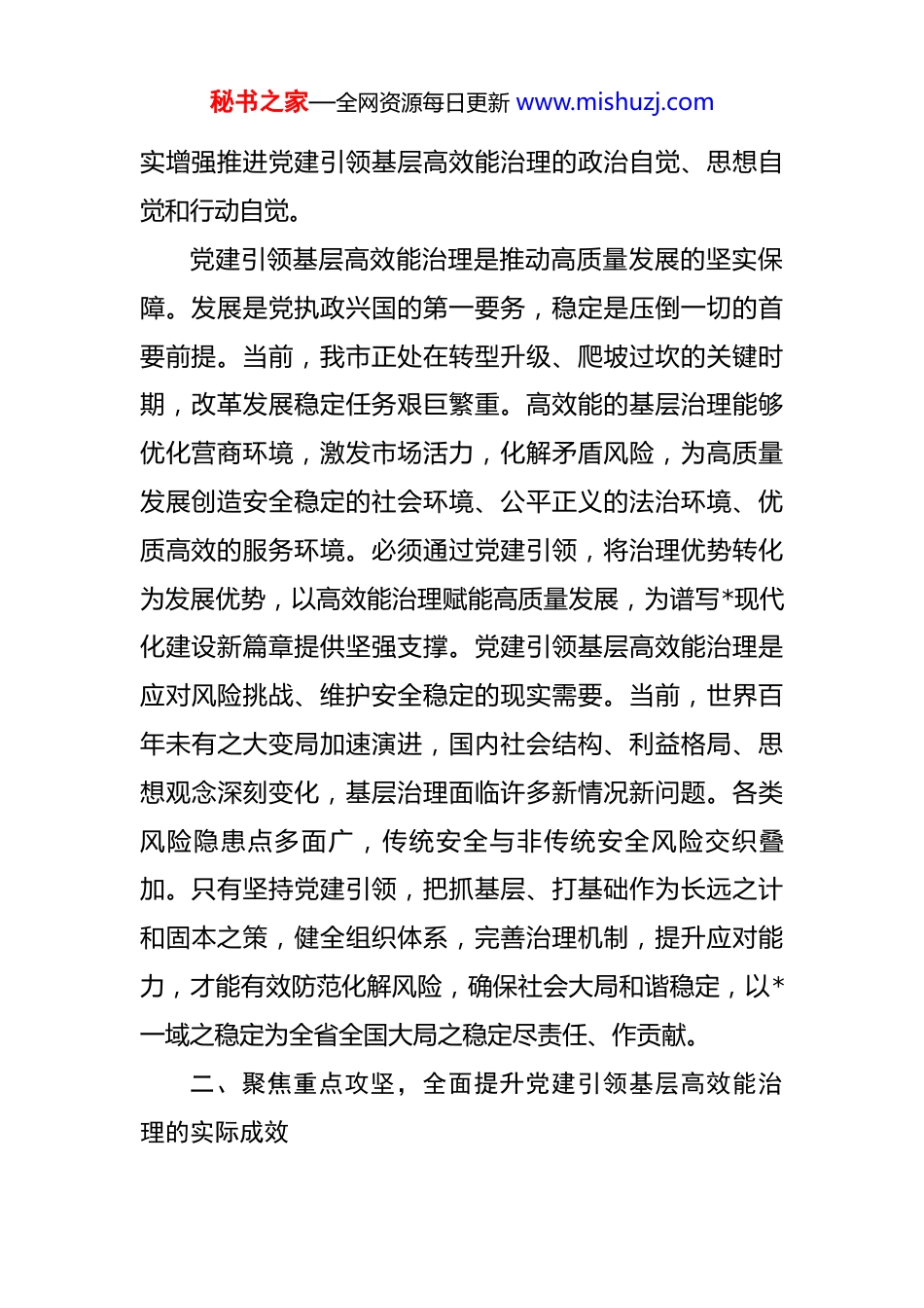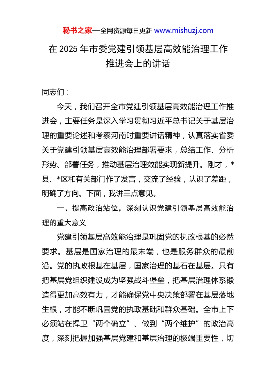秘书之家—全网资源每日更新 www.mishuzj.com在 2025 年市委党建引领基层高效能治理工作推进会上的讲话 同志们:今天,我们召开全市党建引领基层高效能治理工作推进会,主要任务是深入学习贯彻习近平总书记关于基层治理的重要论述和考察河南时重要讲话精神,认真落实省委关于党建引领基层高效能治理部署要求,总结工作、分析形势、部署任务,推动基层治理效能实现新提升。刚才,*县、*区和有关部门作了发言,交流了经验,认识了差距,明确了方向。下面,我讲三点意见。一、提高政治站位,深刻认识党建引领基层高效能治理的重大意义党建引领基层高效能治理是巩固党的执政根基的必然要求。基层是国家治理的最末端,也是服务群众的最前沿。党的执政根基在基层,国家治理的基石在基层。只有把基层党组织建设成为坚强战斗堡垒,把基层治理体系锻造得更加高效有力,才能确保党中央决策部署在基层落地生根,才能不断巩固党的执政基础和群众基础。全市上下必须站在捍卫“两个确立”、做到“两个维护”的政治高度,深刻把握加强基层党建和基层治理的极端重要性,切秘书之家—全网资源每日更新 www.mishuzj.com实增强推进党建引领基层高效能治理的政治自觉、思想自觉和行动自觉。党建引领基层高效能治理是推动高质量发展的坚实保障。发展是党执政兴国的第一要务,稳定是压倒一切的首要前提。当前,我市正处在转型升级、爬坡过坎的关键时期,改革发展稳定任务艰巨繁重。高效能的基层治理能够优化营商环境,激发市场活力,化解矛盾风险,为高质量发展创造安全稳定的社会环境、公平正义的法治环境、优质高效的服务环境。必须通过党建引领,将治理优势转化为发展优势,以高效能治理赋能高质量发展,为谱写*现代化建设新篇章提供坚强支撑。党建引领基层高效能治理是应对风险挑战、维护安全稳定的现实需要。当前,世界百年未有之大变局加速演进,国内社会结构、利益格局、思想观念深刻变化,基层治理面临许多新情况新问题。各类风险隐患点多面广,传统安全与非传统安全风险交织叠加。只有坚持党建引领,把抓基层、打基础作为长远之计和固本之策,健全组织体系,完善治理机制,提升应对能力,才能有效防范化解风险,确保社会大局和谐稳定,以*一域之稳定为全省全国大局之稳定尽责任、作贡献。二、聚焦重点攻坚,全面提升党建引领基层高效能治理的实际成效秘书之家—全网资源每日更新 www.mishuzj.com推进党建引领基层高效能治理,必须坚持问题导向,瞄准关键环节,精准发力,务求实效。要重点在以下几个方面下功夫、求突破。(一)健全工作机制,确保治理体系高效运转。机制建设是高效能治理的基础保障。要充分发挥党委总揽全局、协调各方的领导核心作用,完善“街乡吹哨、部门报到”、联席会议制度,确保上下贯通、执行有力。要深入推进“五基四化”建设,即加强基层党组织建设、治理队伍建设、治理机制建设、治理网格建设、治理平台建设,持续提升基层治理社会化、法治化、智能化、专业化水平。要着力构建“信息收集、定期上报、督办落实、反馈评价”的工作闭环,确保问题线索及时掌握、工作任务精准派发、处置过程全程监督、办理结果有效反馈。要建立健全风险隐患预警快速响应机制,运用大数据等技术手段加强监测预警,确保问题发现在早、处置在小。目前,全市已划分综合网格*个,专属网格*个,配备专兼职网格员*名,通过信息化平台上报处置事件*万件,办结率达到*%。(二)优化网格管理,激发基层治理内生动力。网格是基层治理的基本单元。要全面推行“党建+网格+大数据”治理模式,推动党组织网络与治理网格深度融合,实现“多网合一、一网统管”。要坚持网格和网络协同,线秘书之家—全网资源每日更新 www.mishuzj.com下“铁脚板”与线上“数智化”相结合,以“数智”促进基层“善治”。要优化网格设置,配强网格力量,明确网格职责,完善网格员选拔、培训、管理、考核、激励机制,提升网格员队伍专业化水平和履职能力。要推动更多资源、服务、管理向网格下沉,使网格真正成为采集信息、发现风险、化解矛盾、服务群众的前沿阵地。要深化拓展网格功能,在疫情防控、文明创建、安全生产、...