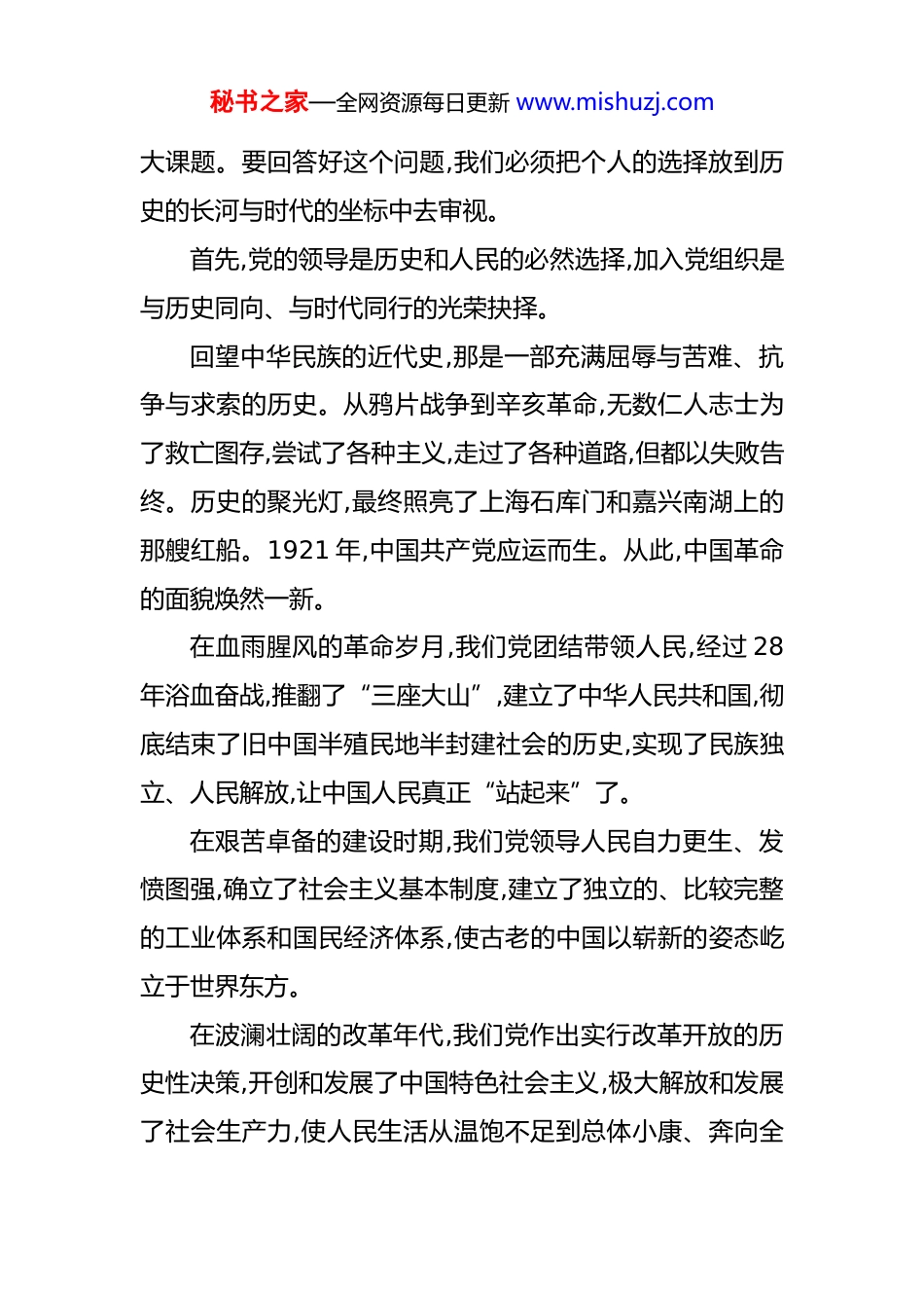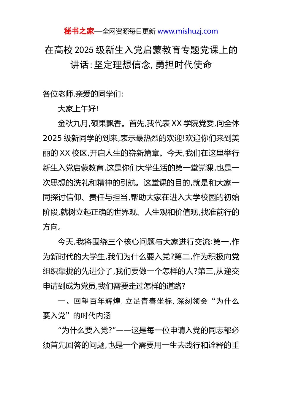 秘书之家—全网资源每日更新 www.mishuzj.com在高校 2025 级新生入党启蒙教育专题党课上的讲话:坚定理想信念,勇担时代使命 各位老师,亲爱的同学们:大家上午好!金秋九月,硕果飘香。首先,我代表 XX 学院党委,向全体2025 级新同学的到来,表示最热烈的欢迎!欢迎你们来到美丽的 XX 校区,开启人生的崭新篇章。今天,我们在这里举行新生入党启蒙教育,这是你们大学生活的第一堂党课,也是一次思想的洗礼和精神的引航。这堂课的目的,就是和大家一同探讨信仰、责任与担当,帮助大家在进入大学校园的初始阶段,就树立起正确的世界观、人生观和价值观,找准前行的方向。今天,我将围绕三个核心问题与大家进行交流:第一,作为新时代的大学生,我们为什么要入党?第二,作为积极向党组织靠拢的先进分子,我们要做一个怎样的人?第三,从递交申请到成为党员,我们需要走过怎样的道路?一、回望百年辉煌,立足青春坐标,深刻领会“为什么要入党”的时代内涵“为什么要入党?”——这是每一位申请入党的同志都必须首先回答的问题,也是一个需要用一生去践行和诠释的重秘书之家—全网资源每日更新 www.mishuzj.com大课题。要回答好这个问题,我们必须把个人的选择放到历史的长河与时代的坐标中去审视。首先,党的领导是历史和人民的必然选择,加入党组织是与历史同向、与时代同行的光荣抉择。回望中华民族的近代史,那是一部充满屈辱与苦难、抗争与求索的历史。从鸦片战争到辛亥革命,无数仁人志士为了救亡图存,尝试了各种主义,走过了各种道路,但都以失败告终。历史的聚光灯,最终照亮了上海石库门和嘉兴南湖上的那艘红船。1921 年,中国共产党应运而生。从此,中国革命的面貌焕然一新。在血雨腥风的革命岁月,我们党团结带领人民,经过 28年浴血奋战,推翻了“三座大山”,建立了中华人民共和国,彻底结束了旧中国半殖民地半封建社会的历史,实现了民族独立、人民解放,让中国人民真正“站起来”了。在艰苦卓备的建设时期,我们党领导人民自力更生、发愤图强,确立了社会主义基本制度,建立了独立的、比较完整的工业体系和国民经济体系,使古老的中国以崭新的姿态屹立于世界东方。在波澜壮阔的改革年代,我们党作出实行改革开放的历史性决策,开创和发展了中国特色社会主义,极大解放和发展了社会生产力,使人民生活从温饱不足到总体小康、奔向全秘书之家—全网资源每日更新 www.mishuzj.com面小康,让中国大踏步赶上了时代,实现了“富起来”的伟大飞跃。党的十八大以来,中国特色社会主义进入新时代。这十年,是我们党和国家事业取得历史性成就、发生历史性变革的十年。我们迎来了中国共产党成立一百周年;我们完成了脱贫攻坚、全面建成了小康社会,历史性地解决了绝对贫困问题,实现了中华民族的千年梦想,这是在 2020 年这个关键年份实现的伟大壮举;我们成功召开了党的二十大,擘画了全面建设社会主义现代化国家、以中国式现代化全面推进中华民族伟大复兴的宏伟蓝图。这一系列彪炳史册的成就,雄辩地证明:没有中国共产党,就没有新中国,就没有中华民族伟大复兴。中国共产党领导,是历史的选择,是人民的选择。因此,选择加入中国共产党,就是选择站在历史正确的一边,选择与我们国家和民族的光明未来紧密相连。其次,将个人理想融入党和国家事业,是追求进步、实现价值、奉献国家的时代召唤。同学们,你们风华正茂,正处在人生的“拔节孕穗期”。你们或许会问,宏大的历史叙事与我们个人有何关系?关系重大。因为,个人的前途命运,从来都与国家和民族的前途命运休戚与共。加入党组织,正是实现个人价值与社会价值有机统一的最佳路径。秘书之家—全网资源每日更新 www.mishuzj.com这是个人追求进步的内在需要。中国共产党是中国工人阶级的先锋队,同时是中国人民和中华民族的先锋队。它由最先进的分子组成,代表着最先进的思想和文化。申请入党的过程,本身就是一个学习、思考、提升的过程。它要求你用更高的标准来审视自己,用更严的要求来规范言行,不断克服缺点、完善自我。近年来,根据相关调研数据显示,全国高校新生提交入党申请的比例已经超过总数的 65%,并且呈现逐年攀升的趋势。这充分说明,追求政治进步,积极向党组织靠拢,已经成为当代优秀大学生...