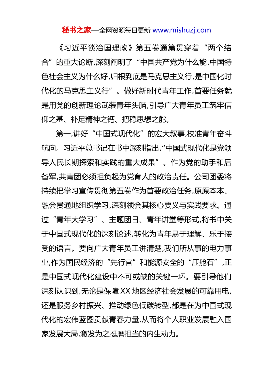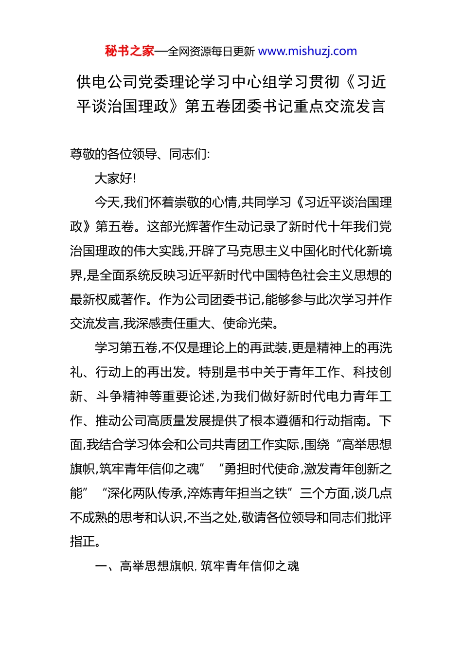 秘书之家—全网资源每日更新 www.mishuzj.com供电公司党委理论学习中心组学习贯彻《习近平谈治国理政》第五卷团委书记重点交流发言 尊敬的各位领导、同志们:大家好!今天,我们怀着崇敬的心情,共同学习《习近平谈治国理政》第五卷。这部光辉著作生动记录了新时代十年我们党治国理政的伟大实践,开辟了马克思主义中国化时代化新境界,是全面系统反映习近平新时代中国特色社会主义思想的最新权威著作。作为公司团委书记,能够参与此次学习并作交流发言,我深感责任重大、使命光荣。学习第五卷,不仅是理论上的再武装,更是精神上的再洗礼、行动上的再出发。特别是书中关于青年工作、科技创新、斗争精神等重要论述,为我们做好新时代电力青年工作、推动公司高质量发展提供了根本遵循和行动指南。下面,我结合学习体会和公司共青团工作实际,围绕“高举思想旗帜,筑牢青年信仰之魂”“勇担时代使命,激发青年创新之能”“深化两队传承,淬炼青年担当之铁”三个方面,谈几点不成熟的思考和认识,不当之处,敬请各位领导和同志们批评指正。一、高举思想旗帜,筑牢青年信仰之魂秘书之家—全网资源每日更新 www.mishuzj.com《习近平谈治国理政》第五卷通篇贯穿着“两个结合”的重大论断,深刻阐明了“中国共产党为什么能,中国特色社会主义为什么好,归根到底是马克思主义行,是中国化时代化的马克思主义行”。做好新时代青年工作,首要任务就是用党的创新理论武装青年头脑,引导广大青年员工筑牢信仰之基、补足精神之钙、把稳思想之舵。第一,讲好“中国式现代化”的宏大叙事,校准青年奋斗航向。习近平总书记在书中深刻指出,“中国式现代化是党领导人民长期探索和实践的重大成果”。作为党的助手和后备军,共青团必须担负起为党育人的政治责任。公司团委将持续把学习宣传贯彻第五卷作为首要政治任务,原原本本、融会贯通地组织学习,深刻领会其核心要义与实践要求。通过“青年大学习”、主题团日、青年讲堂等形式,将书中关于中国式现代化的深刻论述,转化为青年易于理解、乐于接受的语言。要向广大青年员工讲清楚,我们所从事的电力事业,作为国民经济的“先行官”和能源安全的“压舱石”,正是中国式现代化建设中不可或缺的关键一环。要引导他们深刻认识到,无论是保障 XX 地区经济社会发展的可靠用电,还是服务乡村振兴、推动绿色低碳转型,都是在为中国式现代化的宏伟蓝图贡献青春力量,从而将个人职业发展融入国家发展大局,激发为之挺膺担当的内生动力。秘书之家—全网资源每日更新 www.mishuzj.com第二,答好“为了青年发展”的时代课题,增强组织凝聚力量。第五卷中处处蕴含着总书记对青年的殷切期望和深情关怀。做好青年思想引领工作,不能仅仅停留在单向的理论灌输,更要心系青年、深入青年,把服务青年作为共青团工作的生命线。面对当前青年员工思想活跃、诉求多元的特点,公司团委必须感同身受地了解他们的所思所想、所愁所盼。要聚焦青年在职业发展、技能提升、岗位成才、身心健康等方面的现实关切,积极搭建平台、创造条件,把组织的关怀和温暖送到青年心坎上。只有通过解决实际问题,让青年感受到组织的温度,思想引领才能更有穿透力和感召力,共青团组织才能真正成为青年想得起、找得到、靠得住的坚强后盾。第三,用好“红色电力文化”的鲜活教材,赓续青年精神血脉。理论的魅力在于联系实际。我们将把学习第五卷同学习党史、新中国史、改革开放史、社会主义发展史、电力发展史结合起来,充分挖掘公司发展历程中的红色基因。通过邀请老党员、老前辈讲述公司艰苦创业、电网发展的奋斗故事,组织青年员工参观红色教育基地,开展“我与企业共成长”等活动,让青年员工在鲜活的历史和身边榜样中感悟初心使命,理解“人民电业为人民”的深刻内涵。通过这种方式,将抽象的理论具象化、生动化,让青年员工深刻理解,秘书之家—全网资源每日更新 www.mishuzj.com我们今天所拥有的一切来之不易,从而更加坚定地听党话、跟党走。二、勇担时代使命,激发青年创新之能创新是引领发展的第一动力,青年是企业创新发展的生力军。习近平总书记在第五卷中反复强调“必须坚持科技是第一生产力、人才是第一资源、创新是第一动力”。对于我们供电企业而...