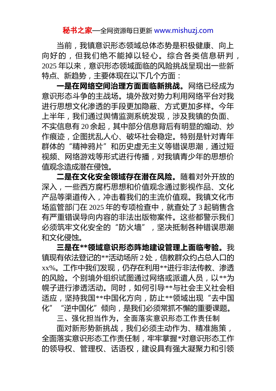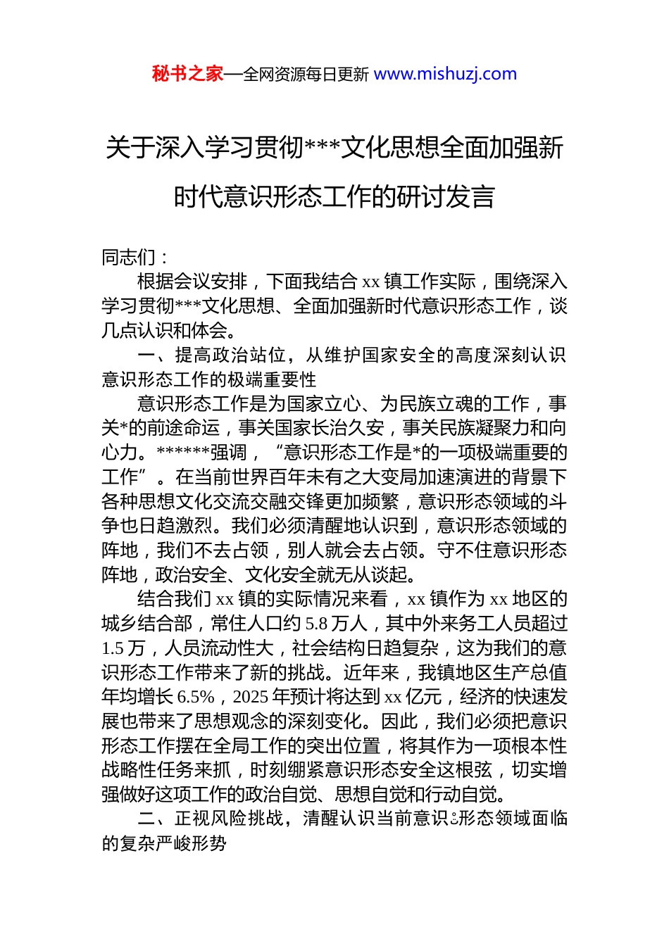 秘书之家—全网资源每日更新 www.mishuzj.com关于深入学习贯彻***文化思想全面加强新时代意识形态工作的研讨发言同志们:根据会议安排,下面我结合 xx 镇工作实际,围绕深入学习贯彻***文化思想、全面加强新时代意识形态工作,谈几点认识和体会。一、提高政治站位,从维护国家安全的高度深刻认识意识形态工作的极端重要性意识形态工作是为国家立心、为民族立魂的工作,事关*的前途命运,事关国家长治久安,事关民族凝聚力和向心力。******强调,“意识形态工作是*的一项极端重要的工作”。在当前世界百年未有之大变局加速演进的背景下各种思想文化交流交融交锋更加频繁,意识形态领域的斗争也日趋激烈。我们必须清醒地认识到,意识形态领域的阵地,我们不去占领,别人就会去占领。守不住意识形态阵地,政治安全、文化安全就无从谈起。结合我们 xx 镇的实际情况来看,xx 镇作为 xx 地区的城乡结合部,常住人口约 5.8 万人,其中外来务工人员超过1.5 万,人员流动性大,社会结构日趋复杂,这为我们的意识形态工作带来了新的挑战。近年来,我镇地区生产总值年均增长 6.5%,2025 年预计将达到 xx 亿元,经济的快速发展也带来了思想观念的深刻变化。因此,我们必须把意识形态工作摆在全局工作的突出位置,将其作为一项根本性战略性任务来抓,时刻绷紧意识形态安全这根弦,切实增强做好这项工作的政治自觉、思想自觉和行动自觉。二、正视风险挑战,清醒认识当前意识ْت形态领域面临的复杂严峻形势秘书之家—全网资源每日更新 www.mishuzj.com当前,我镇意识形态领域总体态势是积极健康、向上向好的,但我们绝不能掉以轻心。综合各类信息研判 ,2025 年以来,意识形态领域面临的风险挑战呈现出一些新特点、新趋势,主要体现在以下几个方面:一是在网络空间治理方面面临新挑战。网络已经成为意识形态斗争的主战场。境外敌对势力利用网络平台对我进行思想文化渗透的手段更加隐蔽、方式更加多样。今年上半年,我们通过舆情监测系统发现,涉及我镇的负面、不实信息有 20 余起,其中部分信息背后有明显的煽动、炒作痕迹,企图扰乱人心、破坏社会稳定。特别是针对青年群体的“精神鸦片”和历史虚无主义等错误思潮,通过短视频、网络游戏等形式进行传播,对我镇青少年的思想价值观念造成潜在侵蚀。二是在文化安全领域存在潜在风险。随着对外开放的深入,一些西方腐朽思想和价值观念通过影视作品、文化产品等渠道传入,冲击着我们的主流价值观。我镇文化市场监管部门在 2025 年的专项检查中,就查处了 3 起销售含有严重错误导向内容的非法出版物案件。这些都警示我们必须筑牢文化安全的“防火墙”,坚决抵制各种错误思潮和文化侵蚀。三是在**领域意识形态阵地建设管理上面临考验。我镇现有依法登记的**活动场所 2 处,信教群众约占总人口的xx%。工作中我们发现,仍存在利用**进行非法传教、渗透的风险。个别境外组织试图通过网络或派遣人员,以**为幌子进行渗透活动。同时,如何引导**与社会主义社会相适应,坚持我国**中国化方向,防止**领域出现“去中国化”“逆中国化”倾向,是我们必须常抓不懈的重要课题。三、强化担当作为,全面落实意识形态工作责任制面对新形势新挑战,我们必须主动作为、精准施策,全面落实意识形态工作责任制,牢牢掌握*对意识形态工作的领导权、管理权、话语权,建设具有强大凝聚力和引领秘书之家—全网资源每日更新 www.mishuzj.com力的社会主义意识形态。一是压实主体责任,拧紧意识形态“总开关”。我们始终坚持*管意识形态原则,镇*委严格落实主体责任,我作为*委书记认真履行第一责任人职责,班子成员按照“一岗双责”要求,抓好分管领域的意识形态工作。我们坚持每季度召开一次意识形态工作专题分析研判会,及时发现和解决苗头性、倾向性问题。今年,我们将意识形态工作责任制落实情况纳入年度干部考核和 dj 工作述职评议的重要内容,对全镇 12 个村(社区)*组织进行了专项督查,对发现的 2 个问题已责令限期整改,确保责任层层传导、压力层层压实。二是深化理论武装,筑牢思想理论“压舱石”。坚持把学习宣传贯彻************...