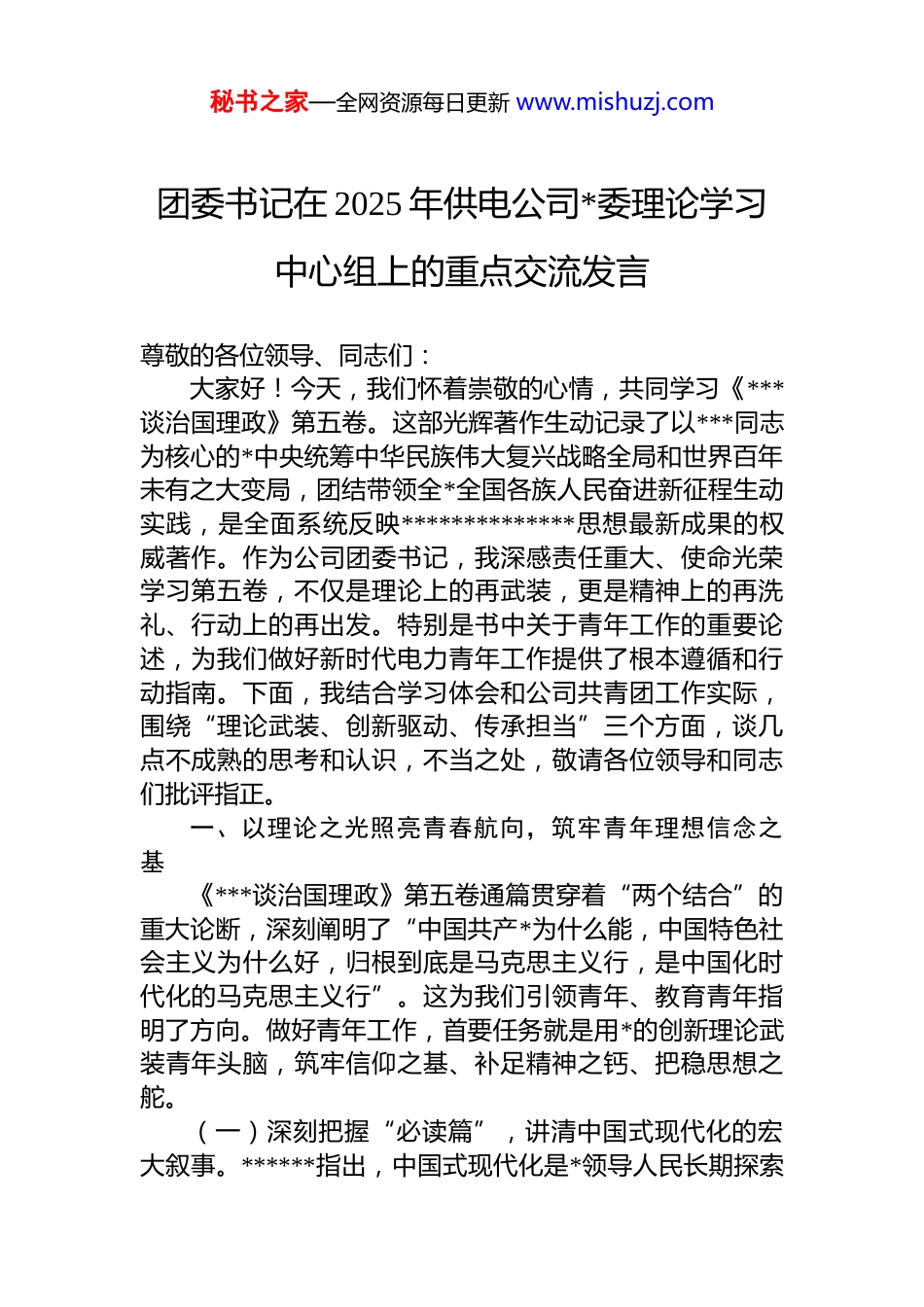秘书之家—全网资源每日更新 www.mishuzj.com团委书记在 2025 年供电公司*委理论学习中心组上的重点交流发言尊敬的各位领导、同志们:大家好!今天,我们怀着崇敬的心情,共同学习《***谈治国理政》第五卷。这部光辉著作生动记录了以***同志为核心的*中央统筹中华民族伟大复兴战略全局和世界百年未有之大变局,团结带领全*全国各族人民奋进新征程生动实践,是全面系统反映**************思想最新成果的权威著作。作为公司团委书记,我深感责任重大、使命光荣学习第五卷,不仅是理论上的再武装,更是精神上的再洗礼、行动上的再出发。特别是书中关于青年工作的重要论述,为我们做好新时代电力青年工作提供了根本遵循和行动指南。下面,我结合学习体会和公司共青团工作实际,围绕“理论武装、创新驱动、传承担当”三个方面,谈几点不成熟的思考和认识,不当之处,敬请各位领导和同志们批评指正。一、以理论之光照亮青春航向,筑牢青年理想信念之基《***谈治国理政》第五卷通篇贯穿着“两个结合”的重大论断,深刻阐明了“中国共产*为什么能,中国特色社会主义为什么好,归根到底是马克思主义行,是中国化时代化的马克思主义行”。这为我们引领青年、教育青年指明了方向。做好青年工作,首要任务就是用*的创新理论武装青年头脑,筑牢信仰之基、补足精神之钙、把稳思想之舵。(一)深刻把握“必读篇”,讲清中国式现代化的宏大叙事。******指出,中国式现代化是*领导人民长期探索秘书之家—全网资源每日更新 www.mishuzj.com和实践的重大成果。作为*的助手和后备军,共青团必须担负起“政治学校”的职能。我们要原原本本、融会贯通地学习第五卷,深刻领会其核心要义、精神实质和实践要求并将其转化为青年易于理解、乐于接受的语言。我们要向广大团员青年讲清楚中国式现代化道路的艰辛探索历程,讲明白其深厚的历史底蕴和实践基础,讲透彻其“人口规模巨大”“全体人民共同富裕”等本质特征。通过主题团日、青年讲堂、线上学习等多种形式,引导青年员工深刻认识到,他们所从事的电力事业,正是中国式现代化建设中不可或缺的“先行官”和“压舱石”,从而激发他们为中国式现代化挺膺担当的内生动力。(二)深刻把握“青年篇”,回答“为谁培养人”的根本问题。第五卷中蕴含着***对青年的殷切期望和深情关怀。我们必须心系青年、深入青年,把服务青年作为共青团工作的生命线。面对当前青年员工思想活跃、诉求多元的特点,我们不能停留在简单的说教上,更要感同身受地了解他们的所思所想、所愁所盼。要坚持“民生为大”,聚焦青年在职业发展、技能提升、婚恋交友、身心健康等方面的现实关切,积极搭建平台、创造条件,把组织的关怀和温暖送到青年心坎上。只有这样,我们的思想引领才能更有温度、更有力量,我们的组织才能真正成为青年想得起、找得到、靠得住的坚强后盾。(三)深刻把握“实践篇”,推动青年理论学习成果转化为实际行动。理论的价值在于指导实践,学习的目的在于运用。共青团要积极引导青年员工将学习第五卷的收获转化为投身电力事业的实际行动。通过组织青年员工参与重点工程建设、技术创新攻关、志愿服务活动等,让他们在实践中锤炼本领、增长才干。同时,要建立完善的实践成果反馈机制,及时总结青年员工在实践中取得的好经验、好做法,形成可复制、可推广的模式,激励更多青年员工在电力事业中建功立业。此外,还要注重培养青年员秘书之家—全网资源每日更新 www.mishuzj.com工的创新思维和实践能力,鼓励他们在实践中探索新方法新路径,为中国式现代化建设贡献青春智慧。二、以创新之擎驱动发展伟力,激发青年建功立业之志创新是引领发展的第一动力,青年是社会上最富活力、最具创造性的群体。******在第五卷中多次强调“必须坚持科技是第一生产力、人才是第一资源、创新是第一动力”。对于我们供电企业而言,创新不仅是应对能源转型挑战、实现高质量发展的必由之路,更是青年员工施展才华、实现价值的广阔舞台。公司团委必须扛起组织青年、引导青年、服务青年投身创新创效的重任。(一)搭建青年创新平台,让“想创”的青年有舞台。公司现有员工近 8000 人,其...