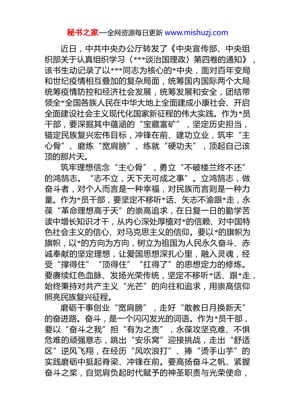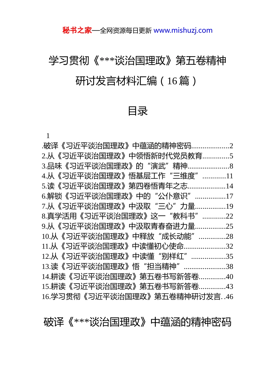 秘书之家—全网资源每日更新 www.mishuzj.com学习贯彻《***谈治国理政》第五卷精神研讨发言材料汇编(16 篇)目录1.破译《习近平谈治国理政》中蕴涵的精神密码....................22.从《习近平谈治国理政》中领悟新时代党员教育..............53.品味《习近平谈治国理政》的“演武”精神......................84.从《习近平谈治国理政》悟基层工作“三维度”............115.读《习近平谈治国理政》第四卷悟青年之志....................146.解锁《习近平谈治国理政》中的“公仆意识”................177.从《习近平谈治国理政》中汲取“三心”力量................198.真学活用《习近平谈治国理政》这一“教科书”............229.从《习近平谈治国理政》中汲取青春奋进力量................2510.从《习近平谈治国理政》中释放“成长动能”..............2811.从《习近平谈治国理政》中读懂初心使命......................3212.从《习近平谈治国理政》中读懂“别样红”..................3513.读《习近平谈治国理政》悟“担当精神”......................3814.耕读《习近平谈治国理政》第五卷书写新答卷..............4015.耕读《习近平谈治国理政》第五卷书写新答卷..............4316.学习贯彻《习近平谈治国理政》第五卷精神研讨发言. .46破译《***谈治国理政》中蕴涵的精神密码秘书之家—全网资源每日更新 www.mishuzj.com近日,中共中央办公厅转发了《中央宣传部、中央组织部关于认真组织学习〈***谈治国理政〉第四卷的通知》,该书生动记录了以***同志为核心的*中央,面对百年变局和世纪疫情相互叠加的复杂局面,统筹国内国际两个大局统筹疫情防控和经济社会发展,统筹发展和安全,团结带领全*全国各族人民在中华大地上全面建成小康社会、开启全面建设社会主义现代化国家新征程的伟大实践。作为*员干部,要深掘其中蕴涵的“宝藏富矿”,坚定历史担当,锚定民族复兴宏伟目标,冲锋在前、建功立业,筑牢“主心骨”、磨炼“宽肩膀”、练就“硬功夫”,顶起自己该顶的那片天。筑牢理想信念“主心骨”,勇立“不破楼兰终不还”的鸿鹄志。“志不立,天下无可成之事”。立鸿鹄志,做奋斗者,对个人而言是一种幸福,对民族而言则是一种力量。作为*员干部,要坚定不移听*话、矢志不渝跟*走,永葆“革命理想高于天”的崇高追求,在日复一日的勤学苦读中增长知识才干,从内心深处厚植对*的信赖、对中国特色社会主义的信心、对马克思主义的信仰。要以*的旗帜为旗帜,以*的方向为方向,树立为祖国为人民永久奋斗、赤诚奉献的坚定理想,让爱国思想深扎心里,融入灵魂,经受“撑得住”“顶得住”“扛得了”的思想定力的修炼。要赓续红色血脉、发扬光荣传统,坚定不移听*话、跟*走,始终秉持对共产主义“光芒”的向往和追求,用崇高信仰照亮民族复兴征程。磨砺干事创业“宽肩膀”,走好“敢教日月换新天”的奋进路。奋斗,是一个闪闪发光的词语。作为*员干部,要以“奋斗之我”担“有为之责”,永葆攻坚克难、不惧危难的顽强意志,跳出“安乐窝”迎接挑战,走出“舒适区”逆风飞翔,在经历“风吹浪打”、捧“烫手山芋”的实践磨砺中挺起脊梁、冲锋在前。要高扬奋斗之帆、紧握奋斗之桨,自觉肩负起时代赋予的神圣职责与光荣使命,秘书之家—全网资源每日更新 www.mishuzj.com在实践中勇担重任,在奋斗中点亮青春,切实做到不怕事不畏险、不避难、不推责,用实际行动来回应组织的回应和人民的重托。要以“大道至简,实干为要”的责任感,积聚形成千里奔涌、万壑归流的磅礴伟力,创造更多“惊涛骇浪从容渡”的奋斗成果,书写更多“越是艰险越向前”的精彩篇章。练就为民服务“硬功夫”,唱响“俯首甘为孺子牛”的奉献曲。“江山就是人民,人民就是江山”。作为*员干部,要多思民生之忧、常谋民生之利、勤解民生之困,永远保持同人民群众的血肉联系,始终同人民群众想在一起干在一起、风雨同舟、同甘共苦,用实际行动践行为民造福的赤子情怀。要严守廉洁自律底线,在细照笃行中不断修炼自我,在服务人民、奉献社会、建设祖国的生动实践中体现人生价值,升华人生境界。要始终站稳人民立...