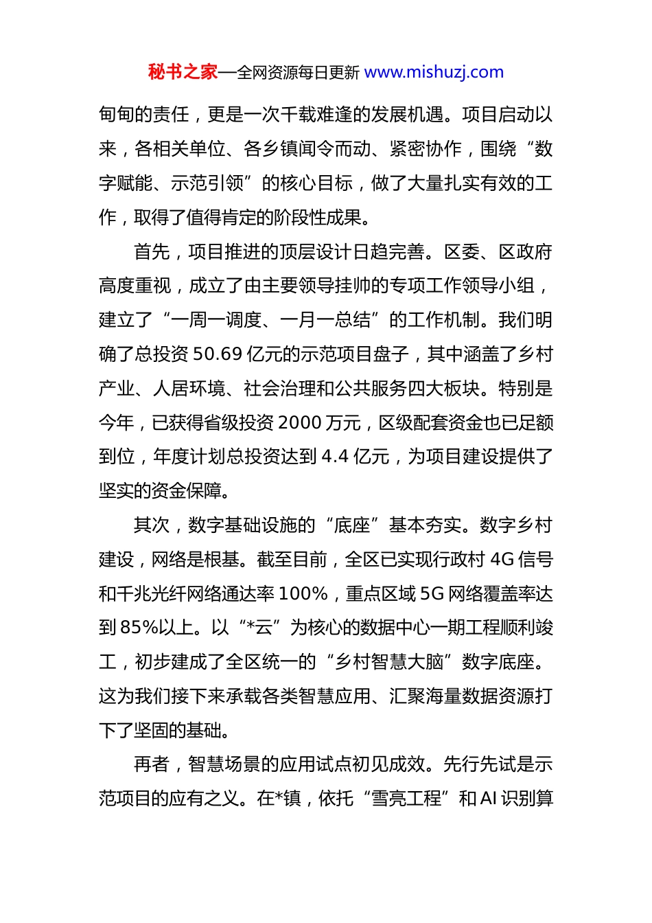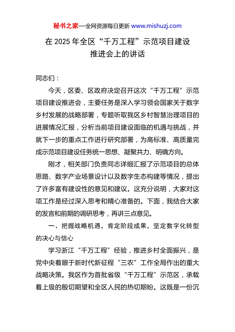 秘书之家—全网资源每日更新 www.mishuzj.com在 2025 年全区“千万工程”示范项目建设推进会上的讲话 同志们:今天,区委、区政府决定召开这次“千万工程”示范项目建设推进会,主要任务是深入学习领会国家关于数字乡村发展的战略部署,专题听取我区乡村智慧治理项目的进展情况汇报,分析当前项目建设面临的机遇与挑战,并就下一步的重点工作进行研究部署,为高标准、高质量完成示范项目建设任务统一思想、凝聚共力、明确方向。刚才,相关部门负责同志详细汇报了示范项目的总体思路、数字产业场景设计以及数字生态构建等情况,提出了许多富有建设性的意见和建议。这充分说明,大家对这项工作是经过深入思考和精心准备的。下面,我结合大家的发言和前期的调研思考,再讲三点意见。一、把握战略机遇,肯定阶段成果,坚定数字化转型的决心与信心学习浙江“千万工程”经验,推进乡村全面振兴,是党中央着眼于新时代新征程“三农”工作全局作出的重大战略决策。我区作为首批省级“千万工程”示范区,承载着上级的殷切期望和全区人民的热切期盼。这既是一份沉秘书之家—全网资源每日更新 www.mishuzj.com甸甸的责任,更是一次千载难逢的发展机遇。项目启动以来,各相关单位、各乡镇闻令而动、紧密协作,围绕“数字赋能、示范引领”的核心目标,做了大量扎实有效的工作,取得了值得肯定的阶段性成果。首先,项目推进的顶层设计日趋完善。区委、区政府高度重视,成立了由主要领导挂帅的专项工作领导小组,建立了“一周一调度、一月一总结”的工作机制。我们明确了总投资 50.69 亿元的示范项目盘子,其中涵盖了乡村产业、人居环境、社会治理和公共服务四大板块。特别是今年,已获得省级投资 2000 万元,区级配套资金也已足额到位,年度计划总投资达到 4.4 亿元,为项目建设提供了坚实的资金保障。其次,数字基础设施的“底座”基本夯实。数字乡村建设,网络是根基。截至目前,全区已实现行政村 4G 信号和千兆光纤网络通达率 100%,重点区域 5G 网络覆盖率达到 85%以上。以“*云”为核心的数据中心一期工程顺利竣工,初步建成了全区统一的“乡村智慧大脑”数字底座。这为我们接下来承载各类智慧应用、汇聚海量数据资源打下了坚固的基础。再者,智慧场景的应用试点初见成效。先行先试是示范项目的应有之义。在*镇,依托“雪亮工程”和 AI 识别算秘书之家—全网资源每日更新 www.mishuzj.com法,对河道沿线进行 24 小时智能监控,已成功预警并处置非法排污、河道垂钓等行为 90 余起,问题发现的及时率和处置效率相较过去的人工巡查提升了近 5 倍。在*村,通过整合 12345 便民热线、网格员上报系统等多个平台数据,归集了各类民生诉求数据超过 10 万条,初步构建了“民呼我应、接诉即办”的线上服务闭环,群众满意度显著提升。这些生动的实践充分证明,数字化、智能化手段是提升乡村治理能力和公共服务水平的有效途径,是改善农村人居环境、提升农民幸福感的关键抓手。肯定成绩的同时,更要清醒地认识到,我区“千万工程”示范项目建设仍处于破题开篇的关键阶段,还面临着不少挑战。比如,部门之间的数据壁垒尚未完全打破,“数据烟囱”现象依然存在;应用场景的设计与群众的实际需求贴合度有待提高,存在“为了数字化而数字化”的苗头;数字人才队伍建设滞后,懂技术、懂农业、懂管理的复合型人才严重短缺。这些问题,都是我们下一步工作中必须着力破解的瓶颈。全区上下必须进一步提高站位,深刻认识到推进“千万工程”、建设数字乡村是顺应时代潮流的必然选择,是推动高质量发展的必由之路,是实现乡村全面振兴的必答之题,以更大的决心和更强的力度,把这项民心工程、发展工程抓实抓好。秘书之家—全网资源每日更新 www.mishuzj.com二、聚焦关键环节,破解瓶颈难题,推动示范项目建设提质增效“千万工程”示范项目建设是一项复杂的系统工程,必须坚持系统观念,找准主攻方向,实施精准发力。下一步,要紧紧围绕“产业兴旺、生态宜居、乡风文明、治理有效、生活富裕”的总要求,以乡村智慧治理为核心驱动,着力在三个方面实现新突破。第一,以系统思维强化协同...
