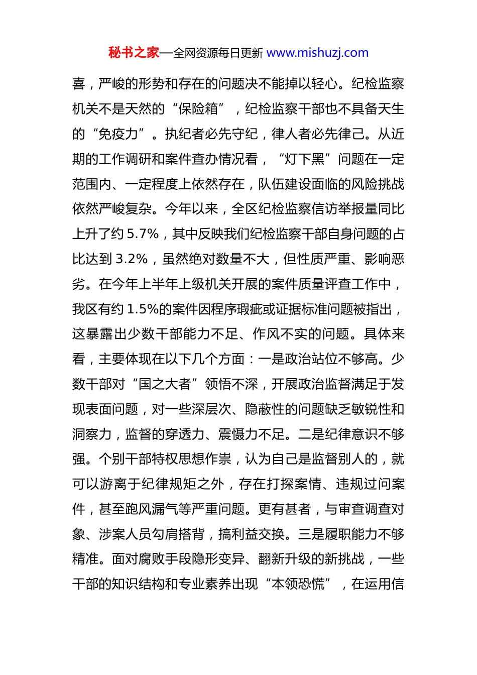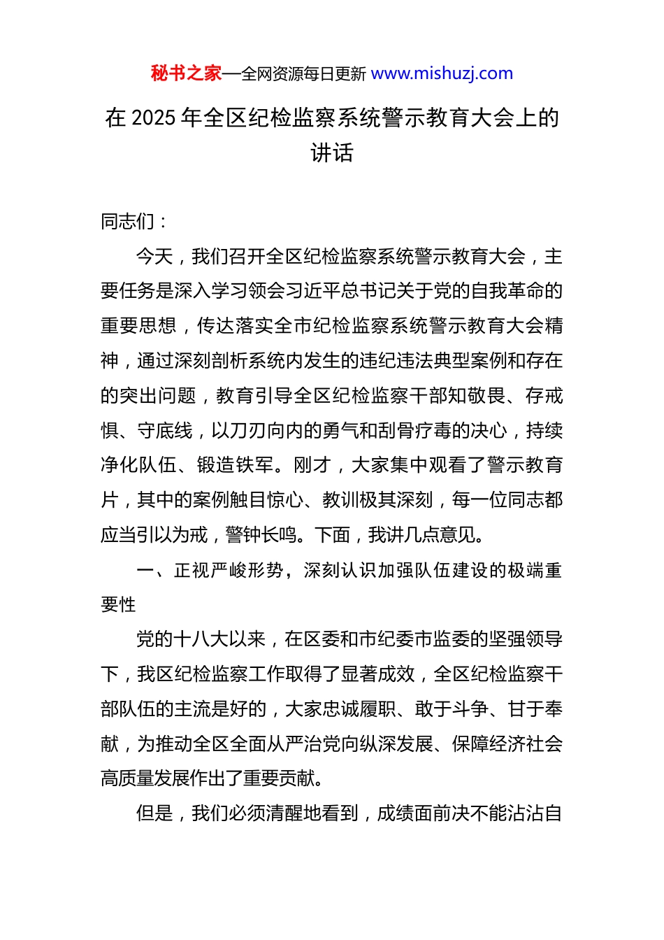 秘书之家—全网资源每日更新 www.mishuzj.com在 2025 年全区纪检监察系统警示教育大会上的讲话 同志们:今天,我们召开全区纪检监察系统警示教育大会,主要任务是深入学习领会习近平总书记关于党的自我革命的重要思想,传达落实全市纪检监察系统警示教育大会精神,通过深刻剖析系统内发生的违纪违法典型案例和存在的突出问题,教育引导全区纪检监察干部知敬畏、存戒惧、守底线,以刀刃向内的勇气和刮骨疗毒的决心,持续净化队伍、锻造铁军。刚才,大家集中观看了警示教育片,其中的案例触目惊心、教训极其深刻,每一位同志都应当引以为戒,警钟长鸣。下面,我讲几点意见。一、正视严峻形势,深刻认识加强队伍建设的极端重要性党的十八大以来,在区委和市纪委市监委的坚强领导下,我区纪检监察工作取得了显著成效,全区纪检监察干部队伍的主流是好的,大家忠诚履职、敢于斗争、甘于奉献,为推动全区全面从严治党向纵深发展、保障经济社会高质量发展作出了重要贡献。但是,我们必须清醒地看到,成绩面前决不能沾沾自秘书之家—全网资源每日更新 www.mishuzj.com喜,严峻的形势和存在的问题决不能掉以轻心。纪检监察机关不是天然的“保险箱”,纪检监察干部也不具备天生的“免疫力”。执纪者必先守纪,律人者必先律己。从近期的工作调研和案件查办情况看,“灯下黑”问题在一定范围内、一定程度上依然存在,队伍建设面临的风险挑战依然严峻复杂。今年以来,全区纪检监察信访举报量同比上升了约 5.7%,其中反映我们纪检监察干部自身问题的占比达到 3.2%,虽然绝对数量不大,但性质严重、影响恶劣。在今年上半年上级机关开展的案件质量评查工作中,我区有约 1.5%的案件因程序瑕疵或证据标准问题被指出,这暴露出少数干部能力不足、作风不实的问题。具体来看,主要体现在以下几个方面:一是政治站位不够高。少数干部对“国之大者”领悟不深,开展政治监督满足于发现表面问题,对一些深层次、隐蔽性的问题缺乏敏锐性和洞察力,监督的穿透力、震慑力不足。二是纪律意识不够强。个别干部特权思想作祟,认为自己是监督别人的,就可以游离于纪律规矩之外,存在打探案情、违规过问案件,甚至跑风漏气等严重问题。更有甚者,与审查调查对象、涉案人员勾肩搭背,搞利益交换。三是履职能力不够精准。面对腐败手段隐形变异、翻新升级的新挑战,一些干部的知识结构和专业素养出现“本领恐慌”,在运用信秘书之家—全网资源每日更新 www.mishuzj.com息化、大数据等现代化手段开展监督检查和审查调查方面存在明显短板,法治意识、程序意识、证据意识有待进一步增强。四是自我要求不够严。有的干部对纪律规定精神认识模糊,心存侥幸,在接受宴请、收送礼品礼金等问题上界限不清;有的干部“八小时之外”自我约束不严,生活作风不检点,造成了不良社会影响。这些问题,虽然只发生在极少数人身上,但严重损害了纪检监察机关的形象和公信力,严重削弱了纪检监察工作的权威性和战斗力。全区各级纪检监察组织和全体纪检监察干部必须对这些问题有清醒的认识,以高度的政治责任感和现实紧迫感,把队伍建设摆在更加突出的位置,常抓不懈、一严到底。二、深化思想认识,精准把握自我革命的根本要求习近平总书记深刻指出,“我们党作为世界上最大的马克思主义执政党,要始终赢得人民拥护,巩固长期执政地位,必须时刻保持解决大党独有难题的清醒和坚定。”纪检监察机关是党的“纪律部队”,是推进全面从严治党的重要力量,在推进党的自我革命中肩负着特殊使命和重大责任。要锻造纪检监察铁军,就必须在自我革命上标准更高、要求更严。第一,必须深刻领悟“两个确立”的决定性意义,坚决做到“两个维护”。忠诚是纪检监察机关与生俱来的政秘书之家—全网资源每日更新 www.mishuzj.com治基因,是纪检监察干部的立身之本。对党绝对忠诚不是抽象的口号,而是具体的、实践的。衡量是不是绝对忠诚,最根本的标尺就是看是否发自内心地拥护“两个确立”、坚决做到“两个维护”。全区纪检监察干部要持续在学懂弄通做实习近平新时代中国特色社会主义思想上下功夫,不断增进对党的创新理论的政治认同、思想认同、理...
