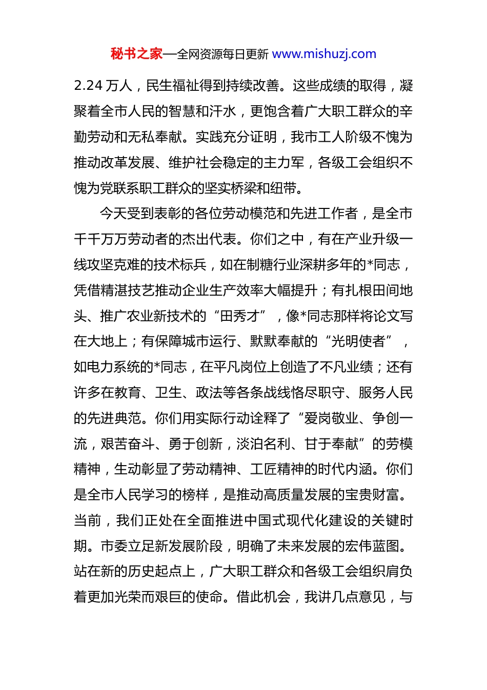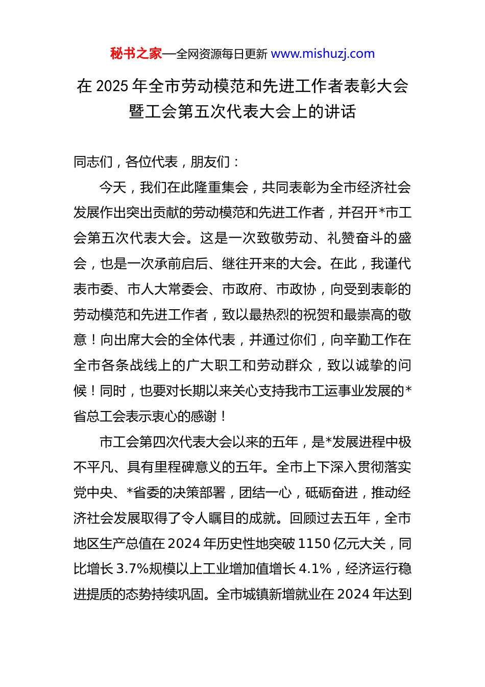 秘书之家—全网资源每日更新 www.mishuzj.com在 2025 年全市劳动模范和先进工作者表彰大会暨工会第五次代表大会上的讲话 同志们,各位代表,朋友们:今天,我们在此隆重集会,共同表彰为全市经济社会发展作出突出贡献的劳动模范和先进工作者,并召开*市工会第五次代表大会。这是一次致敬劳动、礼赞奋斗的盛会,也是一次承前启后、继往开来的大会。在此,我谨代表市委、市人大常委会、市政府、市政协,向受到表彰的劳动模范和先进工作者,致以最热烈的祝贺和最崇高的敬意!向出席大会的全体代表,并通过你们,向辛勤工作在全市各条战线上的广大职工和劳动群众,致以诚挚的问候!同时,也要对长期以来关心支持我市工运事业发展的*省总工会表示衷心的感谢!市工会第四次代表大会以来的五年,是*发展进程中极不平凡、具有里程碑意义的五年。全市上下深入贯彻落实党中央、*省委的决策部署,团结一心,砥砺奋进,推动经济社会发展取得了令人瞩目的成就。回顾过去五年,全市地区生产总值在 2024 年历史性地突破 1150 亿元大关,同比增长 3.7%规模以上工业增加值增长 4.1%,经济运行稳进提质的态势持续巩固。全市城镇新增就业在 2024 年达到秘书之家—全网资源每日更新 www.mishuzj.com2.24 万人,民生福祉得到持续改善。这些成绩的取得,凝聚着全市人民的智慧和汗水,更饱含着广大职工群众的辛勤劳动和无私奉献。实践充分证明,我市工人阶级不愧为推动改革发展、维护社会稳定的主力军,各级工会组织不愧为党联系职工群众的坚实桥梁和纽带。今天受到表彰的各位劳动模范和先进工作者,是全市千千万万劳动者的杰出代表。你们之中,有在产业升级一线攻坚克难的技术标兵,如在制糖行业深耕多年的*同志,凭借精湛技艺推动企业生产效率大幅提升;有扎根田间地头、推广农业新技术的“田秀才”,像*同志那样将论文写在大地上;有保障城市运行、默默奉献的“光明使者”,如电力系统的*同志,在平凡岗位上创造了不凡业绩;还有许多在教育、卫生、政法等各条战线恪尽职守、服务人民的先进典范。你们用实际行动诠释了“爱岗敬业、争创一流,艰苦奋斗、勇于创新,淡泊名利、甘于奉献”的劳模精神,生动彰显了劳动精神、工匠精神的时代内涵。你们是全市人民学习的榜样,是推动高质量发展的宝贵财富。当前,我们正处在全面推进中国式现代化建设的关键时期。市委立足新发展阶段,明确了未来发展的宏伟蓝图。站在新的历史起点上,广大职工群众和各级工会组织肩负着更加光荣而艰巨的使命。借此机会,我讲几点意见,与秘书之家—全网资源每日更新 www.mishuzj.com同志们共勉。一、高举思想旗帜,在坚定政治方向中彰显工人阶级本色工人阶级是党的阶级基础,工会是党领导的工人阶级群众组织,旗帜鲜明讲政治是第一位的要求。全市广大职工要坚持不懈用习近平新时代中国特色社会主义思想凝心铸魂,深刻领悟“两个确立”的决定性意义,增强“四个意识”、坚定“四个自信”、做到“两个维护”,始终在思想上政治上行动上同以习近平同志为核心的党中央保持高度一致。要将学习贯彻党的创新理论与自身工作实践紧密结合起来,深刻理解中国式现代化的科学内涵和实践要求,准确把握党中央、省委和市委的战略部署,把个人理想、家庭幸福融入国家富强、民族复兴的伟大事业之中,把个人奋斗融入*现代化建设的火热实践之中。各级工会组织要切实承担起引导职工群众听党话、跟党走的政治责任,创新方式方法,深化宣传教育,用通俗易懂的语言、喜闻乐见的形式,推动党的理论和路线方针政策在职工群众中落地生根,确保工运事业始终沿着党指引的正确方向前进,不断巩固和发展党执政的阶级基础和群众基础。二、聚焦中心大局,在推动高质量发展中发挥主力军作用秘书之家—全网资源每日更新 www.mishuzj.com发展是第一要务,是解决一切问题的基础和关键。实现市委确定的发展目标,必须依靠全市人民的共同奋斗,尤其需要工人阶级发挥主力军作用。全市广大职工要牢固树立主人翁意识,把个人岗位作为实现人生价值、服务全市发展大局的舞台,积极投身经济建设主战场。要主动融入产业转型升级。当前,我市正加快构建现代化产...