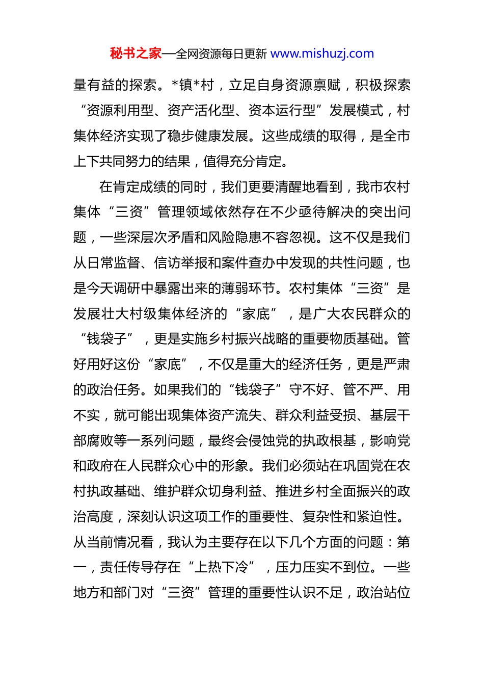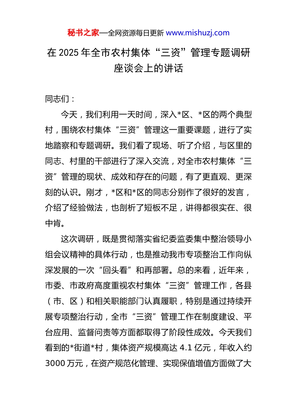 秘书之家—全网资源每日更新 www.mishuzj.com在 2025 年全市农村集体“三资”管理专题调研座谈会上的讲话 同志们:今天,我们利用一天时间,深入*区、*区的两个典型村,围绕农村集体“三资”管理这一重要课题,进行了实地踏察和专题调研。我们看了现场、听了介绍,与区里的同志、村里的干部进行了深入交流,对全市农村集体“三资”管理的现状、成效和存在的问题,有了更直观、更深刻的认识。刚才,*区和*区的同志分别作了很好的发言,介绍了经验做法,也剖析了短板不足,讲得都很实在、很中肯。这次调研,既是贯彻落实省纪委监委集中整治领导小组会议精神的具体行动,也是推动我市专项整治工作向纵深发展的一次“回头看”和再部署。总的来看,近年来,市委、市政府高度重视农村集体“三资”管理工作,各县(市、区)和相关职能部门认真履职,特别是通过持续开展专项整治行动,全市“三资”管理工作在制度建设、平台应用、监督问责等方面都取得了阶段性成效。今天我们看到的*街道*村,集体资产规模高达 4.1 亿元,年收入约3000 万元,在资产规范化管理、实现保值增值方面做了大秘书之家—全网资源每日更新 www.mishuzj.com量有益的探索。*镇*村,立足自身资源禀赋,积极探索“资源利用型、资产活化型、资本运行型”发展模式,村集体经济实现了稳步健康发展。这些成绩的取得,是全市上下共同努力的结果,值得充分肯定。在肯定成绩的同时,我们更要清醒地看到,我市农村集体“三资”管理领域依然存在不少亟待解决的突出问题,一些深层次矛盾和风险隐患不容忽视。这不仅是我们从日常监督、信访举报和案件查办中发现的共性问题,也是今天调研中暴露出来的薄弱环节。农村集体“三资”是发展壮大村级集体经济的“家底”,是广大农民群众的“钱袋子”,更是实施乡村振兴战略的重要物质基础。管好用好这份“家底”,不仅是重大的经济任务,更是严肃的政治任务。如果我们的“钱袋子”守不好、管不严、用不实,就可能出现集体资产流失、群众利益受损、基层干部腐败等一系列问题,最终会侵蚀党的执政根基,影响党和政府在人民群众心中的形象。我们必须站在巩固党在农村执政基础、维护群众切身利益、推进乡村全面振兴的政治高度,深刻认识这项工作的重要性、复杂性和紧迫性。从当前情况看,我认为主要存在以下几个方面的问题:第一,责任传导存在“上热下冷”,压力压实不到位。一些地方和部门对“三资”管理的重要性认识不足,政治站位秘书之家—全网资源每日更新 www.mishuzj.com不高,存在“重发展、轻监管”的倾向。有的地方党委、政府主体责任落实不够有力,把“三资”管理单纯看作是农业农村部门的业务工作,统筹协调、督促指导的力度不够。有的职能部门监管责任履行不充分,满足于建章立制、发文开会,对制度执行情况的监督检查跟不上,存在“以文件落实文件”的现象。更有甚者,一些乡镇(街道)党(工)委对村级“三资”管理疏于监督,当“甩手掌柜”,导致村级组织在资产发包、资金使用、资源处置等重大事项上缺乏有效监督,为权力寻租和腐败问题滋生提供了土壤。第二,制度执行存在“纸上画画”,规范管理不到位。近年来,从中央到地方,出台了一系列关于加强农村集体“三资”管理的制度文件,比如我省在 2022 年就印发了《关于推进农村“三变”改革进一步加强农村集体“三资”管理的实施意见》,今年省农业农村厅又专门就加强农村集体经济合同管理出台了指导意见。可以说,制度的“四梁八柱”已经基本建立。但调研发现,一些地方的制度执行却走了样、变了形。比如,有的村集体经济合同签订不规范、要素不全,甚至出现“阴阳合同”;有的合同租金明显低于市场价格,长期不作调整,造成集体利益严重受损。还有的村在工程项目建设、大额资金使用等决策上,该走的“四议两公开”程序不走,少数村干部秘书之家—全网资源每日更新 www.mishuzj.com“一言堂”“家天下”,搞暗箱操作,为自己和亲友谋取私利。这些问题表明,我们的制度还没有真正长出“牙齿”,执行的刚性约束力有待加强。第三,数字监管存在“建用脱节”,平台应用不到位。我市已经初步建成了农村产权流转交易...