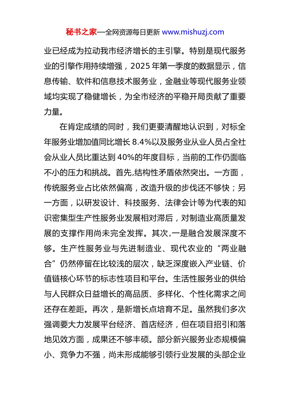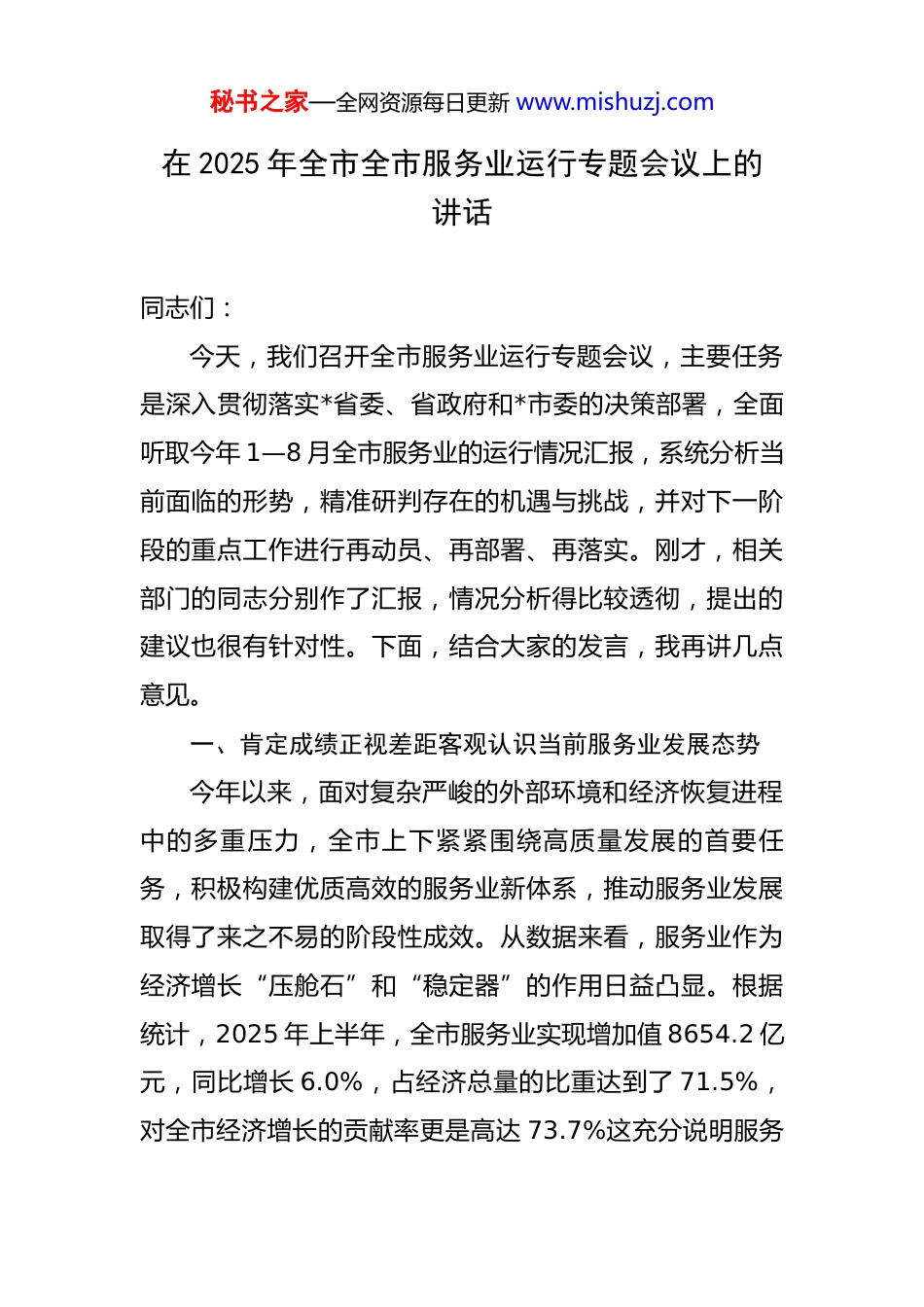 秘书之家—全网资源每日更新 www.mishuzj.com在 2025 年全市全市服务业运行专题会议上的讲话 同志们:今天,我们召开全市服务业运行专题会议,主要任务是深入贯彻落实*省委、省政府和*市委的决策部署,全面听取今年 1—8 月全市服务业的运行情况汇报,系统分析当前面临的形势,精准研判存在的机遇与挑战,并对下一阶段的重点工作进行再动员、再部署、再落实。刚才,相关部门的同志分别作了汇报,情况分析得比较透彻,提出的建议也很有针对性。下面,结合大家的发言,我再讲几点意见。一、肯定成绩正视差距客观认识当前服务业发展态势今年以来,面对复杂严峻的外部环境和经济恢复进程中的多重压力,全市上下紧紧围绕高质量发展的首要任务,积极构建优质高效的服务业新体系,推动服务业发展取得了来之不易的阶段性成效。从数据来看,服务业作为经济增长“压舱石”和“稳定器”的作用日益凸显。根据统计,2025 年上半年,全市服务业实现增加值 8654.2 亿元,同比增长 6.0%,占经济总量的比重达到了 71.5%,对全市经济增长的贡献率更是高达 73.7%这充分说明服务秘书之家—全网资源每日更新 www.mishuzj.com业已经成为拉动我市经济增长的主引擎。特别是现代服务业的引擎作用持续增强,2025 年第一季度的数据显示,信息传输、软件和信息技术服务业,金融业等现代服务业领域均实现了稳健增长,为全市经济的平稳开局贡献了重要力量。在肯定成绩的同时,我们更要清醒地认识到,对标全年服务业增加值同比增长 8.4%以及服务业从业人员占全社会从业人员比重达到 40%的年度目标,当前的工作仍面临不小的压力和挑战。首先,结构性矛盾依然突出。一方面,传统服务业占比依然偏高,改造升级的步伐还不够快;另一方面,以研发设计、科技服务、法律会计等为代表的知识密集型生产性服务业发展相对滞后,对制造业高质量发展的支撑作用尚未完全发挥。其次,一是融合发展深度不够。生产性服务业与先进制造业、现代农业的“两业融合”仍然停留在比较浅的层次,缺乏深度嵌入产业链、价值链核心环节的标志性项目和平台。生活性服务业的供给与人民群众日益增长的高品质、多样化、个性化需求之间还存在差距。再次,是新增长点培育不足。虽然我们多次强调要大力发展平台经济、首店经济,但在项目招引和落地见效方面,成果还不够丰硕。部分新兴服务业态规模偏小、竞争力不强,尚未形成能够引领行业发展的头部企业秘书之家—全网资源每日更新 www.mishuzj.com和产业集群。最后,要素保障和政策落实仍有堵点。部分企业反映,在享受财政扶持、税收优惠等政策时还存在流程较长、门槛较高等问题。高层次、复合型服务业人才的引进和培养机制仍需完善,人才保障体系还不够健全。这些问题,既是短板和弱项,也是我们下一步工作的发力点和突破口。全市各级各部门必须保持清醒的头脑,坚定信心、直面问题,以“时不我待、分秒必争”的紧迫感和责任感,采取更加有力、更加精准的措施,全力推动服务业提质增效,为高质量完成全年各项目标任务奠定坚实基础。二、聚焦关键精准发力全面开创服务业高质量发展新局面做好下一阶段的工作,关键在于紧盯目标任务,细化具体举措,在重点领域和关键环节上实现新突破。要围绕商务、金融、科技、民政、人社、水利等重点领域,一体推进现代生产性服务业和现代生活性服务业发展,千方百计提升服务业对全市经济社会发展的贡献度。第一,着力推动生产性服务业向专业化和价值链高端延伸。这是提升城市产业核心竞争力的关键所在。一要大力发展科技服务业。聚焦我市产业转型升级的现实需求,加快培育一批集技术研发、成果转化、检验检测认证、知秘书之家—全网资源每日更新 www.mishuzj.com识产权服务于一体的综合性科技服务机构。要用好“苏科贷”等财政金融信贷产品,支持科技型服务企业创新发展,鼓励有条件的企业上市融资。二要提升现代金融服务实体经济能级。引导金融机构创新金融产品和服务模式,加大对制造业、科技创新、绿色发展等重点领域的支持力度。积极发展供应链金融,为产业链上下游的中小微企业提供高效便捷的融资服务。三要构建高效畅通的现代物流体系。要加快推...