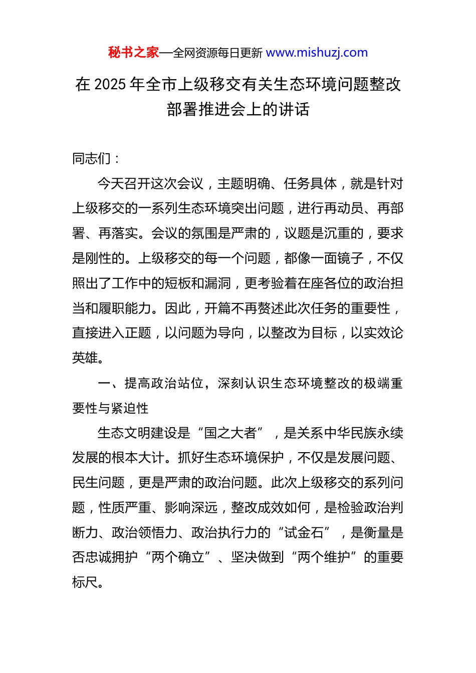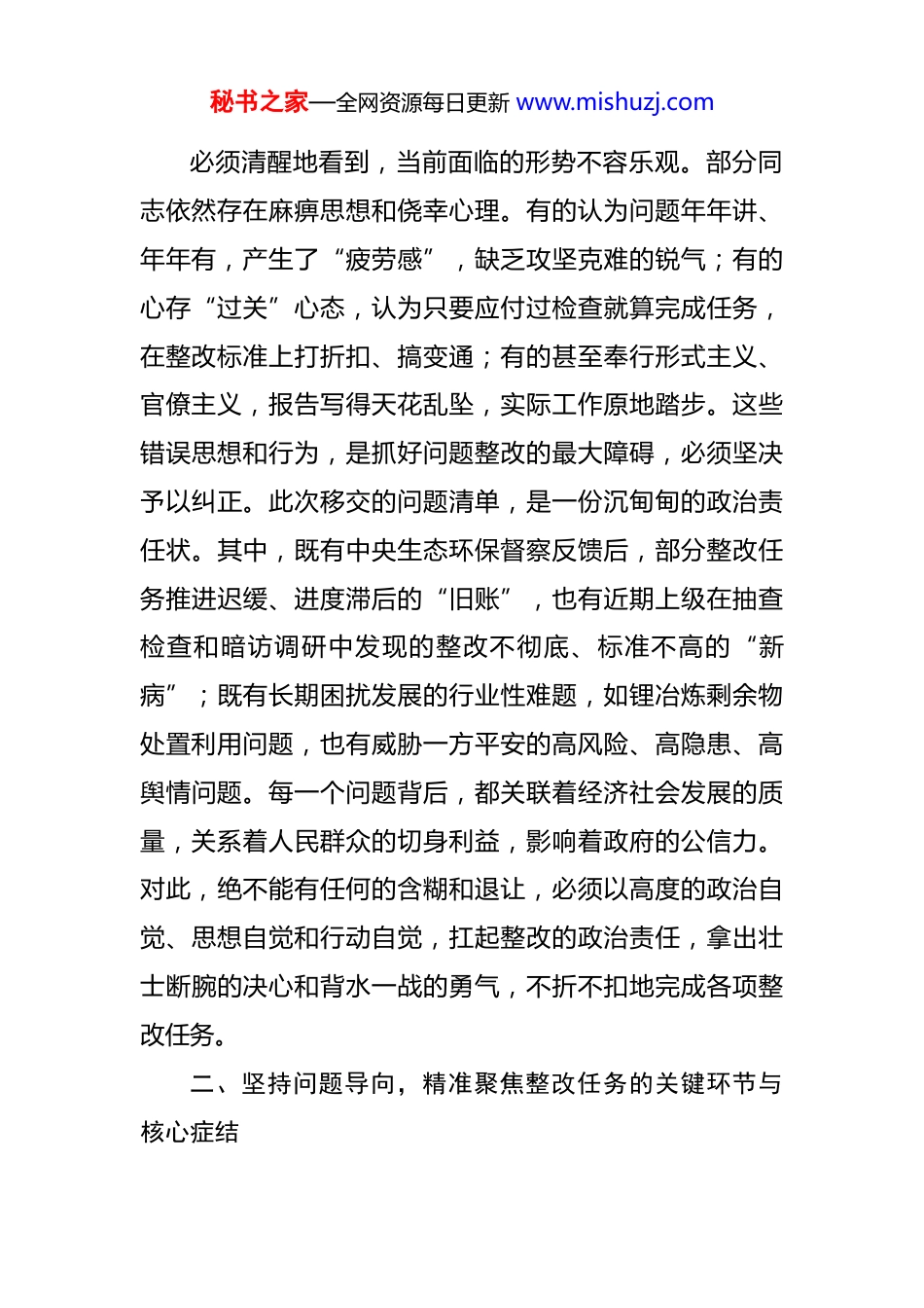 秘书之家—全网资源每日更新 www.mishuzj.com在 2025 年全市上级移交有关生态环境问题整改部署推进会上的讲话 同志们:今天召开这次会议,主题明确、任务具体,就是针对上级移交的一系列生态环境突出问题,进行再动员、再部署、再落实。会议的氛围是严肃的,议题是沉重的,要求是刚性的。上级移交的每一个问题,都像一面镜子,不仅照出了工作中的短板和漏洞,更考验着在座各位的政治担当和履职能力。因此,开篇不再赘述此次任务的重要性,直接进入正题,以问题为导向,以整改为目标,以实效论英雄。一、提高政治站位,深刻认识生态环境整改的极端重要性与紧迫性生态文明建设是“国之大者”,是关系中华民族永续发展的根本大计。抓好生态环境保护,不仅是发展问题、民生问题,更是严肃的政治问题。此次上级移交的系列问题,性质严重、影响深远,整改成效如何,是检验政治判断力、政治领悟力、政治执行力的“试金石”,是衡量是否忠诚拥护“两个确立”、坚决做到“两个维护”的重要标尺。秘书之家—全网资源每日更新 www.mishuzj.com必须清醒地看到,当前面临的形势不容乐观。部分同志依然存在麻痹思想和侥幸心理。有的认为问题年年讲、年年有,产生了“疲劳感”,缺乏攻坚克难的锐气;有的心存“过关”心态,认为只要应付过检查就算完成任务,在整改标准上打折扣、搞变通;有的甚至奉行形式主义、官僚主义,报告写得天花乱坠,实际工作原地踏步。这些错误思想和行为,是抓好问题整改的最大障碍,必须坚决予以纠正。此次移交的问题清单,是一份沉甸甸的政治责任状。其中,既有中央生态环保督察反馈后,部分整改任务推进迟缓、进度滞后的“旧账”,也有近期上级在抽查检查和暗访调研中发现的整改不彻底、标准不高的“新病”;既有长期困扰发展的行业性难题,如锂冶炼剩余物处置利用问题,也有威胁一方平安的高风险、高隐患、高舆情问题。每一个问题背后,都关联着经济社会发展的质量,关系着人民群众的切身利益,影响着政府的公信力。对此,绝不能有任何的含糊和退让,必须以高度的政治自觉、思想自觉和行动自觉,扛起整改的政治责任,拿出壮士断腕的决心和背水一战的勇气,不折不扣地完成各项整改任务。二、坚持问题导向,精准聚焦整改任务的关键环节与核心症结秘书之家—全网资源每日更新 www.mishuzj.com解决问题,首先要看清问题、找准症结。只有对问题进行深入、系统、精准地剖析,才能制定出科学、有效、彻底的整改方案。此次整改,要杜绝“大水漫灌”,力戒“一刀切”,必须针对不同问题的性质和成因,精准科学施策。第一,全力攻坚锂冶炼剩余物处置利用难题。*市作为新能源产业的重要基地,锂电产业为经济发展注入了强劲动力。然而,与产业高速发展相伴相生的,是日益严峻的锂冶炼剩余物处置压力。据不完全统计,全市每年新增的锂冶炼废渣超过 60 万吨。长期以来,多数企业的处理方式仍停留在堆存或简单填埋的初级阶段。这种粗放的处理模式,不仅大量侵占宝贵的土地资源,更对土壤和地下水构成严重的潜在威胁。当前,锂渣资源化利用技术并非空白。国内外已有诸多探索,例如通过湿法冶金工艺回收有价金属,或将其作为建材原料进行综合利用。然而,这些技术在本地的推广应用却步履维艰,主要原因在于部分企业缺乏主体责任意识,宁愿选择成本最低的堆存方式,也不愿在环保技术研发和升级上投入真金白银。同时,相关职能部门在政策引导、标准制定和监督管理方面也存在缺位。对此,必须采取超常规举措:一要立即开展全市锂冶炼剩余物存量和产生量大排查,摸清底数,建立动态管理秘书之家—全网资源每日更新 www.mishuzj.com台账,坚决杜绝新增非法倾倒和堆存点。二要成立由市级层面牵头的技术攻关与应用推广专班,组织科研机构、高校和龙头企业,联合攻关低成本、高效率的锂渣无害化处理和资源化利用技术。对于成熟的技术,要通过政策补贴、税收减免等方式,引导企业加快应用。三是规划建设集中式、专业化的锂冶炼剩余物处置中心和循环经济产业园,变分散处理为集中治理,化企业负担为产业机遇,形成“点石成金”的绿色产业链。第二,坚决彻底整治整改滞后与标准不高问题...