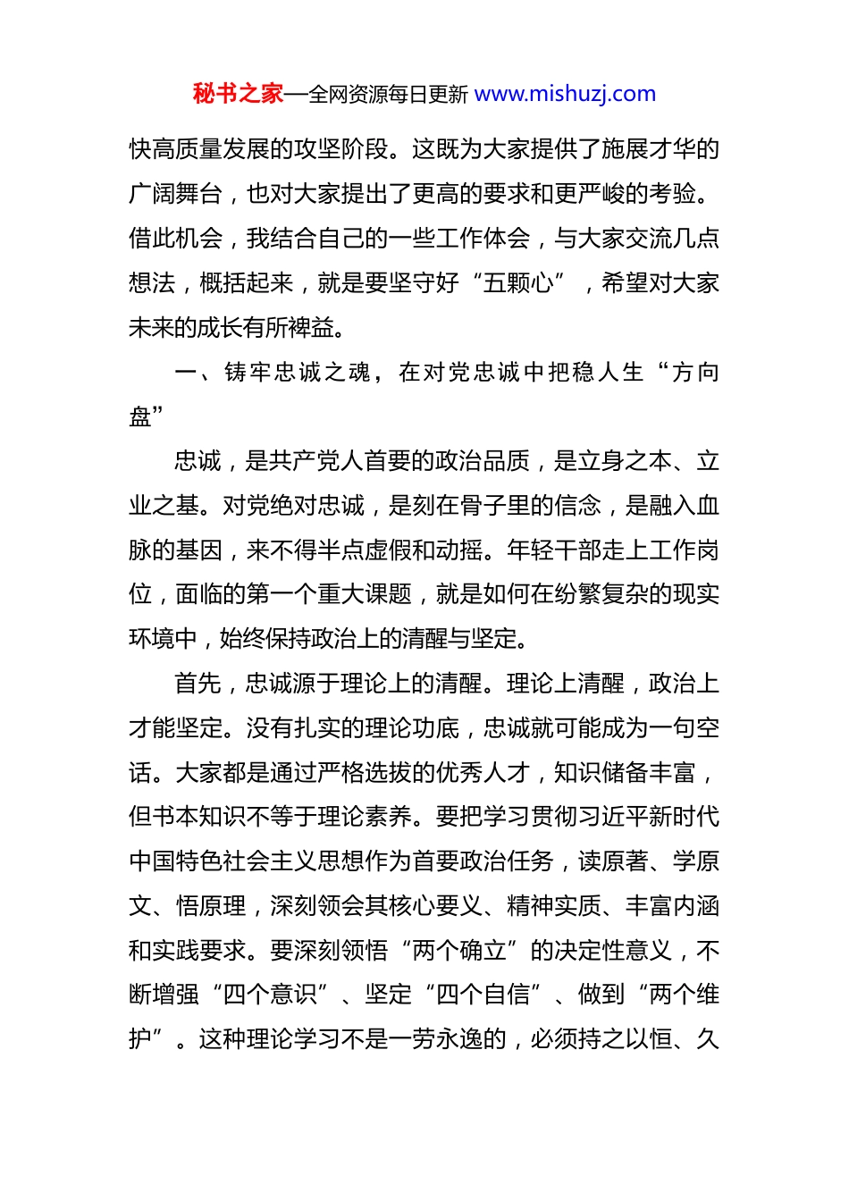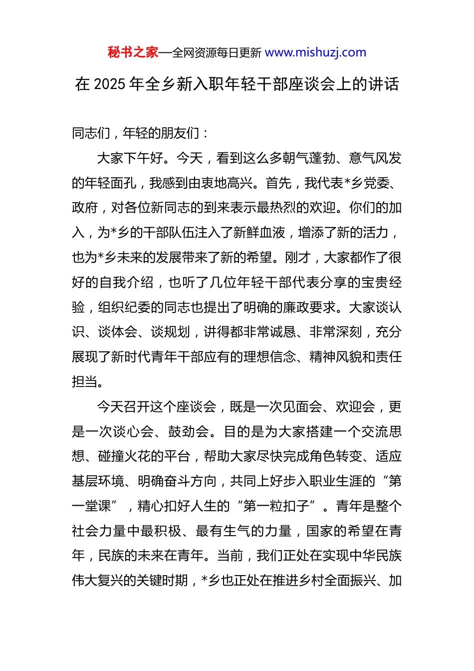 秘书之家—全网资源每日更新 www.mishuzj.com在 2025 年全乡新入职年轻干部座谈会上的讲话 同志们,年轻的朋友们:大家下午好。今天,看到这么多朝气蓬勃、意气风发的年轻面孔,我感到由衷地高兴。首先,我代表*乡党委、政府,对各位新同志的到来表示最热烈的欢迎。你们的加入,为*乡的干部队伍注入了新鲜血液,增添了新的活力,也为*乡未来的发展带来了新的希望。刚才,大家都作了很好的自我介绍,也听了几位年轻干部代表分享的宝贵经验,组织纪委的同志也提出了明确的廉政要求。大家谈认识、谈体会、谈规划,讲得都非常诚恳、非常深刻,充分展现了新时代青年干部应有的理想信念、精神风貌和责任担当。今天召开这个座谈会,既是一次见面会、欢迎会,更是一次谈心会、鼓劲会。目的是为大家搭建一个交流思想、碰撞火花的平台,帮助大家尽快完成角色转变、适应基层环境、明确奋斗方向,共同上好步入职业生涯的“第一堂课”,精心扣好人生的“第一粒扣子”。青年是整个社会力量中最积极、最有生气的力量,国家的希望在青年,民族的未来在青年。当前,我们正处在实现中华民族伟大复兴的关键时期,*乡也正处在推进乡村全面振兴、加秘书之家—全网资源每日更新 www.mishuzj.com快高质量发展的攻坚阶段。这既为大家提供了施展才华的广阔舞台,也对大家提出了更高的要求和更严峻的考验。借此机会,我结合自己的一些工作体会,与大家交流几点想法,概括起来,就是要坚守好“五颗心”,希望对大家未来的成长有所裨益。一、铸牢忠诚之魂,在对党忠诚中把稳人生“方向盘”忠诚,是共产党人首要的政治品质,是立身之本、立业之基。对党绝对忠诚,是刻在骨子里的信念,是融入血脉的基因,来不得半点虚假和动摇。年轻干部走上工作岗位,面临的第一个重大课题,就是如何在纷繁复杂的现实环境中,始终保持政治上的清醒与坚定。首先,忠诚源于理论上的清醒。理论上清醒,政治上才能坚定。没有扎实的理论功底,忠诚就可能成为一句空话。大家都是通过严格选拔的优秀人才,知识储备丰富,但书本知识不等于理论素养。要把学习贯彻习近平新时代中国特色社会主义思想作为首要政治任务,读原著、学原文、悟原理,深刻领会其核心要义、精神实质、丰富内涵和实践要求。要深刻领悟“两个确立”的决定性意义,不断增强“四个意识”、坚定“四个自信”、做到“两个维护”。这种理论学习不是一劳永逸的,必须持之以恒、久秘书之家—全网资源每日更新 www.mishuzj.com久为功,把它变成一种生活习惯和精神追求,真正做到学思用贯通、知信行统一。其次,忠诚见于行动上的自觉。忠诚不是挂在嘴边的口号,而是体现在一言一行、一举一动的具体实践中。检验是否对党忠诚,最直接的标尺就是看是否坚决贯彻执行党的路线方针政策和上级党委的决策部署。乡镇是政策落地的“最后一公里”,承担着把党中央的各项决策部署转化为服务群众具体行动的重要职责。比如,当前我乡正在全力推进的“*生态农业示范园区”二期项目建设,以及“*数字乡村治理平台”的深度应用,这些都是上级部署与我乡实际紧密结合的重点工作。大家在各自的岗位上,无论是从事党建、经济、社会治理还是民生服务,都要自觉地把工作放到全乡乃至全县、全市的发展大局中去思考、去定位、去推进。上级提倡的要坚决响应,上级决定的要坚决执行,上级禁止的要坚决不做,确保政令畅通、令行禁止。最后,忠诚在于内心的笃定。真正的忠诚,是在任何情况下都经得起考验的。基层工作千头万绪,任务繁重,压力巨大,有时甚至会遇到一些误解和委屈。在困难面前,能不能顶得住?在诱惑面前,能不能守得住?在关键时刻,能不能豁得出?这些都是对忠诚度的现实考验。希秘书之家—全网资源每日更新 www.mishuzj.com望大家能时常叩问内心,校准思想航向,始终心怀“国之大者”,把个人的理想追求融入党和人民的事业之中,把对党的忠诚转化为推动*乡发展的强大动力,在任何风浪考验面前,都能做到“风雨不动安如山”。二、厚植为民之心,在服务群众中校准事业“坐标系”江山就是人民,人民就是江山。我们党的根基在人民、血脉在人民、力量在人民。乡镇干部是离人民群众最...