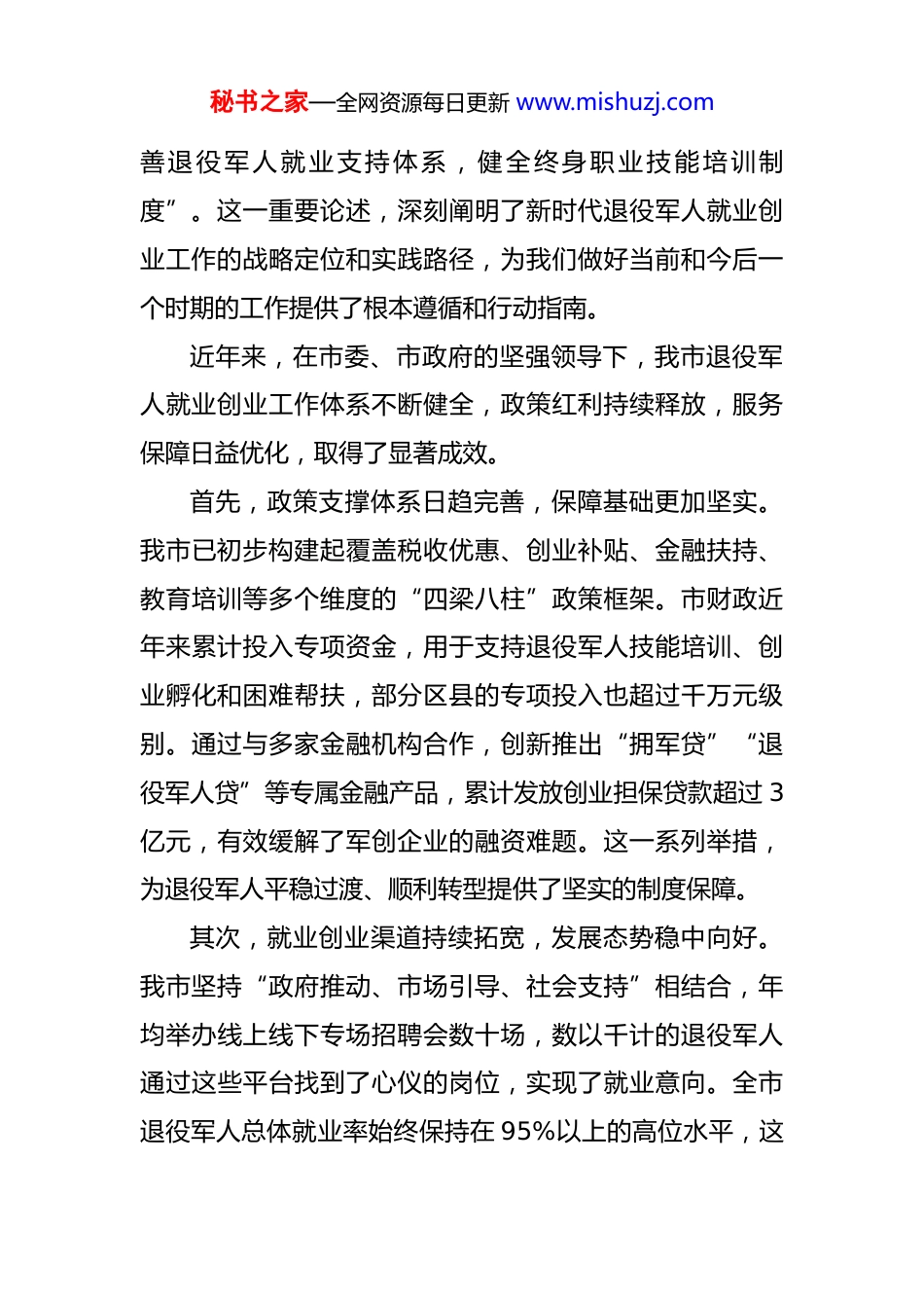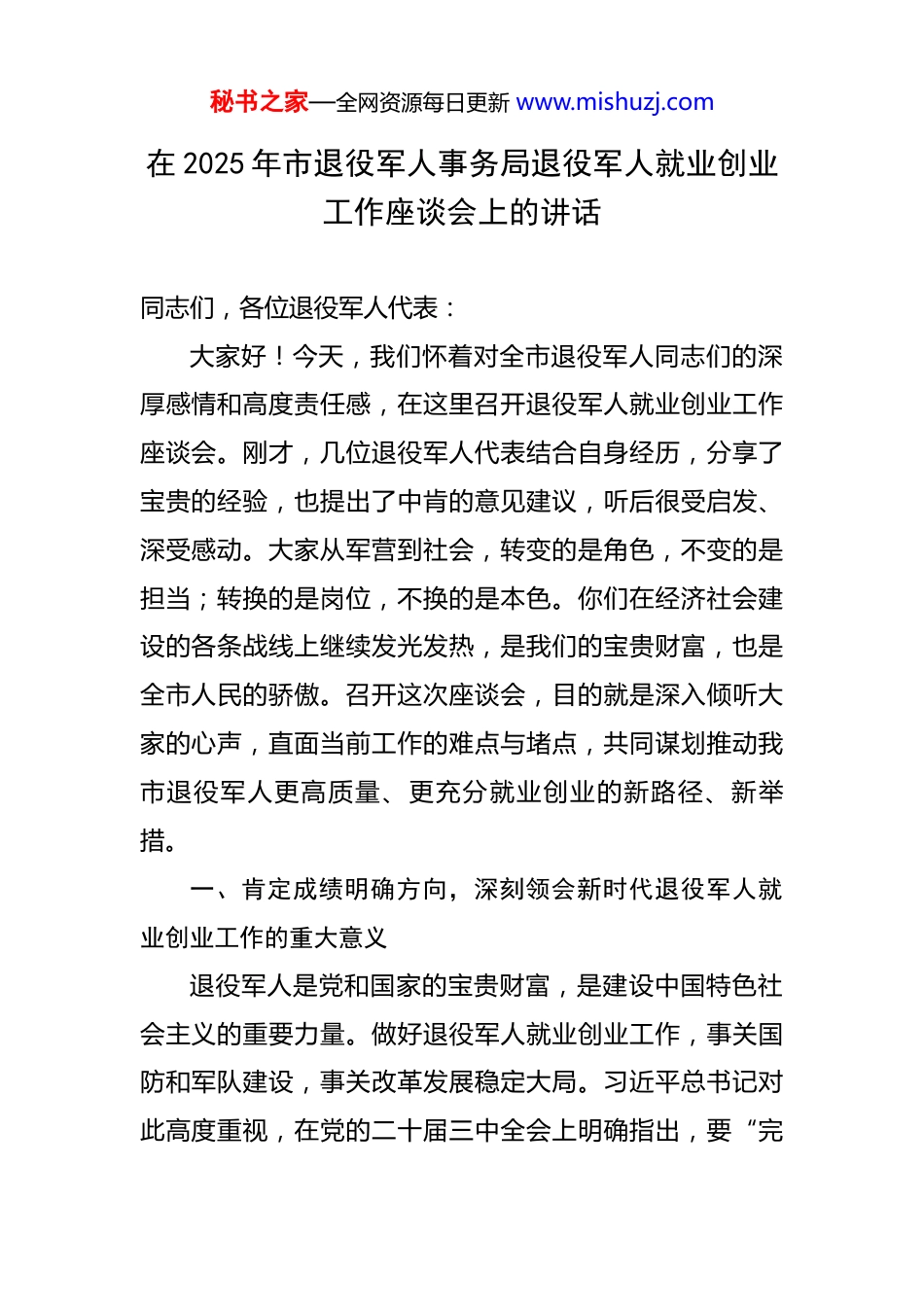秘书之家—全网资源每日更新 www.mishuzj.com在 2025 年市退役军人事务局退役军人就业创业工作座谈会上的讲话 同志们,各位退役军人代表:大家好!今天,我们怀着对全市退役军人同志们的深厚感情和高度责任感,在这里召开退役军人就业创业工作座谈会。刚才,几位退役军人代表结合自身经历,分享了宝贵的经验,也提出了中肯的意见建议,听后很受启发、深受感动。大家从军营到社会,转变的是角色,不变的是担当;转换的是岗位,不换的是本色。你们在经济社会建设的各条战线上继续发光发热,是我们的宝贵财富,也是全市人民的骄傲。召开这次座谈会,目的就是深入倾听大家的心声,直面当前工作的难点与堵点,共同谋划推动我市退役军人更高质量、更充分就业创业的新路径、新举措。一、肯定成绩明确方向,深刻领会新时代退役军人就业创业工作的重大意义退役军人是党和国家的宝贵财富,是建设中国特色社会主义的重要力量。做好退役军人就业创业工作,事关国防和军队建设,事关改革发展稳定大局。习近平总书记对此高度重视,在党的二十届三中全会上明确指出,要“完秘书之家—全网资源每日更新 www.mishuzj.com善退役军人就业支持体系,健全终身职业技能培训制度”。这一重要论述,深刻阐明了新时代退役军人就业创业工作的战略定位和实践路径,为我们做好当前和今后一个时期的工作提供了根本遵循和行动指南。近年来,在市委、市政府的坚强领导下,我市退役军人就业创业工作体系不断健全,政策红利持续释放,服务保障日益优化,取得了显著成效。首先,政策支撑体系日趋完善,保障基础更加坚实。我市已初步构建起覆盖税收优惠、创业补贴、金融扶持、教育培训等多个维度的“四梁八柱”政策框架。市财政近年来累计投入专项资金,用于支持退役军人技能培训、创业孵化和困难帮扶,部分区县的专项投入也超过千万元级别。通过与多家金融机构合作,创新推出“拥军贷”“退役军人贷”等专属金融产品,累计发放创业担保贷款超过 3亿元,有效缓解了军创企业的融资难题。这一系列举措,为退役军人平稳过渡、顺利转型提供了坚实的制度保障。其次,就业创业渠道持续拓宽,发展态势稳中向好。我市坚持“政府推动、市场引导、社会支持”相结合,年均举办线上线下专场招聘会数十场,数以千计的退役军人通过这些平台找到了心仪的岗位,实现了就业意向。全市退役军人总体就业率始终保持在 95%以上的高位水平,这秘书之家—全网资源每日更新 www.mishuzj.com充分证明了我们的工作是扎实有效的。同时,创业活力竞相迸发。全市涌现出一大批军创企业和创业典型,他们在高新技术、现代农业、智能制造、生活服务等多个领域开疆拓土,成为推动区域经济发展的一支重要力量。据不完全统计,我市由退役军人创办的市场主体已超过 9000 家,吸纳带动了大量社会就业。再次,先进典型示范效应凸显,社会尊崇氛围日益浓厚。在座的各位就是杰出代表,在全市范围内,这样的例子还有很多。有退役军人投身前沿科技,带领团队研发的“MR 全息应用训练系统”在全国创业创新大赛中斩获一等奖,实现了从“操纵钢枪”到“驾驭算法”的华丽转身。有退役军人扎根广袤乡村,流转土地百余亩发展现代种植园,年产值超过 120 万元,并积极采用“公司+农户”模式,带领乡亲们共同致富,其直播带货月营业额高达 300多万元,成为乡村振兴的“兵支书”和“领头雁”。更有退役军人企业家群体,在*区创办的企业集群年产值高达27 亿元,年纳税额超过 4200 万元,展现了惊人的经济能量和社会贡献。这些鲜活的案例,生动诠释了“退役不褪色、建功新时代”的铮铮誓言,也为广大退役军人树立了可学可赶的标杆。这些成绩的取得,离不开市委、市政府的正确领导,秘书之家—全网资源每日更新 www.mishuzj.com离不开各部门的通力协作,也离不开像*军创会这样的社会组织的桥梁纽带作用,更离不开像*网络有限公司等一大批有拥军情怀的企业的鼎力支持。在此,向所有关心支持退役军人事业的社会各界人士,表示衷心的感谢!二、正视挑战剖析短板,精准把握当前工作面临的现实问题在肯定成绩的同时,也必须清醒地认识到,对照新形势新任务的要求,...