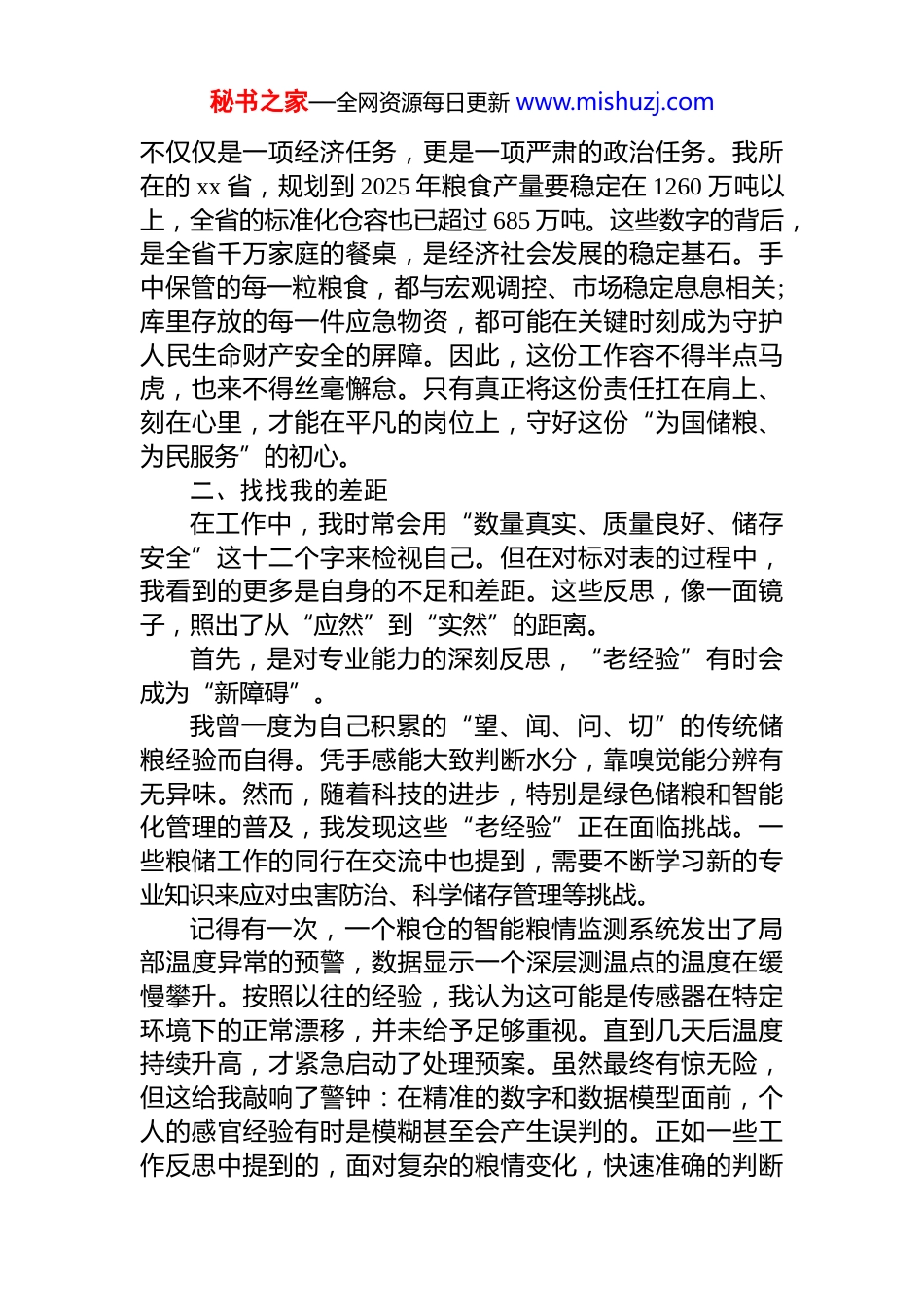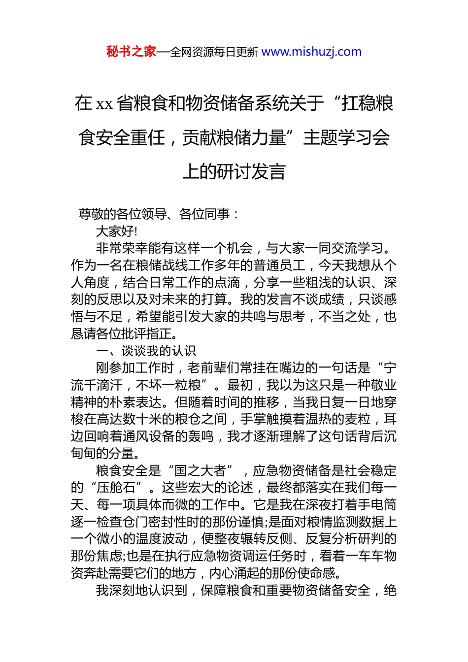 秘书之家—全网资源每日更新 www.mishuzj.com在 xx 省粮食和物资储备系统关于“扛稳粮食安全重任,贡献粮储力量”主题学习会上的研讨发言尊敬的各位领导、各位同事:大家好!非常荣幸能有这样一个机会,与大家一同交流学习。作为一名在粮储战线工作多年的普通员工,今天我想从个人角度,结合日常工作的点滴,分享一些粗浅的认识、深刻的反思以及对未来的打算。我的发言不谈成绩,只谈感悟与不足,希望能引发大家的共鸣与思考,不当之处,也恳请各位批评指正。一、谈谈我的认识刚参加工作时,老前辈们常挂在嘴边的一句话是“宁流千滴汗,不坏一粒粮”。最初,我以为这只是一种敬业精神的朴素表达。但随着时间的推移,当我日复一日地穿梭在高达数十米的粮仓之间,手掌触摸着温热的麦粒,耳边回响着通风设备的轰鸣,我才逐渐理解了这句话背后沉甸甸的分量。粮食安全是“国之大者”,应急物资储备是社会稳定的“压舱石”。这些宏大的论述,最终都落实在我们每一天、每一项具体而微的工作中。它是我在深夜打着手电筒逐一检查仓门密封性时的那份谨慎;是面对粮情监测数据上一个微小的温度波动,便整夜辗转反侧、反复分析研判的那份焦虑;也是在执行应急物资调运任务时,看着一车车物资奔赴需要它们的地方,内心涌起的那份使命感。我深刻地认识到,保障粮食和重要物资储备安全,绝秘书之家—全网资源每日更新 www.mishuzj.com不仅仅是一项经济任务,更是一项严肃的政治任务。我所在的 xx 省,规划到 2025 年粮食产量要稳定在 1260 万吨以上,全省的标准化仓容也已超过 685 万吨。这些数字的背后,是全省千万家庭的餐桌,是经济社会发展的稳定基石。手中保管的每一粒粮食,都与宏观调控、市场稳定息息相关;库里存放的每一件应急物资,都可能在关键时刻成为守护人民生命财产安全的屏障。因此,这份工作容不得半点马虎,也来不得丝毫懈怠。只有真正将这份责任扛在肩上、刻在心里,才能在平凡的岗位上,守好这份“为国储粮、为民服务”的初心。二、找找我的差距在工作中,我时常会用“数量真实、质量良好、储存安全”这十二个字来检视自己。但在对标对表的过程中,我看到的更多是自身的不足和差距。这些反思,像一面镜子,照出了从“应然”到“实然”的距离。首先,是对专业能力的深刻反思,“老经验”有时会成为“新障碍”。我曾一度为自己积累的“望、闻、问、切”的传统储粮经验而自得。凭手感能大致判断水分,靠嗅觉能分辨有无异味。然而,随着科技的进步,特别是绿色储粮和智能化管理的普及,我发现这些“老经验”正在面临挑战。一些粮储工作的同行在交流中也提到,需要不断学习新的专业知识来应对虫害防治、科学储存管理等挑战。记得有一次,一个粮仓的智能粮情监测系统发出了局部温度异常的预警,数据显示一个深层测温点的温度在缓慢攀升。按照以往的经验,我认为这可能是传感器在特定环境下的正常漂移,并未给予足够重视。直到几天后温度持续升高,才紧急启动了处理预案。虽然最终有惊无险,但这给我敲响了警钟:在精准的数字和数据模型面前,个人的感官经验有时是模糊甚至会产生误判的。正如一些工作反思中提到的,面对复杂的粮情变化,快速准确的判断秘书之家—全网资源每日更新 www.mishuzj.com和决策能力至关重要,而我的反应显然不够迅速。我反思自己,满足于做一名“经验型”的保管员,却在向“技能型”“智慧型”人才转变的路上掉了队。其次,是对工作作风的深刻反思,“差不多”思想是最大的敌人。粮储工作繁杂琐碎,日复一日的巡查、检测、记录,容易让人产生麻痹思想和“差不多”心态。我必须坦诚,自己也曾犯过这样的错误。比如,在完成一项复杂的通风作业后,因为身体疲惫,就想着检查记录晚点再补,觉得“差不多”记得清楚。但有一次,正因为晚记了几个小时导致对一个关键数据的记忆出现了偏差,在后续的粮情分析会上,我的数据和同事的记录对不上,虽然只是一个小差错,却让我满脸通红。这次经历让我深刻认识到,粮储工作没有“差不多”,只有“是”或者“不是”。正如一些工作总结中反思的那样,检查粮情后未能及时记录,是导致错记漏记的根源之一。我们的工...