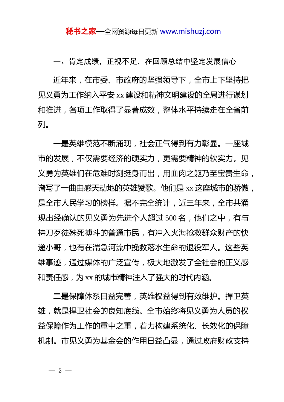 秘书之家—全网资源每日更新 www.mishuzj.com在 xx 市见义勇为工作会议上的讲话同志们:今天,我们在此隆重召开全市见义勇为工作会议,主要任务是深入学习贯彻******关于见义勇为事业的****精神,全面落实第十五届全国见义勇为英雄模范表彰大会、全国及全省见义勇为工作会议的部署要求,总结我市近年来的工作成效,分析当前形势,研究部署下一阶段重点任务,推动我市见义勇为事业再上新台阶。刚才,xx 同志和 xx 同志作为见义勇为代表作了发言,事迹感人至深,精神催人奋进;xx 镇和 xx 镇分享了他们在基层一线推进见义勇为工作的宝贵经验,听后很受启发。会前,市委 xx书记、xx 市长亲切会见了见义勇为代表,充分体现了市委、市政府对见义勇为事业的高度重视和对见义勇为英雄的崇高敬意。在此,我代表市委、市政府,向受到表彰的见义勇为英雄模范,向长期以来关心、支持和参与我市见义勇为事业的社会各界人士,以及辛勤工作在见义勇为战线上的全体同志,表示衷心的感谢和崇高的敬意!— 1 —秘书之家—全网资源每日更新 www.mishuzj.com一、肯定成绩,正视不足,在回顾总结中坚定发展信心近年来,在市委、市政府的坚强领导下,全市上下坚持把见义勇为工作纳入平安 xx 建设和精神文明建设的全局进行谋划和推进,各项工作取得了显著成效,整体水平持续走在全省前列。一是英雄模范不断涌现,社会正气得到有力彰显。一座城市的发展,不仅需要经济的硬实力,更需要精神的软实力。见义勇为英雄们在危难时刻挺身而出,用血肉之躯乃至宝贵生命,谱写了一曲曲感天动地的英雄赞歌。他们是 xx 这座城市的骄傲,是全市人民学习的榜样。据不完全统计,近三年来,全市共涌现出经确认的见义勇为先进个人超过 500 名,他们之中,有与持刀歹徒殊死搏斗的普通市民,有冲入火海抢救群众财产的快递小哥,也有在湍急河流中挽救落水生命的退役军人。这些英雄事迹,通过媒体的广泛宣传,极大地激发了全社会的正义感和责任感,为 xx 的城市精神注入了强大的时代内涵。二是保障体系日益完善,英雄权益得到有效维护。捍卫英雄,就是捍卫社会的良知底线。全市始终将见义勇为人员的权益保障作为工作的重中之重,着力构建系统化、长效化的保障机制。市见义勇为基金会的作用日益凸显,通过政府财政支持— 2 —秘书之家—全网资源每日更新 www.mishuzj.com和社会各界踊跃捐赠,截至目前,基金总额已累计达到近千万元。这些资金被专项用于奖励、抚恤、慰问和帮扶见义勇为人员及其家庭确保了英雄“流血不流泪”。同时,我市在制度建设上先行先试,逐步建立起涵盖医疗救治、生活补助、就业扶持、子女教育优待等多个方面的综合保障体系。例如,开通了见义勇为负伤人员医疗救治“绿色通道”,确保伤者得到最及时、最有效的治疗;对符合条件的见义勇为人员家庭,在住房保障、困难补助等方面给予优先考虑切实解决了英雄的后顾之忧。三是社会氛围持续向好,崇尚正义成为普遍共识。全市坚持创新宣传方式,着力营造“崇尚英雄、学习英雄、关爱英雄”的浓厚社会氛围。通过举办“见义勇为宣传日”、开展主题宣传周活动、建设见义勇为主题公园和主题公交线路等多种形式,让英雄事迹家喻户晓,让见义勇为精神深入人心。各类媒体平台积极发声,运用短视频、网络直播等群众喜闻乐见的形式,生动讲述英雄故事,推动全社会形成了崇德向善、见贤思齐的价值共识,极大地提升了市民参与社会治理的积极性。在肯定成绩的同时,我们也要清醒地认识到工作中存在的短板和不足。比如,见义勇为权益保障的覆盖面和精准度仍有— 3 —秘书之家—全网资源每日更新 www.mishuzj.com提升空间,部分长效机制的落地执行还不够顺畅;宣传工作的广度和深度有待进一步拓展,全社会的参与度还需要持续提高;“*委领导、政府负责、政法协调、部门协同、社会参与”的工作格局在某些领域还需进一步压实责任、强化协同。对于这些问题,我们必须高度重视,并在今后的工作中采取有力措施,切实加以解决。二、提高站位,深化认识,在时代变局中把握事业方向******指出,“见义勇为精神是中华民族的传统美德,是社会主义核心价值观的重...