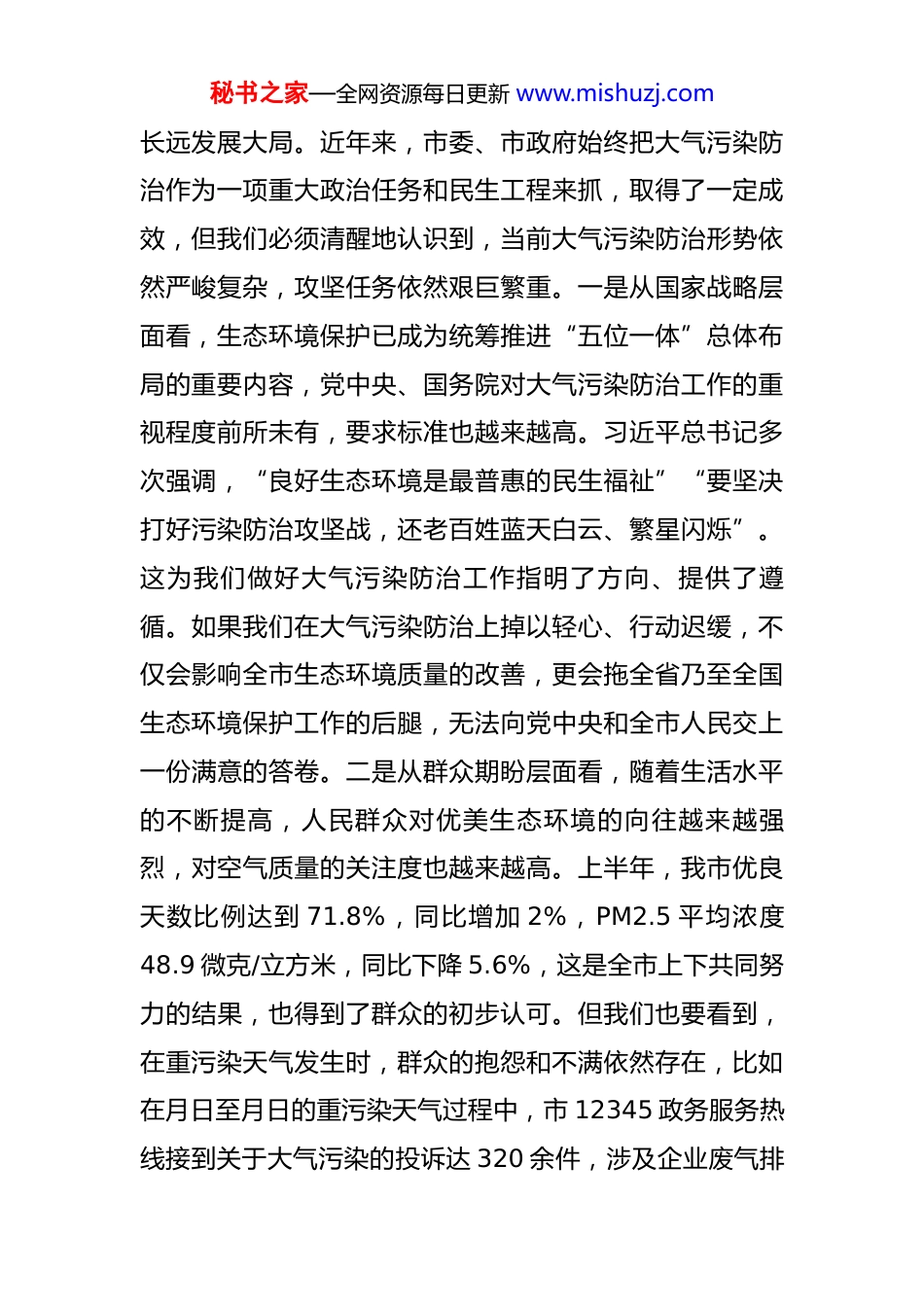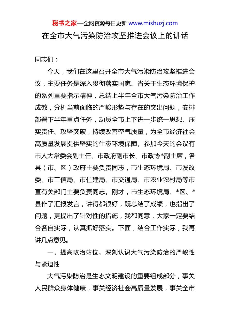秘书之家—全网资源每日更新 www.mishuzj.com在全市大气污染防治攻坚推进会议上的讲话 同志们:今天,我们在这里召开全市大气污染防治攻坚推进会议,主要任务是深入贯彻落实国家、省关于生态环境保护的系列重要指示精神,总结上半年全市大气污染防治工作成效,分析当前面临的严峻形势与存在的突出问题,安排部署下半年重点任务,动员全市上下进一步统一思想、压实责任、攻坚突破,持续改善空气质量,为全市经济社会高质量发展提供坚实的生态环境保障。参加今天的会议有市人大常委会副主任、市政府副市长、市政协*副主席,各县(市、区)政府主要负责同志,市生态环境局、市发改委、市工信局、市住建局、市交通局、市农业农村局等市直有关部门主要负责同志。刚才,市生态环境局、*区、*县作了汇报发言,讲得都很好,既总结了成绩,也指出了问题,更提出了针对性的措施,我都同意,大家一定要结合各自实际,认真抓好落实。下面,结合工作实际,我再讲几点意见。一、提高政治站位,深刻认识大气污染防治的严峻性与紧迫性大气污染防治是生态文明建设的重要组成部分,事关人民群众身体健康,事关经济社会高质量发展,事关全市秘书之家—全网资源每日更新 www.mishuzj.com长远发展大局。近年来,市委、市政府始终把大气污染防治作为一项重大政治任务和民生工程来抓,取得了一定成效,但我们必须清醒地认识到,当前大气污染防治形势依然严峻复杂,攻坚任务依然艰巨繁重。一是从国家战略层面看,生态环境保护已成为统筹推进“五位一体”总体布局的重要内容,党中央、国务院对大气污染防治工作的重视程度前所未有,要求标准也越来越高。习近平总书记多次强调,“良好生态环境是最普惠的民生福祉”“要坚决打好污染防治攻坚战,还老百姓蓝天白云、繁星闪烁”。这为我们做好大气污染防治工作指明了方向、提供了遵循。如果我们在大气污染防治上掉以轻心、行动迟缓,不仅会影响全市生态环境质量的改善,更会拖全省乃至全国生态环境保护工作的后腿,无法向党中央和全市人民交上一份满意的答卷。二是从群众期盼层面看,随着生活水平的不断提高,人民群众对优美生态环境的向往越来越强烈,对空气质量的关注度也越来越高。上半年,我市优良天数比例达到 71.8%,同比增加 2%,PM2.5 平均浓度48.9 微克/立方米,同比下降 5.6%,这是全市上下共同努力的结果,也得到了群众的初步认可。但我们也要看到,在重污染天气发生时,群众的抱怨和不满依然存在,比如在月日至月日的重污染天气过程中,市 12345 政务服务热线接到关于大气污染的投诉达 320 余件,涉及企业废气排秘书之家—全网资源每日更新 www.mishuzj.com放、工地扬尘、秸秆焚烧等多个方面。这充分说明,我们的工作与群众的期盼还有不小差距,必须下更大决心、花更大力气加以解决。三是从发展大局层面看,良好的生态环境是经济社会高质量发展的重要支撑。当前,各地都在抢抓绿色低碳发展机遇,谁能在生态环境保护上占据主动,谁就能在区域竞争中赢得优势。如果我们不能有效改善空气质量,不仅会影响招商引资和项目落地,还会制约产业结构优化升级。上半年,我市某重点招商项目因周边空气质量不达标,导致项目环评审批延迟,影响了项目开工进度,这一教训十分深刻。因此,抓好大气污染防治工作,不仅是生态问题,更是发展问题,必须统筹兼顾、协同推进。二、肯定成绩成效,准确把握大气污染防治工作的良好态势上半年,全市各级各部门深入贯彻落实市委、市政府决策部署,聚焦大气环境质量改善目标,攻坚克难、真抓实干,大气污染防治工作取得了阶段性成效,为全年目标任务的完成奠定了坚实基础。(一)工业减排攻坚取得显著突破。一是资金投入力度持续加大。积极争取上级资金支持,先后成功申报中央大气专项资金项目 36 个,获资 1.86 亿元,这些资金主要用于企业脱硫脱硝、VOCs 治理、除尘设施升级等重点项秘书之家—全网资源每日更新 www.mishuzj.com目。同时,市级财政配套资金 5000 万元,各县(市、区)也累计投入资金 2.3 亿元,形成了多元化的资金投入机制。比如*县为推动辖区内化工企业治理,县财政专门拿出8000 万...
