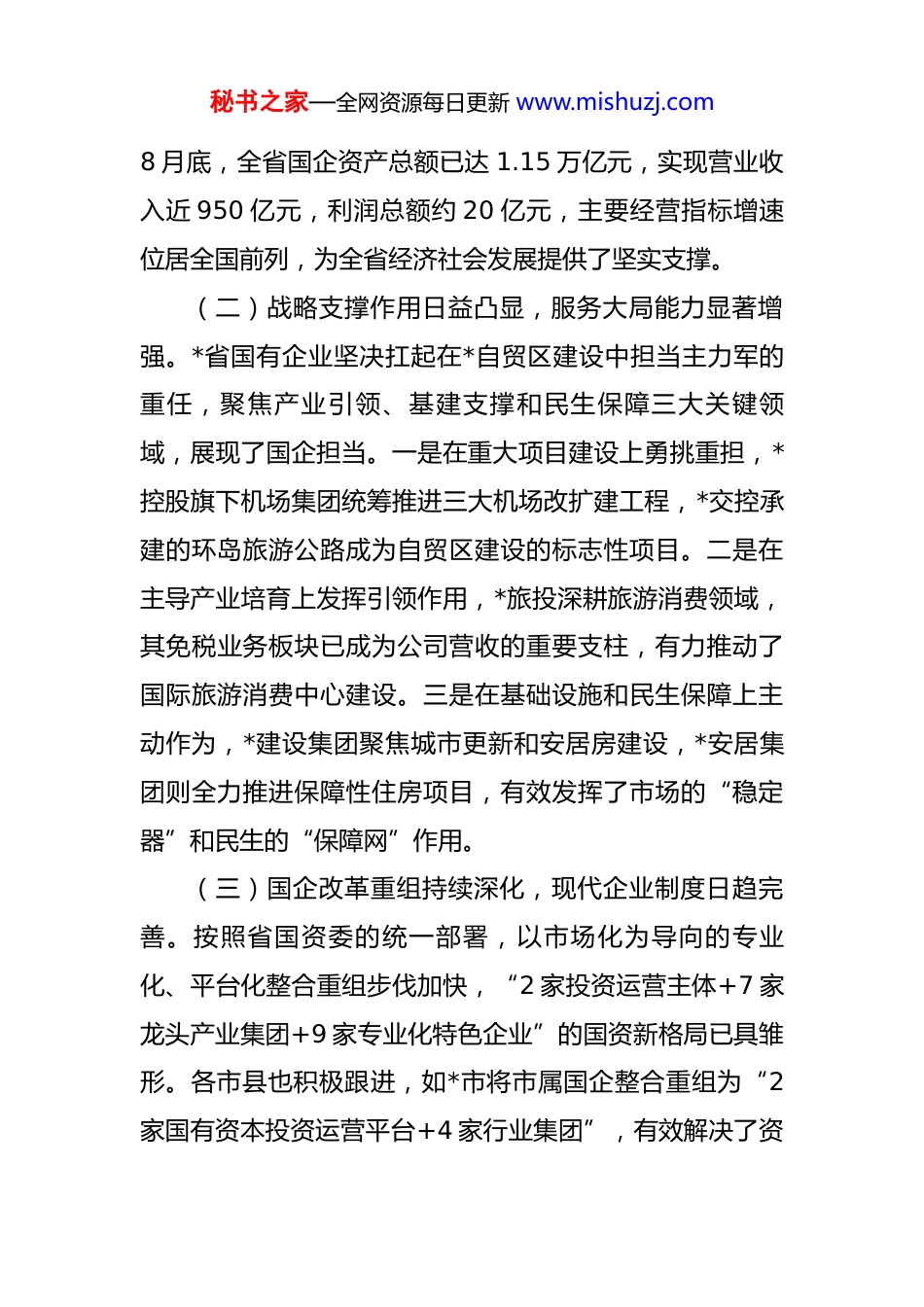 秘书之家—全网资源每日更新 www.mishuzj.com关于全省国有企业落实“两个一以贯之”将党的领导融入公司治理情况的调研报告 为深入贯彻落实习近平总书记关于国有企业改革发展和党的建设的重要论述,特别是关于“两个一以贯之”的重要指示精神,我们围绕*省国有企业将党的领导融入公司治理的实际情况开展了专题调研。本次调研通过座谈访谈、查阅资料等方式,对省内部分重点国有企业进行了深入了解,旨在总结经验、分析问题、提出对策,以期推动我省国有企业治理体系和治理能力现代化迈上新台阶。一、基本情况近年来,*省委、省政府高度重视国资国企工作,将其置于*自贸区建设的全局中统筹推进,全省国有企业紧抓改革机遇,发展步入快车道,战略支撑作用日益凸显。(一)总体规模稳步增长,发展质量持续提升。近年来,*省国有企业资产规模和效益实现跨越式增长。数据显示,2022 年省国资委重点监管企业资产总额首次突破4000 亿元大关,相较于 2020 年前,资产超百亿的企业数量大幅增加,彻底改变了过去“小、散、弱”的局面。截至 2024 年底,全省国有企业资产总额已突破 1 万亿元。进入 2025 年,增长势头不减,据初步统计,截至 2025 年秘书之家—全网资源每日更新 www.mishuzj.com8 月底,全省国企资产总额已达 1.15 万亿元,实现营业收入近 950 亿元,利润总额约 20 亿元,主要经营指标增速位居全国前列,为全省经济社会发展提供了坚实支撑。(二)战略支撑作用日益凸显,服务大局能力显著增强。*省国有企业坚决扛起在*自贸区建设中担当主力军的重任,聚焦产业引领、基建支撑和民生保障三大关键领域,展现了国企担当。一是在重大项目建设上勇挑重担,*控股旗下机场集团统筹推进三大机场改扩建工程,*交控承建的环岛旅游公路成为自贸区建设的标志性项目。二是在主导产业培育上发挥引领作用,*旅投深耕旅游消费领域,其免税业务板块已成为公司营收的重要支柱,有力推动了国际旅游消费中心建设。三是在基础设施和民生保障上主动作为,*建设集团聚焦城市更新和安居房建设,*安居集团则全力推进保障性住房项目,有效发挥了市场的“稳定器”和民生的“保障网”作用。(三)国企改革重组持续深化,现代企业制度日趋完善。按照省国资委的统一部署,以市场化为导向的专业化、平台化整合重组步伐加快,“2 家投资运营主体+7 家龙头产业集团+9 家专业化特色企业”的国资新格局已具雏形。各市县也积极跟进,如*市将市属国企整合重组为“2家国有资本投资运营平台+4 家行业集团”,有效解决了资秘书之家—全网资源每日更新 www.mishuzj.com源分散、同质化竞争等问题。通过国企改革三年行动,绝大多数企业已基本建立起权责清晰、运转协调、有效制衡的现代企业制度,董事会应建尽建,法人治理结构得到根本性优化。二、主要做法与经验*省国有企业在改革发展中取得的显著成效,根源在于始终坚持党的领导、加强党的建设。各企业深入落实“两个一以贯之”要求,探索出了一系列将党的领导融入公司治理的有效做法。(一)强化顶层设计,确保党的领导全面制度化。一是普遍完成“党建入章”工作。调研企业均已将党建工作要求写入公司章程,明确了党组织在公司法人治理结构中的法定地位,为党组织发挥作用提供了根本制度保障。章程中详细规定了党组织的职责权限、机构设置、运行机制、经费保障等内容,使党的领导有章可循、有规可依。二是清晰界定各治理主体权责边界。各企业普遍按照“党委(党组)把方向、管大局、保落实,董事会定战略、作决策、防风险,经理层谋经营、抓落实、强管理”的原则,制定或修订了党委会、董事会、总经理办公会议事规则,厘清了各自的权责边界。通过建立权责对等、运转协调、有效制衡的决策执行监督机制,避免了党委包揽一切秘书之家—全网资源每日更新 www.mishuzj.com或虚化弱化的问题。三是完善“三重一大”决策制度。各企业结合实际,制定了“三重一大”决策事项清单,明确了重大决策、重要人事任免、重大项目安排和大额资金运作的具体范围和标准。同时,规范决策程序,要求“三重一大”事项必须经党委会前置研究讨论,再由董事会或经理层按法...