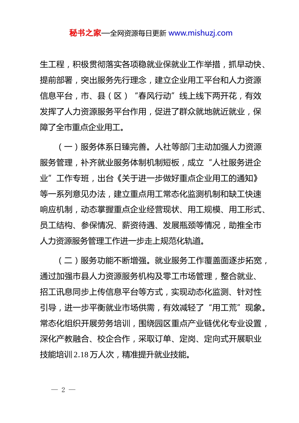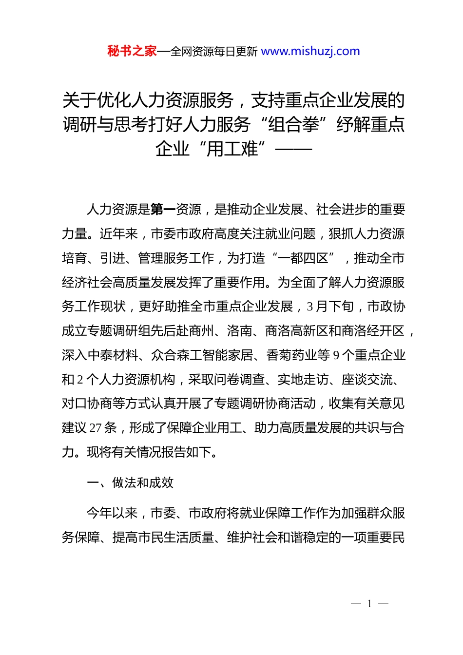 秘书之家—全网资源每日更新 www.mishuzj.com关于优化人力资源服务,支持重点企业发展的调研与思考打好人力服务“组合拳”纾解重点企业“用工难”——人力资源是第一资源,是推动企业发展、社会进步的重要力量。近年来,市委市政府高度关注就业问题,狠抓人力资源培育、引进、管理服务工作,为打造“一都四区”,推动全市经济社会高质量发展发挥了重要作用。为全面了解人力资源服务工作现状,更好助推全市重点企业发展,3 月下旬,市政协成立专题调研组先后赴商州、洛南、商洛高新区和商洛经开区,深入中泰材料、众合森工智能家居、香菊药业等 9 个重点企业和 2 个人力资源机构,采取问卷调查、实地走访、座谈交流、对口协商等方式认真开展了专题调研协商活动,收集有关意见建议 27 条,形成了保障企业用工、助力高质量发展的共识与合力。现将有关情况报告如下。一、做法和成效今年以来,市委、市政府将就业保障工作作为加强群众服务保障、提高市民生活质量、维护社会和谐稳定的一项重要民— 1 —秘书之家—全网资源每日更新 www.mishuzj.com生工程,积极贯彻落实各项稳就业保就业工作举措,抓早动快、提前部署,突出服务先行理念,建立企业用工平台和人力资源信息平台,市、县(区)“春风行动”线上线下两开花,有效发挥了人力资源服务平台作用,促进了群众就地就近就业,保障了全市重点企业用工。(一)服务体系日臻完善。人社等部门主动加强人力资源服务管理,补齐就业服务体制机制短板,成立“人社服务进企业”工作专班,出台《关于进一步做好重点企业用工的通知》等一系列意见办法,建立重点用工常态化监测机制和缺工快速响应机制,动态掌握重点企业经营现状、用工规模、用工形式、员工结构、参保情况、薪资待遇、发展瓶颈等情况,助推全市人力资源服务管理工作进一步走上规范化轨道。(二)服务功能不断增强。就业服务工作覆盖面逐步拓宽,通过加强市县人力资源服务机构及零工市场管理,整合就业、招工讯息同步上传信息平台等方式,实现动态化监测、针对性引导,进一步平衡就业市场供需,有效减轻了“用工荒”现象。常态化组织开展劳务培训,围绕园区重点产业链优化专业设置,深化产教融合、校企合作,采取订单、定岗、定向式开展职业技能培训 2.18 万人次,精准提升就业技能。— 2 —秘书之家—全网资源每日更新 www.mishuzj.com(三)服务质量持续提升。“一个企业、一名专员、一份档案”工作机制逐渐完善,明确专人服务、专人对接,加强人社部门与企业间主动联系,定期深入企业一线走访,精准高效及时了解企业诉求,解决实际难题。人力资源服务重心由“重点企业”向“园区企业”扩散、服务窗口由“线下多点分散”向“线上线下集中”靠拢、服务方式由传统的“依靠申请”向“主动介入”转变,有效保障了企业用工需求、有序落实了惠企利企政策。(四)企业经营更加规范。我市一些重点企业将打造素质过硬人才队伍作为促进企业可持续发展的重要策略,以“人”为重要着力点,规范薪酬管理、科学职业规划、打造舒适环境,让员工甘于、乐于、安于留下。众合森工为员工制定了从初级工到专家,从员工到项目经理,从专员到总经理,从培训师到商学院院长的四条通道、五级职业发展蓝图;中泰材料为技术人员提供新建实验室和研发中心等科研配套设施,免费四餐、独立住宿、探亲假等生活保障等,有效增强了存量人才的进取积极性和信心,提升了企业声誉和就业吸引力。(五)就业引才成效明显。培育、引进并举,人力资源服务机构从无到有、由小变大,通过畅通招聘求职信息发布渠道、— 3 —秘书之家—全网资源每日更新 www.mishuzj.com举办重点企业专场招聘会、鼓励开展校企劳务协作等多途径搭建供需平台,拓宽企业招聘渠道和招工匹配效率,全市现有各类人力资源服务机构 134 家,累计举办各类线上线下招聘会 230场次,提供就业岗位 9.5 万个,帮助 148 家重点企业解决用工3390 人,企业用工需求、群众就业需求得到了较好满足。(六)发展环境稳步向好。人社、发改、工信、财政等部门和本地院校协作配合进一步加强,定期召开就业工作联席座谈会,充分发挥职能,...