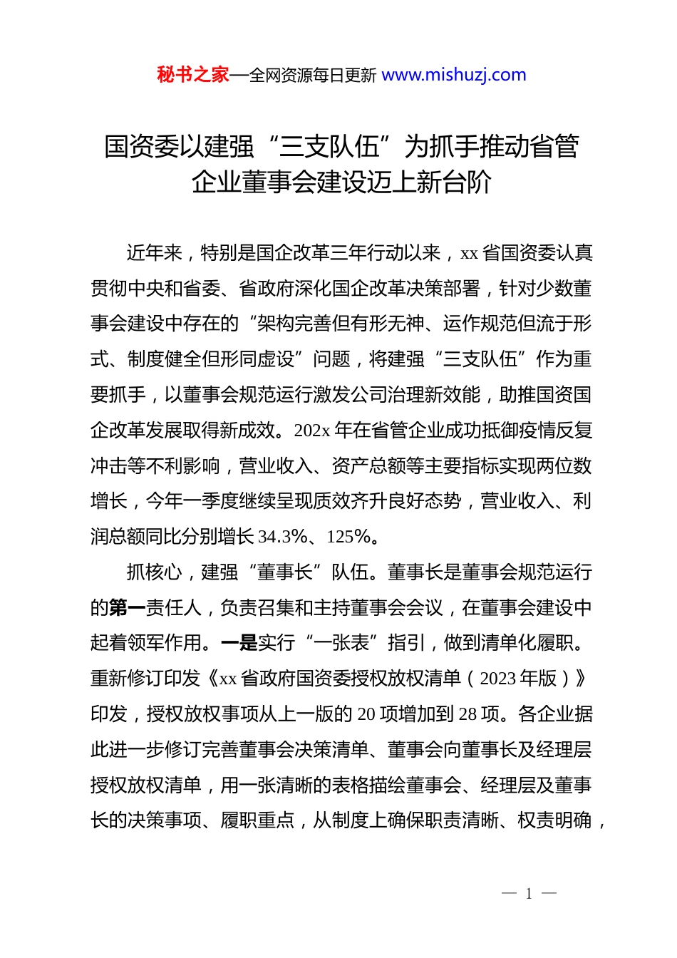 秘书之家—全网资源每日更新 www.mishuzj.com国资委以建强“三支队伍”为抓手推动省管企业董事会建设迈上新台阶近年来,特别是国企改革三年行动以来,xx 省国资委认真贯彻中央和省委、省政府深化国企改革决策部署,针对少数董事会建设中存在的“架构完善但有形无神、运作规范但流于形式、制度健全但形同虚设”问题,将建强“三支队伍”作为重要抓手,以董事会规范运行激发公司治理新效能,助推国资国企改革发展取得新成效。202x 年在省管企业成功抵御疫情反复冲击等不利影响,营业收入、资产总额等主要指标实现两位数增长,今年一季度继续呈现质效齐升良好态势,营业收入、利润总额同比分别增长 34.3%、125%。抓核心,建强“董事长”队伍。董事长是董事会规范运行的第一责任人,负责召集和主持董事会会议,在董事会建设中起着领军作用。一是实行“一张表”指引,做到清单化履职。重新修订印发《xx 省政府国资委授权放权清单(2023 年版)》印发,授权放权事项从上一版的 20 项增加到 28 项。各企业据此进一步修订完善董事会决策清单、董事会向董事长及经理层授权放权清单,用一张清晰的表格描绘董事会、经理层及董事长的决策事项、履职重点,从制度上确保职责清晰、权责明确,— 1 —秘书之家—全网资源每日更新 www.mishuzj.com各治理主体相互制衡、协调运转格局基本形成。二是开展“多维度”测评,实现常态化评价。印发《省管企业董事会和董事评价办法》,聚焦董事会功能定位和作用发挥,建立“企业内部评价+出资人评价+日常评价”多维度测评体系,从董事(董事长)的行为操守和履职贡献,以及董事会运行的规范性和有效性等维度,分别明确 15 条、20 条评价内容和要点,建立外部董事业务评价和董事会运行评价机制,形成与领导班子年度综合考评结果相互印证的评价意见、评价等次,评价结果作为董事组织调整的重要依据。在年度评价中,同步开展董事长述职暨质询专题会议,采取集中述职、当面点评、质询问询、现场测评等方式,听取省管企业董事长述职并进行质询评价。目前,已对 19 户省管企业董事会 202x 年度履职情况进行了考评。三是实施“穿透式”监督,推动专业化归位。当前,不少企业董事长过多陷于具体经营事项,在研究战略、谋划大事、推动落实上关注度、参与度不够。采取出资人派人列席董事会、董事长述职质询、智能监管平台视频调阅、下发工作提示函等方式,强力推动省管企业董事长职责回归,紧紧围绕董事会“定战略、作决策、防风险”职责定位开展工作,真正成为董事会工作“带头人”、把握战略发展方向的“领航人”、各治理主体沟通对话“话事人”、推动决策有效执行“督查人”。— 2 —秘书之家—全网资源每日更新 www.mishuzj.com抓关键,建强“外部董事”队伍。董事会中外部董事占多数后,从一定程度上,外部董事在董事会决策中起着决定性作用,外部董事履职也要实现三个转变,即由点(个人)到面(外部董事团体)、局部(自身专业)到整体(站位企业全局)、决策到决策及跟踪落实。一是建设复合型队伍。坚持专兼职并重,分法律、财会、金融、民营企业家、省企央企领导人员等类别,建立外部董事人才库。委派时,在实现“外大于内”的同时,结合企业实际,注重分析董事会的专业结构、知识结构、年龄结构、工作经验等多个维度,较好地改变了以往多数企业“全员内部董事、经理层与董事会成员高度重合、董事专业结构单一”的局面,推动董事会结构更加合理、决策更加科学。目前,共委派外部董事 46 名,其中专职外部董事 7 名,兼职外部董事 39 名(法律 14 人,财会 8 人,民营企业家 5 名,大学教授 8 人,央企领导人员 4 人)。二是实行体系化管理。着眼流程全、工作细、操作实、管理严四项要点,出台了《关于进一步规范和加强外部董事履职管理的若干措施》《省管企业外部董事履职指引(试行)》,系统建立规范外部董事履职的“三项制度”(召集人、工作报告、工作例会)、“五项机制”(异常表决反馈、考核评价、问责、沟通联络、能力培养)、“两个保障”(履职支撑、履职记实),对履职原则、— 3 —秘书之家—全网资源每...