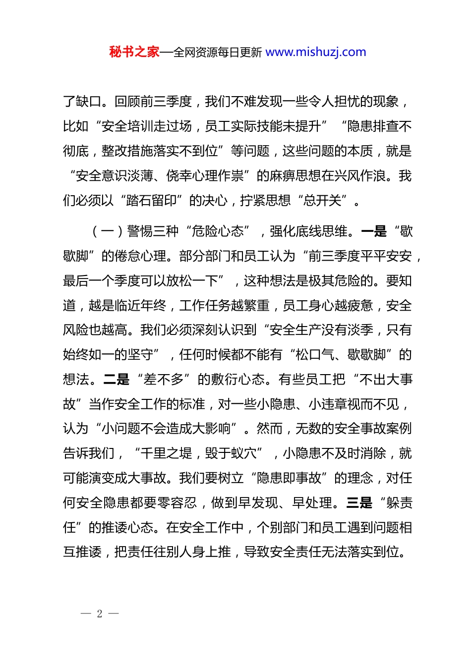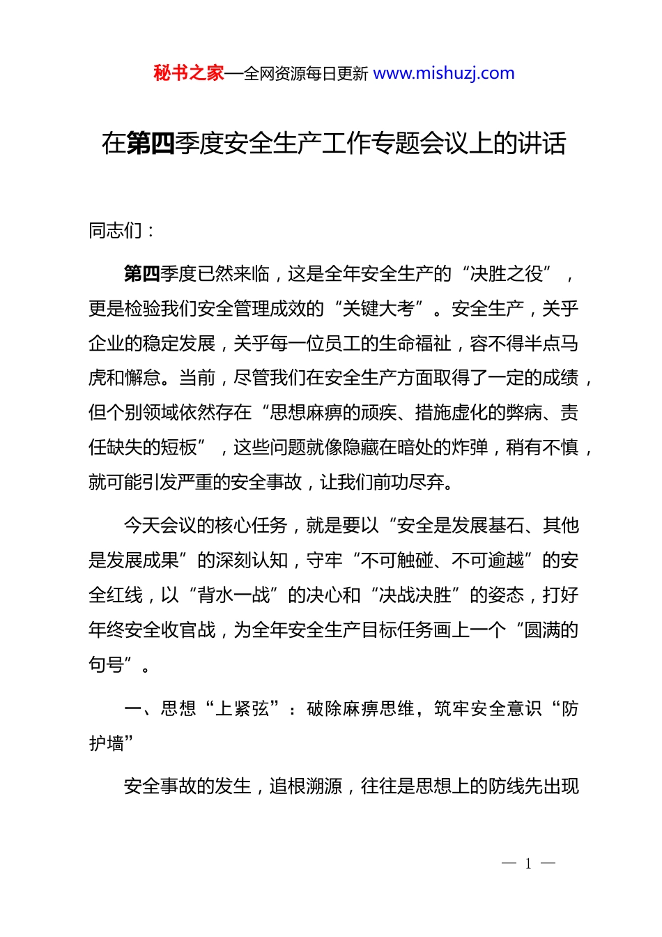 秘书之家—全网资源每日更新 www.mishuzj.com在第四季度安全生产工作专题会议上的讲话同志们:第四季度已然来临,这是全年安全生产的“决胜之役”,更是检验我们安全管理成效的“关键大考”。安全生产,关乎企业的稳定发展,关乎每一位员工的生命福祉,容不得半点马虎和懈怠。当前,尽管我们在安全生产方面取得了一定的成绩,但个别领域依然存在“思想麻痹的顽疾、措施虚化的弊病、责任缺失的短板”,这些问题就像隐藏在暗处的炸弹,稍有不慎,就可能引发严重的安全事故,让我们前功尽弃。今天会议的核心任务,就是要以“安全是发展基石、其他是发展成果”的深刻认知,守牢“不可触碰、不可逾越”的安全红线,以“背水一战”的决心和“决战决胜”的姿态,打好年终安全收官战,为全年安全生产目标任务画上一个“圆满的句号”。一、思想“上紧弦”:破除麻痹思维,筑牢安全意识“防护墙”安全事故的发生,追根溯源,往往是思想上的防线先出现— 1 —秘书之家—全网资源每日更新 www.mishuzj.com了缺口。回顾前三季度,我们不难发现一些令人担忧的现象,比如“安全培训走过场,员工实际技能未提升”“隐患排查不彻底,整改措施落实不到位”等问题,这些问题的本质,就是“安全意识淡薄、侥幸心理作祟”的麻痹思想在兴风作浪。我们必须以“踏石留印”的决心,拧紧思想“总开关”。(一)警惕三种“危险心态”,强化底线思维。一是“歇歇脚”的倦怠心理。部分部门和员工认为“前三季度平平安安,最后一个季度可以放松一下”,这种想法是极其危险的。要知道,越是临近年终,工作任务越繁重,员工身心越疲惫,安全风险也越高。我们必须深刻认识到“安全生产没有淡季,只有始终如一的坚守”,任何时候都不能有“松口气、歇歇脚”的想法。二是“差不多”的敷衍心态。有些员工把“不出大事故”当作安全工作的标准,对一些小隐患、小违章视而不见,认为“小问题不会造成大影响”。然而,无数的安全事故案例告诉我们,“千里之堤,毁于蚁穴”,小隐患不及时消除,就可能演变成大事故。我们要树立“隐患即事故”的理念,对任何安全隐患都要零容忍,做到早发现、早处理。三是“躲责任”的推诿心态。在安全工作中,个别部门和员工遇到问题相互推诿,把责任往别人身上推,导致安全责任无法落实到位。— 2 —秘书之家—全网资源每日更新 www.mishuzj.com安全生产是一项系统工程,需要全体员工共同参与、共同负责。我们要明确“安全人人有责,人人都是安全员”的理念,从管理层到一线员工,都要各司其职、各负其责,形成“人人讲安全、事事为安全、时时想安全、处处要安全”的良好氛围。(二)用好三类“教育法宝”,夯实思想根基。一是案例警示“鸣警钟”。每月选取行业内具有代表性的 3 起典型安全事故案例,组织全体员工观看《事故警示教育片》,开展“三问反思”活动:“如果类似事故发生在我们企业,我们的安全管理制度存在哪些漏洞?相关管理人员应承担怎样的责任?我们应该采取哪些有效的整改措施?”各部门要认真组织员工进行讨论,并形成《风险对照自查报告》,切实做到“以案为鉴、以案促改”。二是情景模拟“练真功”。在厂区内设置“安全情景模拟体验区”,模拟火灾、爆炸、触电等常见事故场景,让员工亲身体验事故的危害和后果,增强员工的安全意识和应急处置能力。通过情景模拟演练,让员工深刻认识到“安全就在身边,事故就在瞬间”,从而自觉遵守安全规章制度,提高自我保护能力。三是文化熏陶“筑防线”。通过悬挂安全标语(如“安全是企业的生命线,员工的幸福线”“安全第一,预防为主”)、举办安全知识竞赛、开展安全文化演讲等活动,— 3 —秘书之家—全网资源每日更新 www.mishuzj.com营造浓厚的安全文化氛围,让“生命至上、安全第一”的理念深入人心。同时,鼓励员工积极参与安全文化建设,分享自己的安全经验和心得,形成具有企业特色的安全文化。二、措施“铆足劲”:聚焦关键环节,织密安全防控“防护网”安全生产工作涉及面广、情况复杂,必须抓住关键环节,精准发力,才能取得实效。我们要避免“眉毛胡子一把抓”,以“精准施策”的方法,破解安全生产中的...