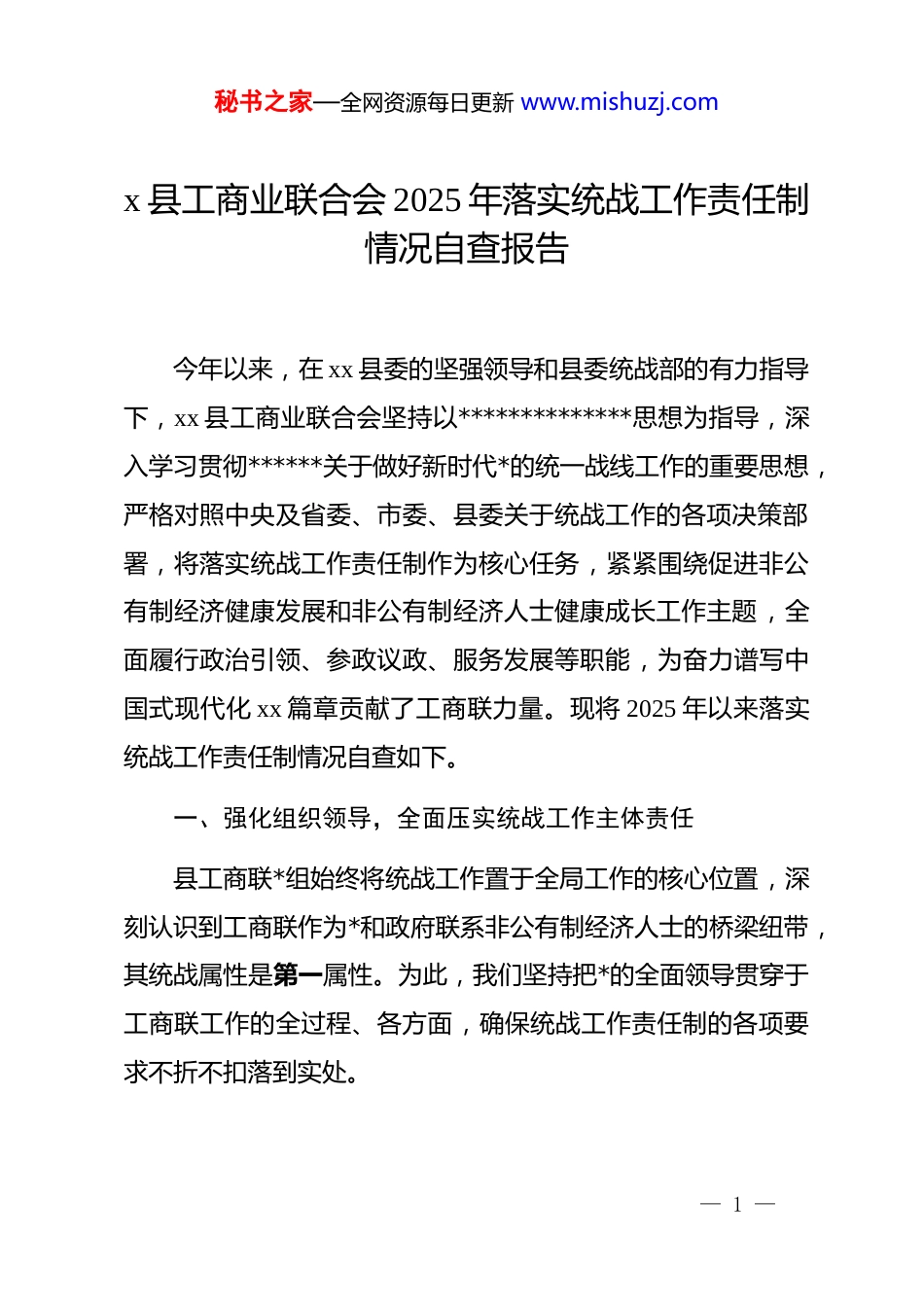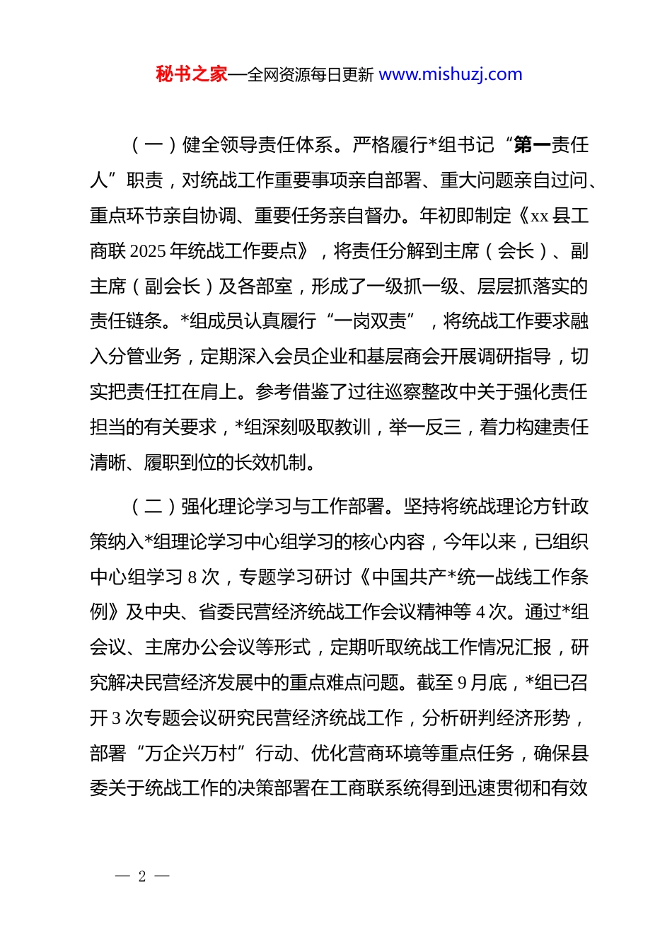 秘书之家—全网资源每日更新 www.mishuzj.comx 县工商业联合会 2025 年落实统战工作责任制情况自查报告今年以来,在 xx 县委的坚强领导和县委统战部的有力指导下,xx 县工商业联合会坚持以**************思想为指导,深入学习贯彻******关于做好新时代*的统一战线工作的重要思想,严格对照中央及省委、市委、县委关于统战工作的各项决策部署,将落实统战工作责任制作为核心任务,紧紧围绕促进非公有制经济健康发展和非公有制经济人士健康成长工作主题,全面履行政治引领、参政议政、服务发展等职能,为奋力谱写中国式现代化 xx 篇章贡献了工商联力量。现将 2025 年以来落实统战工作责任制情况自查如下。一、强化组织领导,全面压实统战工作主体责任县工商联*组始终将统战工作置于全局工作的核心位置,深刻认识到工商联作为*和政府联系非公有制经济人士的桥梁纽带,其统战属性是第一属性。为此,我们坚持把*的全面领导贯穿于工商联工作的全过程、各方面,确保统战工作责任制的各项要求不折不扣落到实处。— 1 —秘书之家—全网资源每日更新 www.mishuzj.com(一)健全领导责任体系。严格履行*组书记“第一责任人”职责,对统战工作重要事项亲自部署、重大问题亲自过问、重点环节亲自协调、重要任务亲自督办。年初即制定《xx 县工商联 2025 年统战工作要点》,将责任分解到主席(会长)、副主席(副会长)及各部室,形成了一级抓一级、层层抓落实的责任链条。*组成员认真履行“一岗双责”,将统战工作要求融入分管业务,定期深入会员企业和基层商会开展调研指导,切实把责任扛在肩上。参考借鉴了过往巡察整改中关于强化责任担当的有关要求,*组深刻吸取教训,举一反三,着力构建责任清晰、履职到位的长效机制。(二)强化理论学习与工作部署。坚持将统战理论方针政策纳入*组理论学习中心组学习的核心内容,今年以来,已组织中心组学习 8 次,专题学习研讨《中国共产*统一战线工作条例》及中央、省委民营经济统战工作会议精神等 4 次。通过*组会议、主席办公会议等形式,定期听取统战工作情况汇报,研究解决民营经济发展中的重点难点问题。截至 9 月底,*组已召开 3 次专题会议研究民营经济统战工作,分析研判经济形势,部署“万企兴万村”行动、优化营商环境等重点任务,确保县委关于统战工作的决策部署在工商联系统得到迅速贯彻和有效— 2 —秘书之家—全网资源每日更新 www.mishuzj.com执行。(三)完善制度保障。为确保责任落实有章可循,我们进一步修订和完善了《xx 县工商联*组议事规则》《xx 县工商联主席(会长)办公会议制度》等内部管理制度,明确将涉及民营经济思想政治工作、非公有制经济人士评先评优、商会 dj 等重大统战事项列为*组会议前置研究内容。同时,建立统战工作督查督办机制,将责任制落实情况纳入年度目标考核范畴,与干部评优评先直接挂钩,形成有效的激励和约束。此举旨在通过量化考评的“指挥棒”作用,推动统战工作责任从“软指标”向“硬约束”转变。二、深化思想政治引领,广泛凝聚团结奋斗的政治共识县工商联始终把加强思想政治引领作为民营经济统战工作的首要任务,引导广大非公有制经济人士不断增进对中国共产*和中国特色社会主义的政治认同、思想认同、理论认同、情感认同,筑牢团结奋斗的共同思想政治基础。(一)抓实理想信念教育。深入开展以“凝聚新力量·筑梦新时代”为主题的系列教育活动,扎实推进民营经济人士理想信念教育。今年,我们组织了 78 名新生代企业家和优秀民营企— 3 —秘书之家—全网资源每日更新 www.mishuzj.com业家代表,赴 xx 红色教育基地开展为期 3 天的“传承红色基因、担当时代使命”专题培训,通过现场教学、情景模拟等方式,引导企业家们感悟革命精神,坚定发展信心。同时,依托县内爱国主义教育基地,常态化组织会员企业家开展主题*日、国情考察等活动,累计覆盖 300 余人次。(二)强化政策理论宣讲。紧跟时事政策,及时组织学习******最新重要讲话和指示批示精神,特别是关于民营经济发展的重要论述。我们邀请县委*校专家、经济领域学者举办了 4 场专题辅导讲座,...