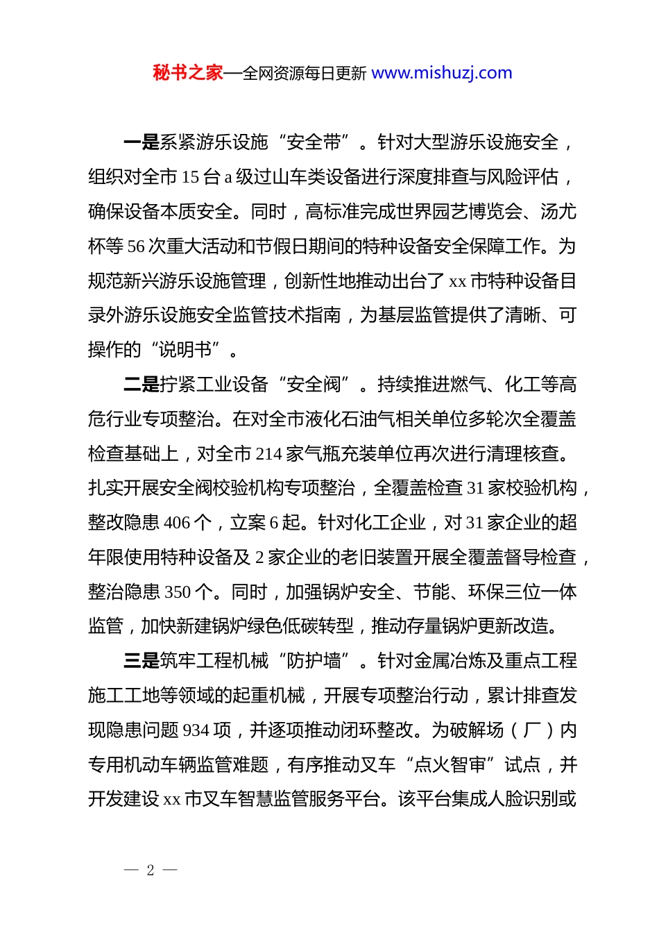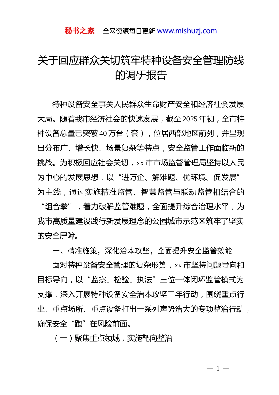 秘书之家—全网资源每日更新 www.mishuzj.com关于回应群众关切筑牢特种设备安全管理防线的调研报告特种设备安全事关人民群众生命财产安全和经济社会发展大局。随着我市经济社会的快速发展,截至 2025 年初,全市特种设备总量已突破 40 万台(套),位居西部地区前列,并呈现出分布广、增长快、场景复杂等特点,安全监管工作面临新的挑战。为积极回应社会关切,xx 市市场监督管理局坚持以人民为中心的发展思想,以“进万企、解难题、优环境、促发展”为主线,通过实施精准监管、智慧监管与联动监管相结合的“组合拳”,着力破解监管难题,全面提升综合治理水平,为我市高质量建设践行新发展理念的公园城市示范区筑牢了坚实的安全屏障。一、精准施策,深化治本攻坚,全面提升安全监管效能面对特种设备安全管理的复杂形势,xx 市坚持问题导向和目标导向,以“监察、检验、执法”三位一体闭环监管模式为支撑,深入开展特种设备安全治本攻坚三年行动,围绕重点行业、重点场所、重点设备打出一系列声势浩大的专项整治行动,确保安全“跑”在风险前面。(一)聚焦重点领域,实施靶向整治— 1 —秘书之家—全网资源每日更新 www.mishuzj.com一是系紧游乐设施“安全带”。针对大型游乐设施安全,组织对全市 15 台 a 级过山车类设备进行深度排查与风险评估,确保设备本质安全。同时,高标准完成世界园艺博览会、汤尤杯等 56 次重大活动和节假日期间的特种设备安全保障工作。为规范新兴游乐设施管理,创新性地推动出台了 xx 市特种设备目录外游乐设施安全监管技术指南,为基层监管提供了清晰、可操作的“说明书”。二是拧紧工业设备“安全阀”。持续推进燃气、化工等高危行业专项整治。在对全市液化石油气相关单位多轮次全覆盖检查基础上,对全市 214 家气瓶充装单位再次进行清理核查。扎实开展安全阀校验机构专项整治,全覆盖检查 31 家校验机构,整改隐患 406 个,立案 6 起。针对化工企业,对 31 家企业的超年限使用特种设备及 2 家企业的老旧装置开展全覆盖督导检查,整治隐患 350 个。同时,加强锅炉安全、节能、环保三位一体监管,加快新建锅炉绿色低碳转型,推动存量锅炉更新改造。三是筑牢工程机械“防护墙”。针对金属冶炼及重点工程施工工地等领域的起重机械,开展专项整治行动,累计排查发现隐患问题 934 项,并逐项推动闭环整改。为破解场(厂)内专用机动车辆监管难题,有序推动叉车“点火智审”试点,并开发建设 xx 市叉车智慧监管服务平台。该平台集成人脸识别或— 2 —秘书之家—全网资源每日更新 www.mishuzj.com刷卡授权启动功能,确保人证合一、合规上岗。通过车载 ai 摄像头和传感器,平台可实现对车辆的实时状态监控、运行预警、行车视频直播与抓拍,为叉车监管装上了“电子眼”,有效遏制了违规操作行为。通过一系列精准体检和靶向施方,特种设备安全治本攻坚行动取得显著成效。截至 2025 年 9 月,治本攻坚行动累计排查并完成闭环整改问题隐患 7800 余个,全市特种设备安全形势持续稳定向好,实现了特种设备安全“零事故零伤亡”的目标。二、智慧赋能,创新治理模式,用心守护群众出行安全电梯作为群众日常使用最频繁的特种设备,其安全运行直接关系到“出门第一步、回家最后一程”的民生福祉。xx 市市场监督管理局坚持智慧赋能与多元共治相结合,全面推动电梯安全监管模式的迭代升级。(一)升级应急平台,打造“智慧大脑”在现有 xx 市电梯困人应急处置平台的基础上,突出“责任链、安全伞、新经验”三个维度,全面推动“智慧大脑”的升级迭代。升级后的平台深度融合了物联网、大数据分析及人工智能技术。一是进一步拧紧电梯安全“责任链”。依托信息数据中心,平台向社会公众公示电梯的实时运行状态、维护保养记录、检— 3 —秘书之家—全网资源每日更新 www.mishuzj.com验检测等关键安全信息,畅通了信息查询渠道,有效发挥社会监督作用,从而压实使用单位、维保单位等各方主体责任。二是进一步撑起市民乘梯“安全伞”。应用大数据分析系统,完善了风险分析与预警功能。平台能基于历史数据和实时监测数据,...