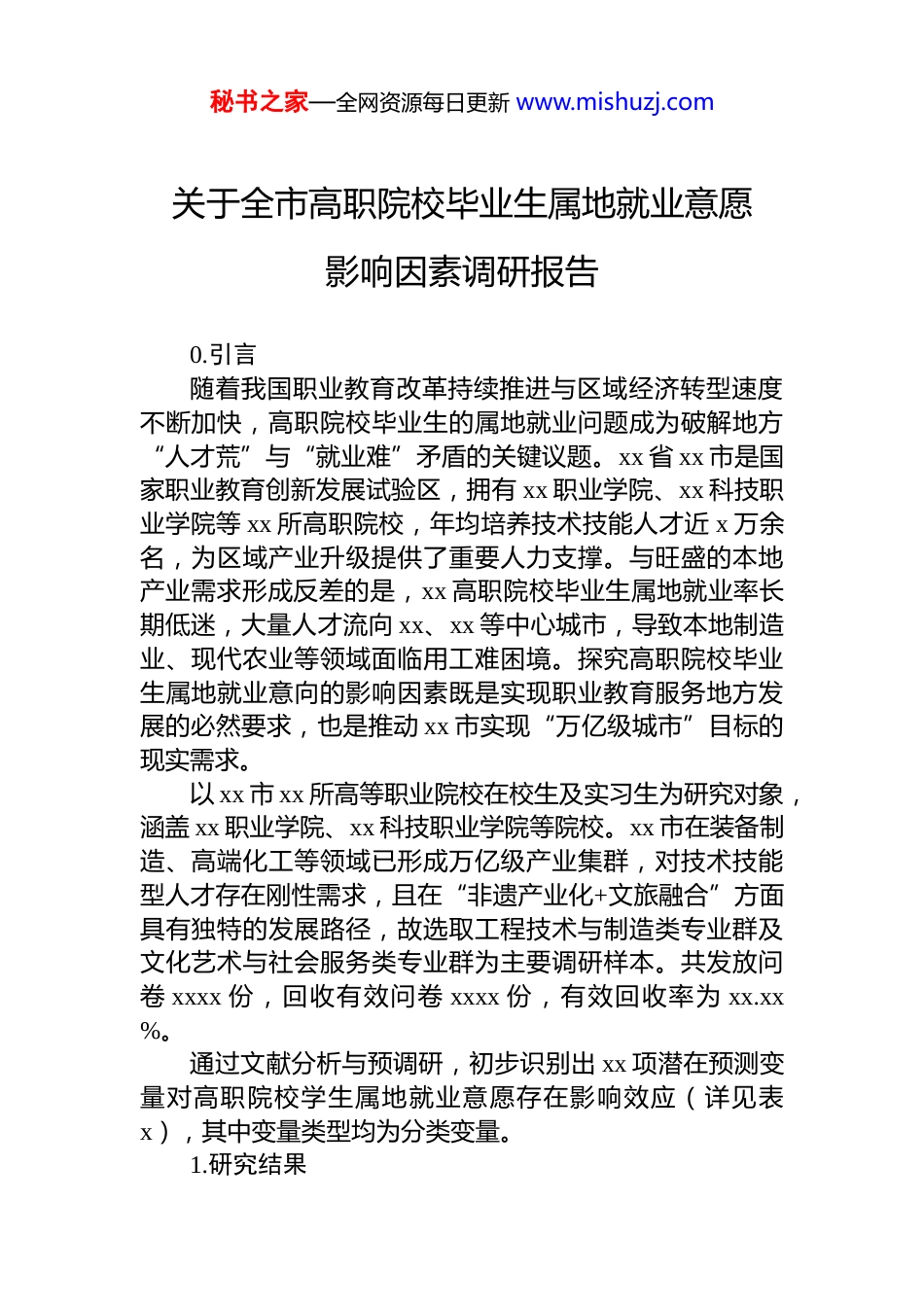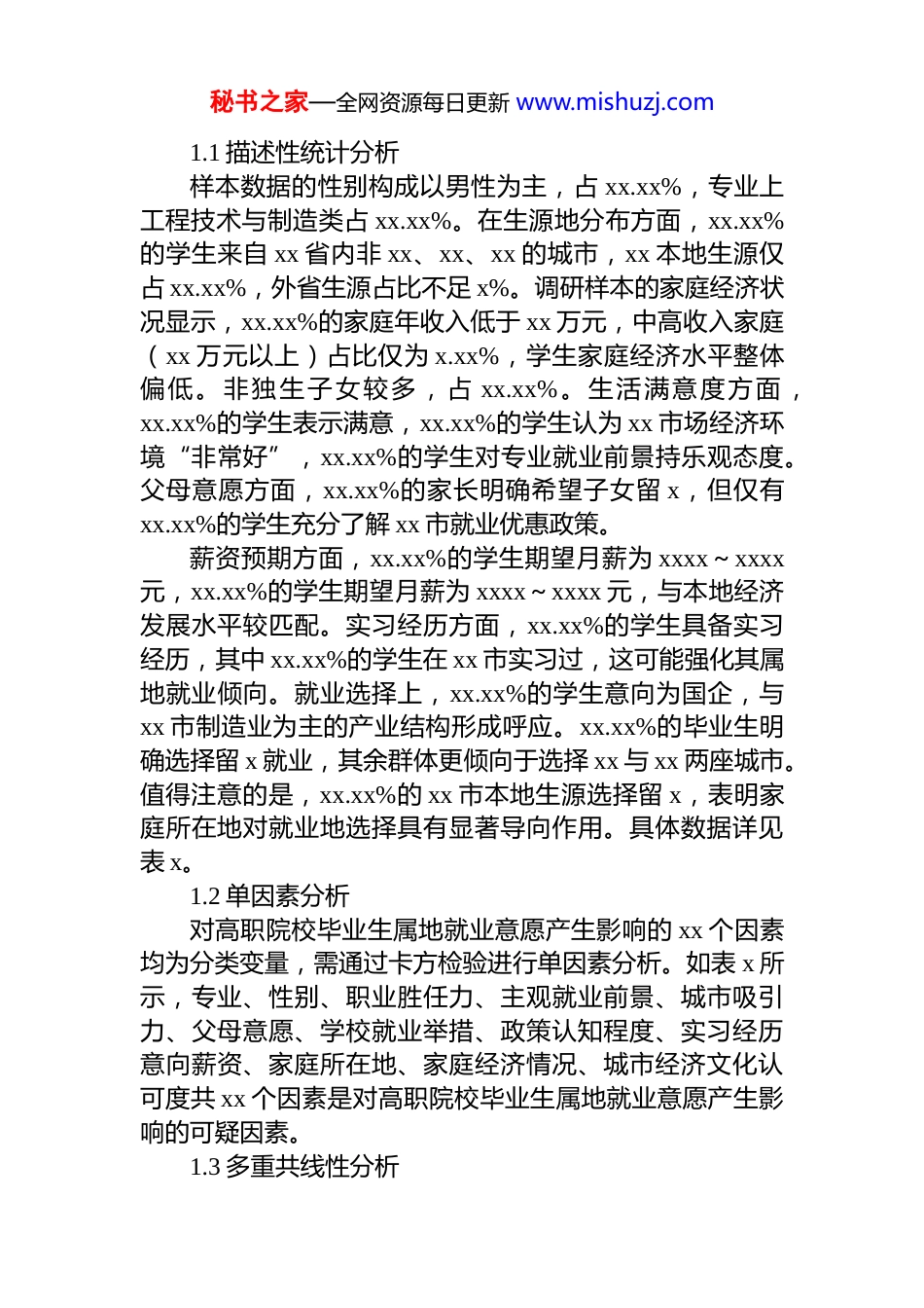 秘书之家—全网资源每日更新 www.mishuzj.com关于全市高职院校毕业生属地就业意愿影响因素调研报告0.引言随着我国职业教育改革持续推进与区域经济转型速度不断加快,高职院校毕业生的属地就业问题成为破解地方“人才荒”与“就业难”矛盾的关键议题。xx 省 xx 市是国家职业教育创新发展试验区,拥有 xx 职业学院、xx 科技职业学院等 xx 所高职院校,年均培养技术技能人才近 x 万余名,为区域产业升级提供了重要人力支撑。与旺盛的本地产业需求形成反差的是,xx 高职院校毕业生属地就业率长期低迷,大量人才流向 xx、xx 等中心城市,导致本地制造业、现代农业等领域面临用工难困境。探究高职院校毕业生属地就业意向的影响因素既是实现职业教育服务地方发展的必然要求,也是推动 xx 市实现“万亿级城市”目标的现实需求。以 xx 市 xx 所高等职业院校在校生及实习生为研究对象,涵盖 xx 职业学院、xx 科技职业学院等院校。xx 市在装备制造、高端化工等领域已形成万亿级产业集群,对技术技能型人才存在刚性需求,且在“非遗产业化+文旅融合”方面具有独特的发展路径,故选取工程技术与制造类专业群及文化艺术与社会服务类专业群为主要调研样本。共发放问卷 xxxx 份,回收有效问卷 xxxx 份,有效回收率为 xx.xx%。通过文献分析与预调研,初步识别出 xx 项潜在预测变量对高职院校学生属地就业意愿存在影响效应(详见表x),其中变量类型均为分类变量。1.研究结果秘书之家—全网资源每日更新 www.mishuzj.com1.1 描述性统计分析样本数据的性别构成以男性为主,占 xx.xx%,专业上工程技术与制造类占 xx.xx%。在生源地分布方面,xx.xx%的学生来自 xx 省内非 xx、xx、xx 的城市,xx 本地生源仅占 xx.xx%,外省生源占比不足 x%。调研样本的家庭经济状况显示,xx.xx%的家庭年收入低于 xx 万元,中高收入家庭(xx 万元以上)占比仅为 x.xx%,学生家庭经济水平整体偏低。非独生子女较多,占 xx.xx%。生活满意度方面,xx.xx%的学生表示满意,xx.xx%的学生认为 xx 市场经济环境“非常好”,xx.xx%的学生对专业就业前景持乐观态度。父母意愿方面,xx.xx%的家长明确希望子女留 x,但仅有xx.xx%的学生充分了解 xx 市就业优惠政策。薪资预期方面,xx.xx%的学生期望月薪为 xxxx~xxxx元,xx.xx%的学生期望月薪为 xxxx~xxxx 元,与本地经济发展水平较匹配。实习经历方面,xx.xx%的学生具备实习经历,其中 xx.xx%的学生在 xx 市实习过,这可能强化其属地就业倾向。就业选择上,xx.xx%的学生意向为国企,与xx 市制造业为主的产业结构形成呼应。xx.xx%的毕业生明确选择留 x 就业,其余群体更倾向于选择 xx 与 xx 两座城市。值得注意的是,xx.xx%的 xx 市本地生源选择留 x,表明家庭所在地对就业地选择具有显著导向作用。具体数据详见表 x。1.2 单因素分析对高职院校毕业生属地就业意愿产生影响的 xx 个因素均为分类变量,需通过卡方检验进行单因素分析。如表 x 所示,专业、性别、职业胜任力、主观就业前景、城市吸引力、父母意愿、学校就业举措、政策认知程度、实习经历意向薪资、家庭所在地、家庭经济情况、城市经济文化认可度共 xx 个因素是对高职院校毕业生属地就业意愿产生影响的可疑因素。1.3 多重共线性分析秘书之家—全网资源每日更新 www.mishuzj.com为确保通过单因素分析筛选出的因素间不存在相关关系,对筛选出的 xx 个因素进行多重共线性分析。如表 x 所示,xx 个因素的 vif 值均小于 x,说明各因素间不存在多重共线性。2.无序多分类 logistic 回归分析2.1 模型构建为探究高职院校毕业生属地就业意愿的影响因素,采用无序多分类 logistic 模型进行回归分析。被解释变量是高职院校毕业生的属地就业意愿,有 x 个取值,可构建 x 个广义 logit 模型。记 p、p、p、p、p 分别表示在 xx 市就业的概率、在 xx 市或 xx 市就业的概率、在 xx 省内其余城市(非xx、xx 或 xx)就业的概率、在市就业的概率,令倾向于在xx 省外非一线城市就业的学生作为参考类别。影响学生选择在 xx 市就...
