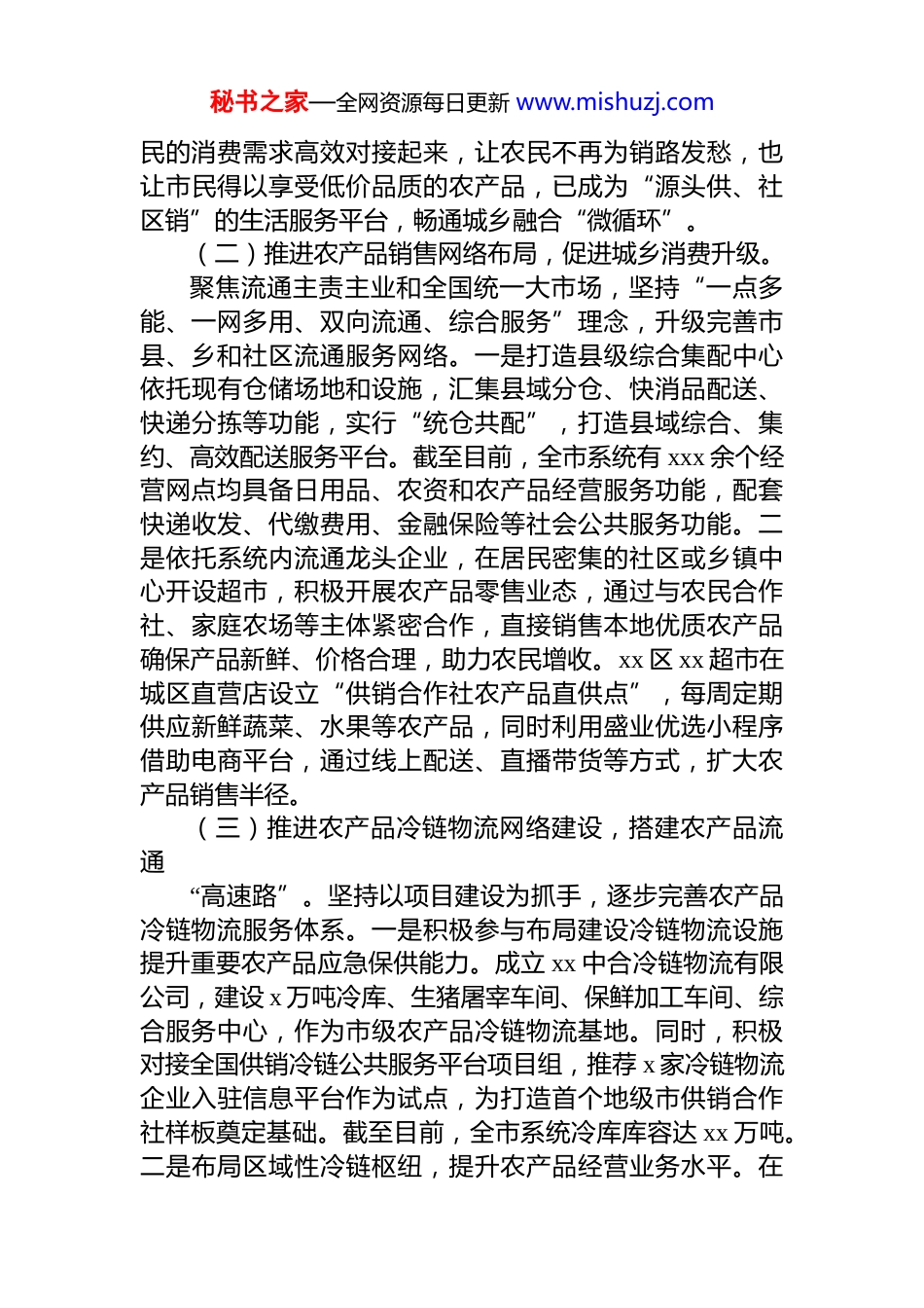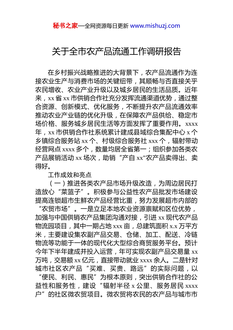 秘书之家—全网资源每日更新 www.mishuzj.com关于全市农产品流通工作调研报告在乡村振兴战略推进的大背景下,农产品流通作为连接农业生产与消费市场的关键纽带,其顺畅与否直接关乎农民增收、农业产业升级以及城乡居民的生活品质。近年来,xx 省 xx 市供销合作社充分发挥流通渠道优势,通过整合资源、创新模式、优化服务,不断提升农产品流通效率推动农业产业链的优化升级,在保障农产品供给、稳定市场价格、服务城乡居民生活等方面发挥了重要作用。xxxx年,xx 市供销合作社系统累计建成县域综合集配中心 x 个乡镇综合服务站 xx 个、村级综合服务社 xxx 个,辐射带动经营网点 xxxx 多个,数量均居全省第一;组织参加各类农产品展销活动 xx 场次,助销“产自 xx”农产品卖得出、卖得好。工作成效和亮点(一)推进各类农产品市场升级改造,为周边居民打造放心“菜篮子”。积极参与公益性农产品批发市场建设提高连锁超市生鲜农产品经营比重,努力发展超市内部的“农贸市场”。一是立足本地农业资源禀赋和区位优势,加强与中国供销农产品集团沟通对接,引进 xx 现代农产品物流园项目,其中一期占地 xxx 亩,总建筑面积 x.x 万平方米,主要建设集农副产品交易、仓储、加工、配送、冷链物流等功能于一体的现代化大型综合商贸服务平台。预计今年下半年建成并投入运营,年可实现农副产品交易量 xx万吨,交易额 xx 亿元,直接带动就业 xxxx 余人。二是针对城市社区农产品“买难、买贵、路远”的实际问题,以“便民、利民、惠民”为根本原则,突出供销合作社的公益性和服务性,建设“辐射半径 x 公里、服务居民 xxxx户”的社区微农贸项目。微农贸将农民的农产品与城市市秘书之家—全网资源每日更新 www.mishuzj.com民的消费需求高效对接起来,让农民不再为销路发愁,也让市民得以享受低价品质的农产品,已成为“源头供、社区销”的生活服务平台,畅通城乡融合“微循环”。(二)推进农产品销售网络布局,促进城乡消费升级。聚焦流通主责主业和全国统一大市场,坚持“一点多能、一网多用、双向流通、综合服务”理念,升级完善市县、乡和社区流通服务网络。一是打造县级综合集配中心依托现有仓储场地和设施,汇集县域分仓、快消品配送、快递分拣等功能,实行“统仓共配”,打造县域综合、集约、高效配送服务平台。截至目前,全市系统有 xxx 余个经营网点均具备日用品、农资和农产品经营服务功能,配套快递收发、代缴费用、金融保险等社会公共服务功能。二是依托系统内流通龙头企业,在居民密集的社区或乡镇中心开设超市,积极开展农产品零售业态,通过与农民合作社、家庭农场等主体紧密合作,直接销售本地优质农产品确保产品新鲜、价格合理,助力农民增收。xx 区 xx 超市在城区直营店设立“供销合作社农产品直供点”,每周定期供应新鲜蔬菜、水果等农产品,同时利用盛业优选小程序借助电商平台,通过线上配送、直播带货等方式,扩大农产品销售半径。(三)推进农产品冷链物流网络建设,搭建农产品流通“高速路”。坚持以项目建设为抓手,逐步完善农产品冷链物流服务体系。一是积极参与布局建设冷链物流设施提升重要农产品应急保供能力。成立 xx 中合冷链物流有限公司,建设 x 万吨冷库、生猪屠宰车间、保鲜加工车间、综合服务中心,作为市级农产品冷链物流基地。同时,积极对接全国供销冷链公共服务平台项目组,推荐 x 家冷链物流企业入驻信息平台作为试点,为打造首个地级市供销合作社样板奠定基础。截至目前,全市系统冷库库容达 xx 万吨。二是布局区域性冷链枢纽,提升农产品经营业务水平。在秘书之家—全网资源每日更新 www.mishuzj.comxx 县依托 xx 供销合作社,联合 xx 食品公司共同成立 xxxx供销供应链公司,建设冷链仓储项目,开展速冻果蔬、预制菜、农产品冷链仓储等业务。xxxx 年累计加工杏、水蜜桃、黄桃、青红椒、糯玉米等农产品 x 万余吨。其中,开展“初级农产品入股精深加工企业”试点,探索“合作社产品+入股加工+增值分红”模式,依托 xx 供销供应链公司,与 xx 镇等有关合作社签订糯玉米种植协议,打造糯玉米基地...