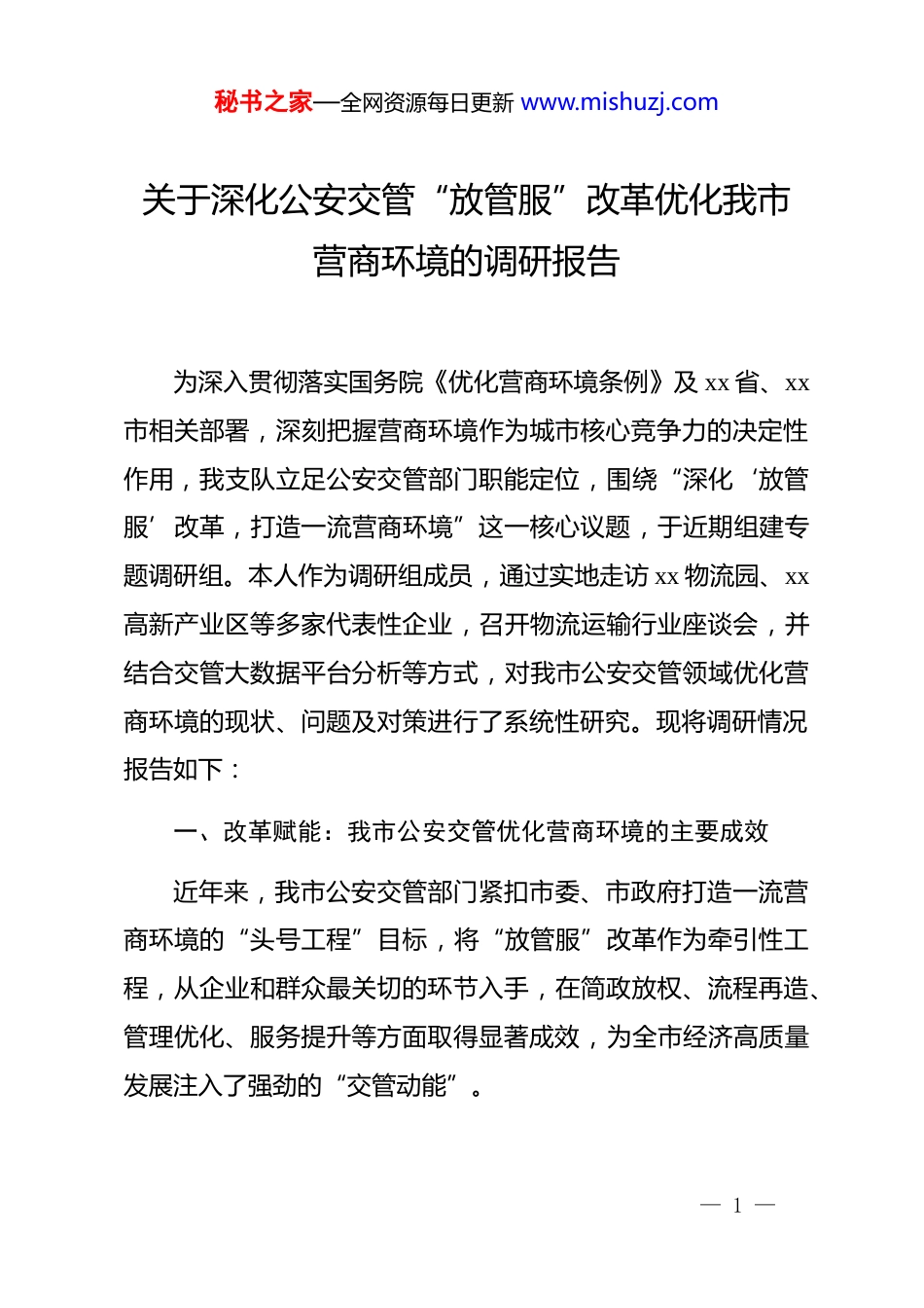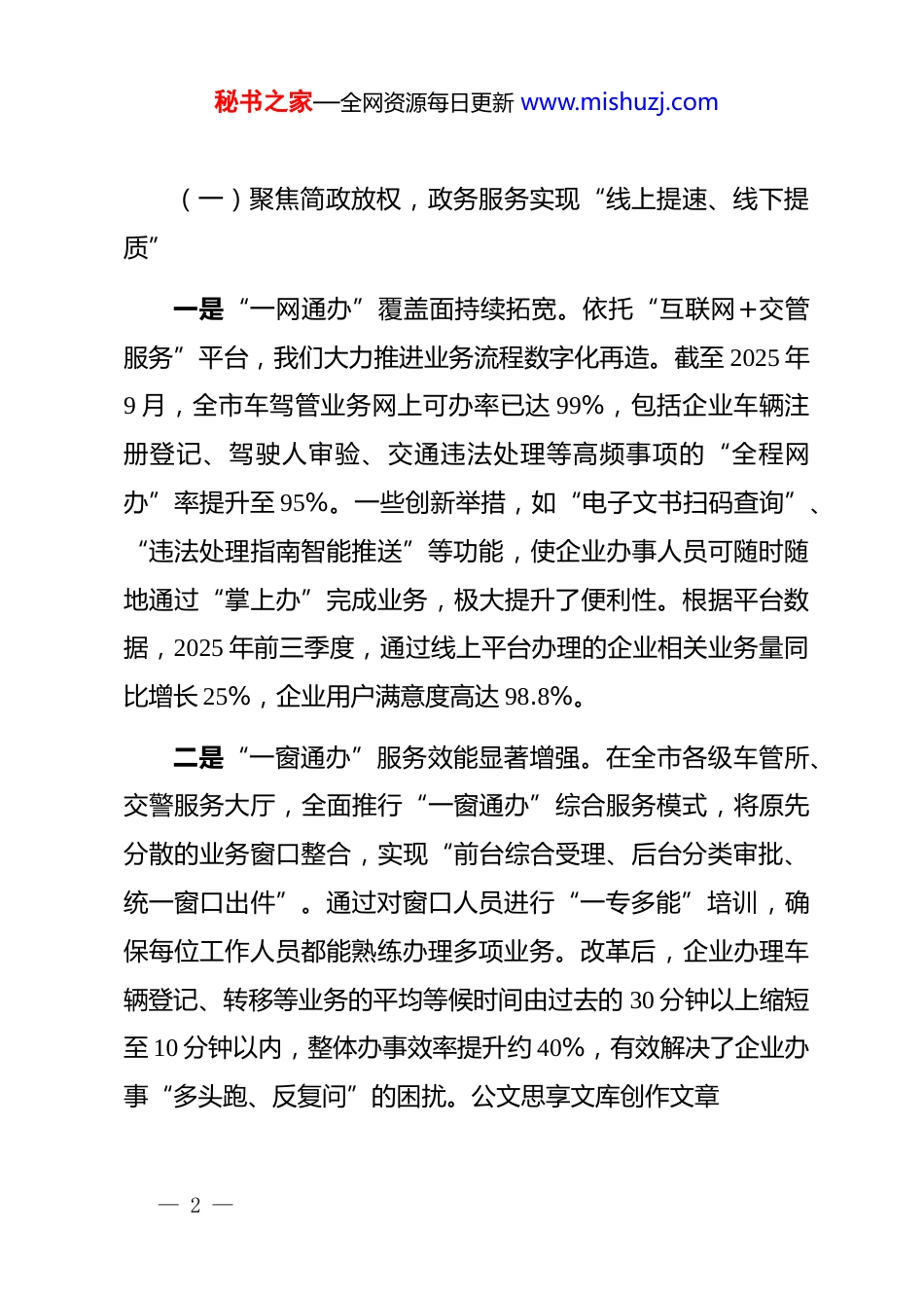 秘书之家—全网资源每日更新 www.mishuzj.com关于深化公安交管“放管服”改革优化我市营商环境的调研报告为深入贯彻落实国务院《优化营商环境条例》及 xx 省、xx市相关部署,深刻把握营商环境作为城市核心竞争力的决定性作用,我支队立足公安交管部门职能定位,围绕“深化‘放管服’改革,打造一流营商环境”这一核心议题,于近期组建专题调研组。本人作为调研组成员,通过实地走访 xx 物流园、xx高新产业区等多家代表性企业,召开物流运输行业座谈会,并结合交管大数据平台分析等方式,对我市公安交管领域优化营商环境的现状、问题及对策进行了系统性研究。现将调研情况报告如下:一、改革赋能:我市公安交管优化营商环境的主要成效近年来,我市公安交管部门紧扣市委、市政府打造一流营商环境的“头号工程”目标,将“放管服”改革作为牵引性工程,从企业和群众最关切的环节入手,在简政放权、流程再造、管理优化、服务提升等方面取得显著成效,为全市经济高质量发展注入了强劲的“交管动能”。— 1 —秘书之家—全网资源每日更新 www.mishuzj.com(一)聚焦简政放权,政务服务实现“线上提速、线下提质”一是“一网通办”覆盖面持续拓宽。依托“互联网+交管服务”平台,我们大力推进业务流程数字化再造。截至 2025 年9 月,全市车驾管业务网上可办率已达 99%,包括企业车辆注册登记、驾驶人审验、交通违法处理等高频事项的“全程网办”率提升至 95%。一些创新举措,如“电子文书扫码查询”、“违法处理指南智能推送”等功能,使企业办事人员可随时随地通过“掌上办”完成业务,极大提升了便利性。根据平台数据,2025 年前三季度,通过线上平台办理的企业相关业务量同比增长 25%,企业用户满意度高达 98.8%。二是“一窗通办”服务效能显著增强。在全市各级车管所、交警服务大厅,全面推行“一窗通办”综合服务模式,将原先分散的业务窗口整合,实现“前台综合受理、后台分类审批、统一窗口出件”。通过对窗口人员进行“一专多能”培训,确保每位工作人员都能熟练办理多项业务。改革后,企业办理车辆登记、转移等业务的平均等候时间由过去的 30 分钟以上缩短至 10 分钟以内,整体办事效率提升约 40%,有效解决了企业办事“多头跑、反复问”的困扰。公文思享文库创作文章— 2 —秘书之家—全网资源每日更新 www.mishuzj.com三是审批材料与环节大幅精简。我们主动对标先进地区经验,全面梳理涉企审批事项,对办理流程进行革命性再造。对可通过部门间信息共享核验的身份证明、营业执照、道路运输许可证等材料,坚决予以取消,实现“无纸化”申请。针对大件运输许可等复杂事项,我们协同交通运输部门,于 2025 年上线了多部门协同办理系统,实现了线上“不见面”审批,办理时限由原来的 5 个工作日压缩至 2 个工作日以内,真正让数据多跑路,企业少跑腿。(二)聚焦保通保畅,路网运行实现“管理提效、物流提速”一是“交通大脑”赋能精准治堵。全面升级我市智能交通信号控制系统,建成覆盖主城区的“交通大脑”指挥中心。通过大数据分析城市交通潮汐规律和企业物流出行特点,对全市120 余个重点路口实施了“一清晨、二平峰、三高峰、四夜间”的精细化信号配时策略。特别是在连接 xx 产业园与高速公路的 xx 大道等主干道上,我们打造了 20 余条“绿波带”,保障物流车辆通行连续性。截至 2025 年 9 月,市区主干道高峰时段平均车速同比提升 12%,物流运输车辆的平均通行时间缩短了约 15%。— 3 —秘书之家—全网资源每日更新 www.mishuzj.com二是货运通道管理科学优化。为破解货运车辆“进城难、通行难”问题,我们联合规划、交通等部门,深入调研企业需求,对市区货车限行区域和时段进行了动态优化调整。开辟了3 条“夜间货运绿色通道”,延长了部分路段允许货车通行的时间,并对新能源货车给予了更大的通行便利。同时,针对企业反映强烈的 xx 区老工业基地周边道路狭窄问题,我们通过实施“道路设施微改造”工程,拓宽了瓶颈路段,增设了临时装卸货区,有效提升了区域物流微循环效率。三是道路交通隐患动态清零。常态化开展“僵尸...