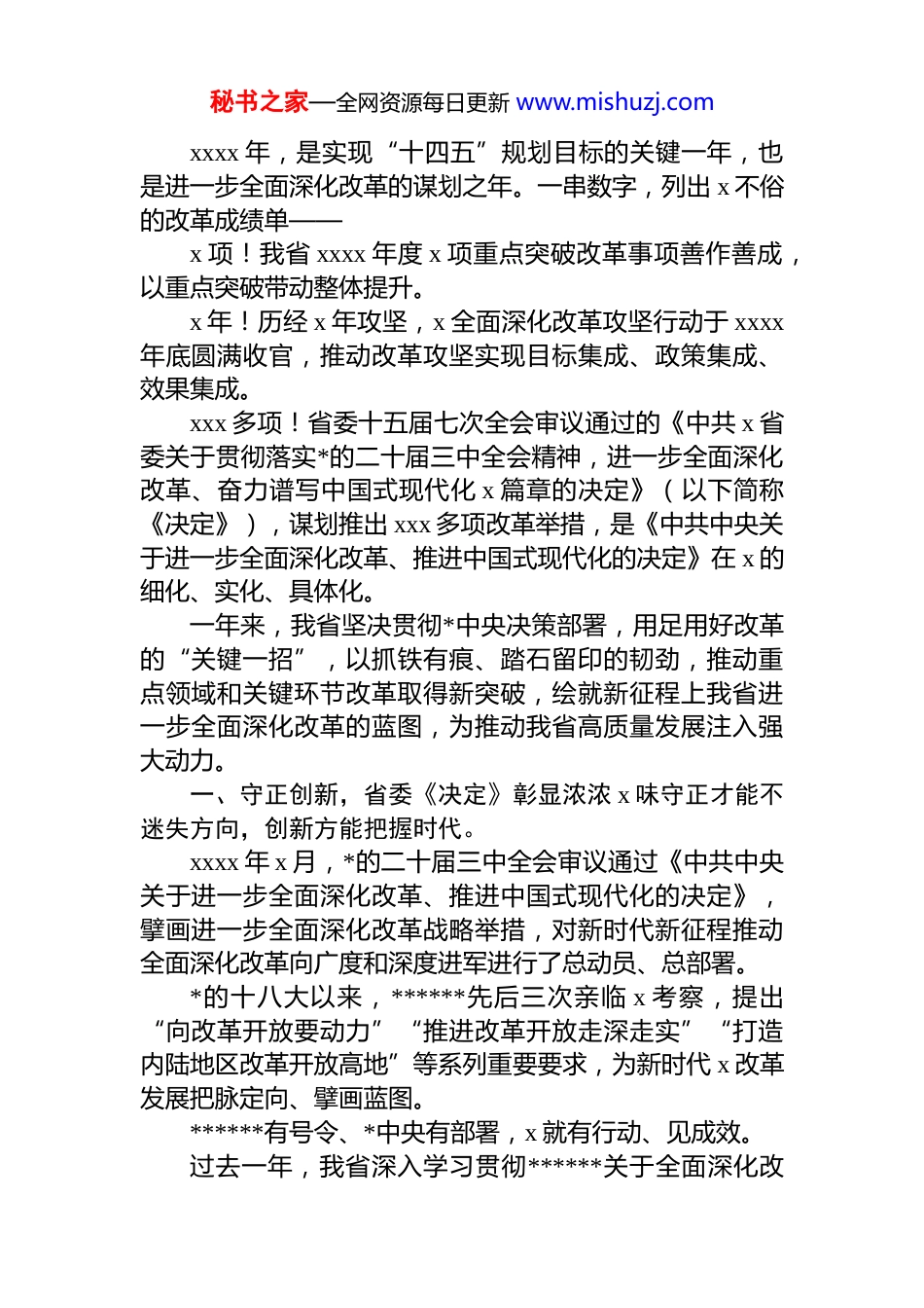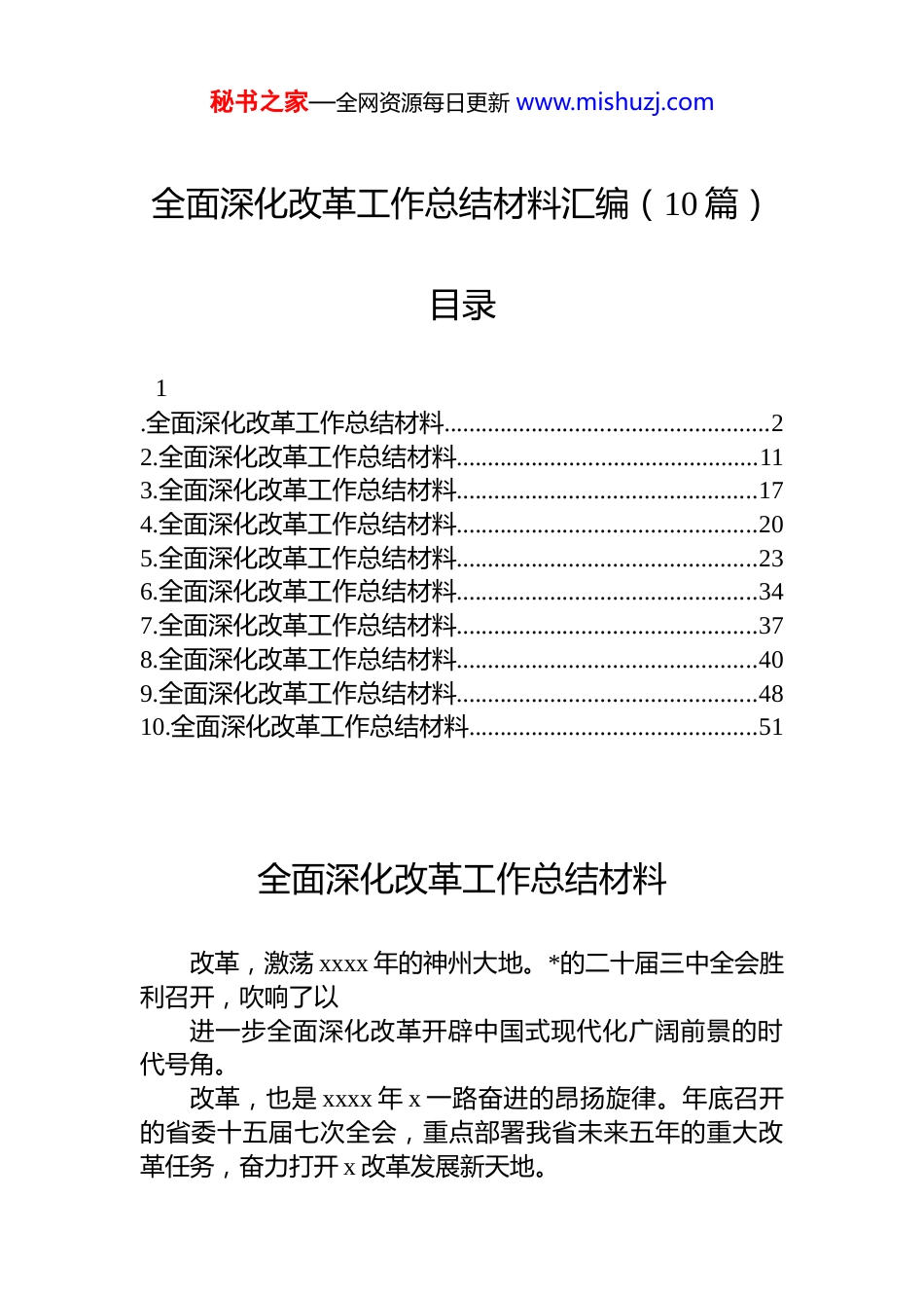 秘书之家—全网资源每日更新 www.mishuzj.com全面深化改革工作总结材料汇编(10 篇)目录1.全面深化改革工作总结材料....................................................22.全面深化改革工作总结材料................................................113.全面深化改革工作总结材料................................................174.全面深化改革工作总结材料................................................205.全面深化改革工作总结材料................................................236.全面深化改革工作总结材料................................................347.全面深化改革工作总结材料................................................378.全面深化改革工作总结材料................................................409.全面深化改革工作总结材料................................................4810.全面深化改革工作总结材料..............................................51全面深化改革工作总结材料改革,激荡 xxxx 年的神州大地。*的二十届三中全会胜利召开,吹响了以进一步全面深化改革开辟中国式现代化广阔前景的时代号角。改革,也是 xxxx 年 x 一路奋进的昂扬旋律。年底召开的省委十五届七次全会,重点部署我省未来五年的重大改革任务,奋力打开 x 改革发展新天地。秘书之家—全网资源每日更新 www.mishuzj.comxxxx 年,是实现“十四五”规划目标的关键一年,也是进一步全面深化改革的谋划之年。一串数字,列出 x 不俗的改革成绩单——x 项!我省 xxxx 年度 x 项重点突破改革事项善作善成,以重点突破带动整体提升。x 年!历经 x 年攻坚,x 全面深化改革攻坚行动于 xxxx年底圆满收官,推动改革攻坚实现目标集成、政策集成、效果集成。xxx 多项!省委十五届七次全会审议通过的《中共 x 省委关于贯彻落实*的二十届三中全会精神,进一步全面深化改革、奋力谱写中国式现代化 x 篇章的决定》(以下简称《决定》),谋划推出 xxx 多项改革举措,是《中共中央关于进一步全面深化改革、推进中国式现代化的决定》在 x 的细化、实化、具体化。一年来,我省坚决贯彻*中央决策部署,用足用好改革的“关键一招”,以抓铁有痕、踏石留印的韧劲,推动重点领域和关键环节改革取得新突破,绘就新征程上我省进一步全面深化改革的蓝图,为推动我省高质量发展注入强大动力。一、守正创新,省委《决定》彰显浓浓 x 味守正才能不迷失方向,创新方能把握时代。xxxx 年 x 月,*的二十届三中全会审议通过《中共中央关于进一步全面深化改革、推进中国式现代化的决定》,擘画进一步全面深化改革战略举措,对新时代新征程推动全面深化改革向广度和深度进军进行了总动员、总部署。*的十八大以来,******先后三次亲临 x 考察,提出“向改革开放要动力”“推进改革开放走深走实”“打造内陆地区改革开放高地”等系列重要要求,为新时代 x 改革发展把脉定向、擘画蓝图。******有号令、*中央有部署,x 就有行动、见成效。过去一年,我省深入学习贯彻******关于全面深化改秘书之家—全网资源每日更新 www.mishuzj.com革的一系列新思想、新观点、新论断,全面落实*的二十届三中全会精神以及******考察 x 重要讲话精神,为进一步全面深化改革锚定正确方向。xxxx 年 xx 月 xx 日,x 滨江宾馆大会堂。在如潮的掌声中,《决定》在省委十五届七次全会上审议通过。时间回拨至 x 个月前。xxxx 年 x 月以来,省委在深入学习*的二十届三中全会精神、广泛开展调查研究的基础上,系统谋划我省进一步全面深化改革的路径举措,制定实施《关于我省贯彻*的二十届三中全会精神文件起草工作方案》,成立起草工作组省委书记**担任组长,全程指导部署起草工作。值得一提的是,在起草过程中,省委在全面对标中央精神的前提下,防止上下“一般粗”、不搞“急就章”,而是严把质量关、注重“长远谋”——省委先后召开专家学者、*外人士、企业界人士 x 场座谈会,起草工作组花费x 个多月时间深入全省各地调查研究,了解基层群众和经营主...