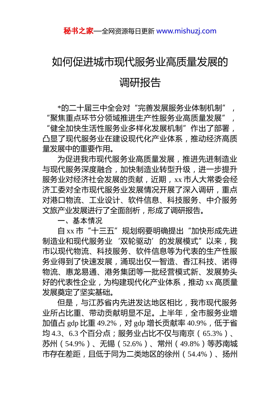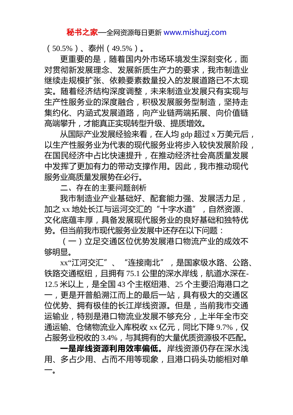 秘书之家—全网资源每日更新 www.mishuzj.com如何促进城市现代服务业高质量发展的调研报告*的二十届三中全会对“完善发展服务业体制机制”,“聚焦重点环节分领域推进生产性服务业高质量发展”,“健全加快生活性服务业多样化发展机制”作出了部署,凸显了现代服务业在建设现代化产业体系,推动经济高质量发展中的重要作用。为促进我市现代服务业高质量发展,推进先进制造业与现代服务深度融合,加快制造业转型升级,进一步提升服务业对经济社会发展的贡献,近期,xx 市人大常委会经济工委对全市现代服务业发展情况开展了深入调研,重点对港口物流、工业设计、软件信息、科技服务、中介服务文旅产业发展进行了全面剖析,形成了调研报告。一、基本情况自 xx 市“十三五”规划纲要明确提出“加快形成先进制造业和现代服务业‘双轮驱动’的发展模式”以来,我市以现代物流、科技服务、软件信息等为代表的生产性服务业得到了快速发展,涌现出仅一智造、香江科技、诺得物流、惠龙易通、港务集团等一批经营模式新、发展势头好的代表性企业,为构建现代化产业体系,推动 xx 高质量发展奠定了坚实基础。但是,与江苏省内先进发达地区相比,我市现代服务业所占比重、带动贡献明显不足。上半年,全市服务业增加值占 gdp 比重 49.2%,对 gdp 增长贡献率 40.9%,低于省均 4.3、6.3 个百分点;服务业占比不仅与南京(65.3%)、苏州(54.9%)、无锡(52.6%)、常州(49.8%)等苏南城市存在差距,且低于同为二类地区的徐州(54.4%)、扬州秘书之家—全网资源每日更新 www.mishuzj.com(50.5%)、泰州(49.5%)。更重要的是,随着国内外市场环境发生深刻变化,面对贯彻新发展理念、发展新质生产力的要求,我市制造业继续走规模扩张、依赖要素数量投入的发展道路已不太现实。随着经济结构深度调整,未来制造业发展只有实现与生产性服务业的深度融合,积极发展服务型制造,坚持走集约化、内涵式发展道路,向产业链两端拓展、向价值链高端攀升,才能真正实现转型升级、提质增效。从国际产业发展经验来看,在人均 gdp 超过 x 万美元后, 以生产性服务业为代表的现代服务业将步入较快发展阶段,在国民经济中占比快速提升,在推动经济社会高质量发展中发挥了更加有力的带动支撑作用。因此,我市推动现代服务业高质量发展势在必行。二、存在的主要问题剖析我市制造业产业基础好、配套能力强、发展活力足,加之 xx 地处长江与运河交汇的“十字水道”,自然资源、文化底蕴丰厚,具备发展现代服务业的良好基础和独特优势。但当前我市现代服务业发展中还存在以下问题:(一)立足交通区位优势发展港口物流产业的成效不够明显。xx“江河交汇”、“连接南北”,是国家级水路、公路、铁路交通枢纽,且拥有 75.1 公里的深水岸线,航道水深在-12.5 米以上,是全国 43 个主枢纽港、25 个主要沿海港口之一,更是开普船溯江而上的最后一站,具有极大的交通区位优势、拥有极佳的长江岸线资源。但是,当前我市交通运输业,特别是港口物流业发展不够充分,上半年全市交通运输、仓储物流业入库税收 xx 亿元,同比下降 9.7%,仅占服务业税收的 3.4%,与其拥有的大量优质资源极不匹配。一是岸线资源利用效率偏低。岸线资源仍存在深水浅用、多占少用、占而不用等现象,且港口码头功能相对单一。秘书之家—全网资源每日更新 www.mishuzj.com二是港口发展质态层次不高。多数码头仍以装卸、仓储等低端作业为主,尚未向加工、贸易、金融、信息服务和智慧物流拓展升级,港产城融合、港工贸一体发展程度偏低;现有铁矿石、 煤炭、 木材、钢铁、水泥、化工材料 石油焦等特色货种优势发挥不够充分,没有支撑港口物流业产生更多增加值,枢纽港的功能优势尚未形成,对全市经济发展的贡献不大。三是多式联运作用发挥不够。镇大铁路、上隍货场作用尚未得到充分发挥,缺乏龙头型多式联运经营主体,未能有效带动我市制造业企业的综合物流成本降低。总体来看,拥有巨大发展潜力的港口物流产业运行质效、贡献能力亟待增强。(二)制造业转型升级与生产性服务业发展的融合不够紧密。我市制造业虽有“四群八...