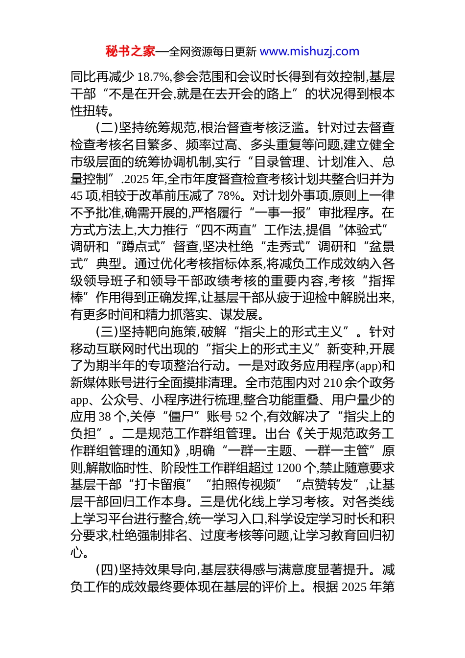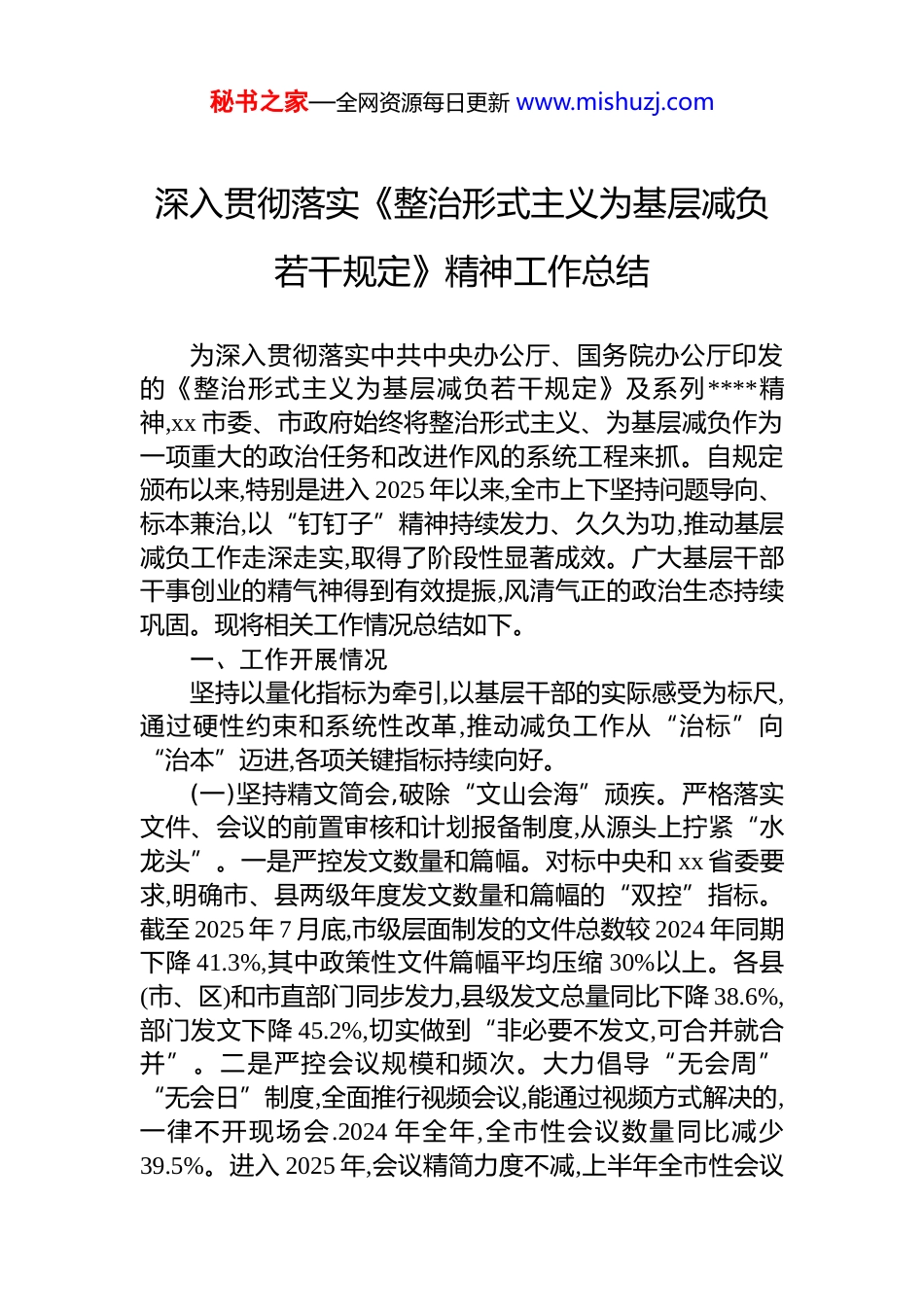 秘书之家—全网资源每日更新 www.mishuzj.com深入贯彻落实《整治形式主义为基层减负若干规定》精神工作总结为深入贯彻落实中共中央办公厅、国务院办公厅印发的《整治形式主义为基层减负若干规定》及系列****精神,xx 市委、市政府始终将整治形式主义、为基层减负作为一项重大的政治任务和改进作风的系统工程来抓。自规定颁布以来,特别是进入 2025 年以来,全市上下坚持问题导向、标本兼治,以“钉钉子”精神持续发力、久久为功,推动基层减负工作走深走实,取得了阶段性显著成效。广大基层干部干事创业的精气神得到有效提振,风清气正的政治生态持续巩固。现将相关工作情况总结如下。一、工作开展情况坚持以量化指标为牵引,以基层干部的实际感受为标尺,通过硬性约束和系统性改革,推动减负工作从“治标”向“治本”迈进,各项关键指标持续向好。(一)坚持精文简会,破除“文山会海”顽疾。严格落实文件、会议的前置审核和计划报备制度,从源头上拧紧“水龙头”。一是严控发文数量和篇幅。对标中央和 xx 省委要求,明确市、县两级年度发文数量和篇幅的“双控”指标。截至 2025 年 7 月底,市级层面制发的文件总数较 2024 年同期下降 41.3%,其中政策性文件篇幅平均压缩 30%以上。各县(市、区)和市直部门同步发力,县级发文总量同比下降 38.6%,部门发文下降 45.2%,切实做到“非必要不发文,可合并就合并”。二是严控会议规模和频次。大力倡导“无会周”“无会日”制度,全面推行视频会议,能通过视频方式解决的,一律不开现场会.2024 年全年,全市性会议数量同比减少39.5%。进入 2025 年,会议精简力度不减,上半年全市性会议秘书之家—全网资源每日更新 www.mishuzj.com同比再减少 18.7%,参会范围和会议时长得到有效控制,基层干部“不是在开会,就是在去开会的路上”的状况得到根本性扭转。(二)坚持统筹规范,根治督查考核泛滥。针对过去督查检查考核名目繁多、频率过高、多头重复等问题,建立健全市级层面的统筹协调机制,实行“目录管理、计划准入、总量控制”.2025 年,全市年度督查检查考核计划共整合归并为45 项,相较于改革前压减了 78%。对计划外事项,原则上一律不予批准,确需开展的,严格履行“一事一报”审批程序。在方式方法上,大力推行“四不两直”工作法,提倡“体验式”调研和“蹲点式”督查,坚决杜绝“走秀式”调研和“盆景式”典型。通过优化考核指标体系,将减负工作成效纳入各级领导班子和领导干部政绩考核的重要内容,考核“指挥棒”作用得到正确发挥,让基层干部从疲于迎检中解脱出来,有更多时间和精力抓落实、谋发展。(三)坚持靶向施策,破解“指尖上的形式主义”。针对移动互联网时代出现的“指尖上的形式主义”新变种,开展了为期半年的专项整治行动。一是对政务应用程序(app)和新媒体账号进行全面摸排清理。全市范围内对 210 余个政务app、公众号、小程序进行梳理,整合功能重叠、用户量少的应用 38 个,关停“僵尸”账号 52 个,有效解决了“指尖上的负担”。二是规范工作群组管理。出台《关于规范政务工作群组管理的通知》,明确“一群一主题、一群一主管”原则,解散临时性、阶段性工作群组超过 1200 个,禁止随意要求基层干部“打卡留痕”“拍照传视频”“点赞转发”,让基层干部回归工作本身。三是优化线上学习考核。对各类线上学习平台进行整合,统一学习入口,科学设定学习时长和积分要求,杜绝强制排名、过度考核等问题,让学习教育回归初心。(四)坚持效果导向,基层获得感与满意度显著提升。减负工作的成效最终要体现在基层的评价上。根据 2025 年第秘书之家—全网资源每日更新 www.mishuzj.com二季度对全市 2000 名基层干部开展的问卷调查显示,对整治形式主义为基层减负工作的总体满意度高达 94.6%。其中,对“精文简会”成效的满意度为 96.2%,对“规范督查考核”的满意度为 92.8%,对“整治指尖上的形式主义”的满意度为 91.5%。超过九成的受访干部表示,当前用于事务性、应酬性工作的时间明显减少,能够将更多精力投入到服务群众、推动发展等主责主业上。二、存在的问题在肯定成绩的同时,也清醒地认识到,形式主义具有顽固性、反复性和变异性,整治工作不可...