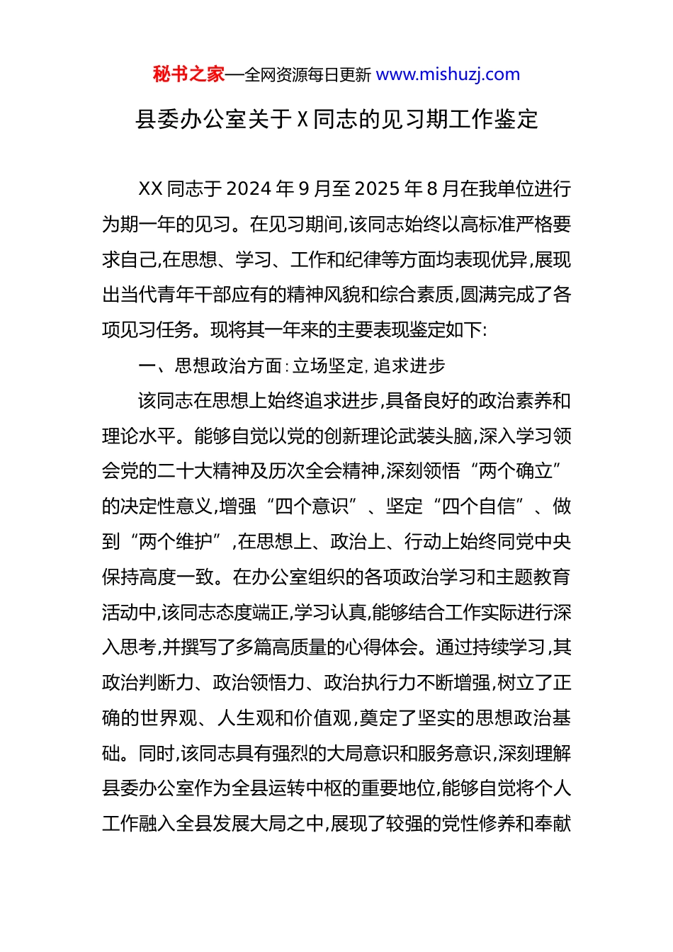 秘书之家—全网资源每日更新 www.mishuzj.com县委办公室关于 X 同志的见习期工作鉴定 XX 同志于 2024 年 9 月至 2025 年 8 月在我单位进行为期一年的见习。在见习期间,该同志始终以高标准严格要求自己,在思想、学习、工作和纪律等方面均表现优异,展现出当代青年干部应有的精神风貌和综合素质,圆满完成了各项见习任务。现将其一年来的主要表现鉴定如下:一、思想政治方面:立场坚定,追求进步该同志在思想上始终追求进步,具备良好的政治素养和理论水平。能够自觉以党的创新理论武装头脑,深入学习领会党的二十大精神及历次全会精神,深刻领悟“两个确立”的决定性意义,增强“四个意识”、坚定“四个自信”、做到“两个维护”,在思想上、政治上、行动上始终同党中央保持高度一致。在办公室组织的各项政治学习和主题教育活动中,该同志态度端正,学习认真,能够结合工作实际进行深入思考,并撰写了多篇高质量的心得体会。通过持续学习,其政治判断力、政治领悟力、政治执行力不断增强,树立了正确的世界观、人生观和价值观,奠定了坚实的思想政治基础。同时,该同志具有强烈的大局意识和服务意识,深刻理解县委办公室作为全县运转中枢的重要地位,能够自觉将个人工作融入全县发展大局之中,展现了较强的党性修养和奉献秘书之家—全网资源每日更新 www.mishuzj.com精神。二、学习能力方面:勤奋好学,学以致用作为一名见习生,该同志展现出强烈的求知欲和优秀的学习能力。面对办公室工作内容繁杂、节奏快、要求高的特点,他没有丝毫畏难情绪,而是将其视为学习和锻炼的宝贵机会。能够虚心向办公室的领导和同事请教,认真学习办文、办会、办事的基本规程,深入钻研公文处理、信息报送、档案管理、保密纪律等各项业务知识。他善于思考,勤于总结,能够举一反三,在较短时间内就掌握了办公室工作的基本流程和方法技巧。该同志注重理论与实践的有机结合,将在校所学的文秘知识、行政管理理论与办公室工作实践紧密结合,不断探索提高工作效率和质量的新方法。对于工作中遇到的新问题、新挑战,他能够主动查阅资料、探索研究,表现出优秀的自主学习能力和解决问题的潜力。一年来,其理论水平和业务技能均得到了显著提升。三、工作表现方面:尽职尽责,踏实肯干在具体工作实践中,该同志展现了高度的责任心和严谨务实的工作作风。他被安排协助办公室综合股的工作,在办文、办会及日常事务处理中均有出色表现。在办文工作中,他积极协助参与部分文件、通知、报告的草拟和校对工作。对待文字材料,他能够做到一丝不苟,对文件格式、逻辑秘书之家—全网资源每日更新 www.mishuzj.com结构、文字表述等进行认真核查,有效减少了文稿的差错率,保证了公文的严肃性和规范性。在办会工作中,无论是大型会议还是专题会议,他都能积极参与会前筹备、会中服务等环节。从会议通知的拟发、参会人员的联络,到会议材料的印制分发、会场的布置安排,他都做得有条不紊、细致周到,为各类会议的顺利召开提供了有力保障。在处理日常事务方面,他同样表现出色。在接听工作电话时,他能够做到语言文明、态度热情、记录清晰、转达准确;在接待来访群众和基层干部时,他耐心诚恳,应对得体,树立了县委办公室的良好形象。该同志工作积极主动,从不拈轻怕重,面对急难险重的任务从不推诿,能够自觉加班加点,保质保量完成领导交办的各项工作任务,展现了不怕苦、不怕累的优良作风和强烈的集体荣誉感,获得办公室领导和同事们的一致肯定。四、纪律作风方面:严于律己,团结同志该同志具备很强的纪律观念和组织观念。在见习期间,他能够严格遵守我单位的各项规章制度和工作纪律,时刻以一名正式干部的标准来要求自己。他自觉遵守上下班时间,全年未出现迟到、早退或无故缺勤现象。在工作中,他严守保密纪律,不该问的不问,不该说的不说,不该看的不看,表现出高度的组织纪律性。在生活作风上,他朴素节俭,待人真诚。能够尊敬领导,团结同事,主动融入办公室这个大家庭。秘书之家—全网资源每日更新 www.mishuzj.com当同事在工作上需要帮助时,他总是乐于伸出援手,积极协作,营造了和谐融洽的工作氛围。其谦逊、踏实、诚恳的为人处世态度,赢得了大家的一致好评。综上所述,XX 同志...