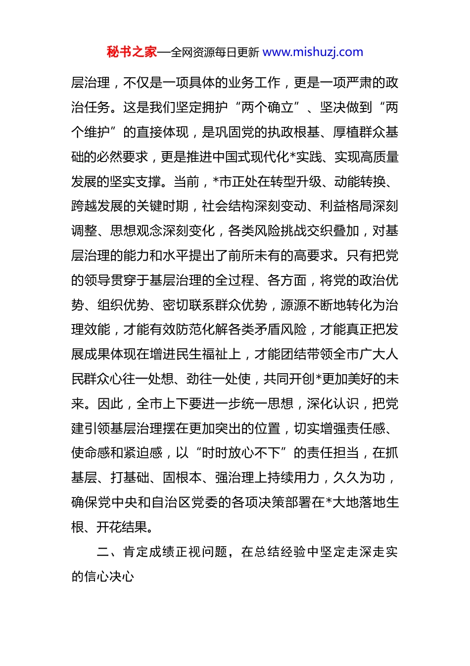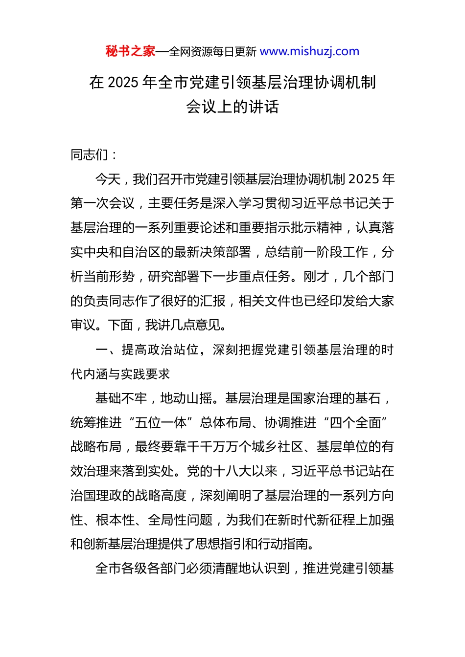 秘书之家—全网资源每日更新 www.mishuzj.com在 2025 年全市党建引领基层治理协调机制会议上的讲话 同志们:今天,我们召开市党建引领基层治理协调机制 2025 年第一次会议,主要任务是深入学习贯彻习近平总书记关于基层治理的一系列重要论述和重要指示批示精神,认真落实中央和自治区的最新决策部署,总结前一阶段工作,分析当前形势,研究部署下一步重点任务。刚才,几个部门的负责同志作了很好的汇报,相关文件也已经印发给大家审议。下面,我讲几点意见。一、提高政治站位,深刻把握党建引领基层治理的时代内涵与实践要求基础不牢,地动山摇。基层治理是国家治理的基石,统筹推进“五位一体”总体布局、协调推进“四个全面”战略布局,最终要靠千千万万个城乡社区、基层单位的有效治理来落到实处。党的十八大以来,习近平总书记站在治国理政的战略高度,深刻阐明了基层治理的一系列方向性、根本性、全局性问题,为我们在新时代新征程上加强和创新基层治理提供了思想指引和行动指南。全市各级各部门必须清醒地认识到,推进党建引领基秘书之家—全网资源每日更新 www.mishuzj.com层治理,不仅是一项具体的业务工作,更是一项严肃的政治任务。这是我们坚定拥护“两个确立”、坚决做到“两个维护”的直接体现,是巩固党的执政根基、厚植群众基础的必然要求,更是推进中国式现代化*实践、实现高质量发展的坚实支撑。当前,*市正处在转型升级、动能转换、跨越发展的关键时期,社会结构深刻变动、利益格局深刻调整、思想观念深刻变化,各类风险挑战交织叠加,对基层治理的能力和水平提出了前所未有的高要求。只有把党的领导贯穿于基层治理的全过程、各方面,将党的政治优势、组织优势、密切联系群众优势,源源不断地转化为治理效能,才能有效防范化解各类矛盾风险,才能真正把发展成果体现在增进民生福祉上,才能团结带领全市广大人民群众心往一处想、劲往一处使,共同开创*更加美好的未来。因此,全市上下要进一步统一思想,深化认识,把党建引领基层治理摆在更加突出的位置,切实增强责任感、使命感和紧迫感,以“时时放心不下”的责任担当,在抓基层、打基础、固根本、强治理上持续用力,久久为功,确保党中央和自治区党委的各项决策部署在*大地落地生根、开花结果。二、肯定成绩正视问题,在总结经验中坚定走深走实的信心决心秘书之家—全网资源每日更新 www.mishuzj.com近年来,全市上下坚持大抓基层的鲜明导向,在党建引领基层治理方面进行了一系列积极探索和有益实践,取得了阶段性成效。治理体系不断健全,市、区(县)、乡镇(街道)、村(社区)四级联动的指挥体系和运行机制初步形成;治理能力稳步提升,基层党组织的政治功能和组织功能持续增强;特色品牌效应显现,特别是“*多民族社区居民亲如一家”的品牌影响力持续扩大。例如,在*花园社区、*颐和社区等地,通过“邻里节”“百家宴”“石榴籽工作室”等载体,各族群众交往交流交融的场景日益丰富,社区的凝聚力和向心力显著增强。据不完全统计,截至今年第三季度,全市参与相关品牌活动的居民已超过30 万人次,居民对社区服务的满意度调查中,民族团结和社区和谐相关指标的评分始终保持在 95 分以上,这充分说明我们的工作是富有成效的,是深得民心的。在肯定成绩的同时,我们更要用辩证的、发展的眼光审视工作中存在的短板和不足。对标中央和自治区的要求,对标人民群众的期盼,我们的工作还存在一些亟待解决的突出问题。一是系统集成度还不够高。有的地方和部门在思想上仍然存在“条块分割”的惯性思维,资源统筹力度不足,政策协同效应不强。“党委统一领导、组织部门牵头协调、社会工作部门具体指导、有关部门和行业系秘书之家—全网资源每日更新 www.mishuzj.com统齐抓共管、街道乡镇和农村社区党组织兜底管理”的领导体制和责任机制,在具体运行中还存在衔接不畅、协同不力的情况,导致治理合力未能完全形成。二是发展不平衡问题依然存在。一些基层治理的创新举措和品牌亮点,盆景多、风景少,点上开花、面上结果的效应还不够明显。部分社区党建工作与业务工作融合不深,党建引领的作用发挥不充分。...