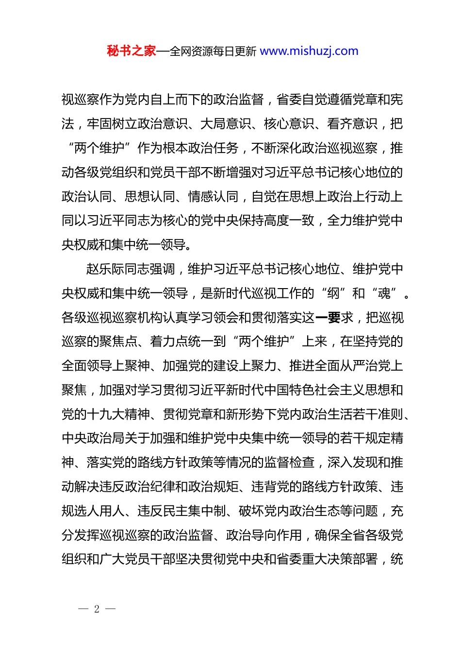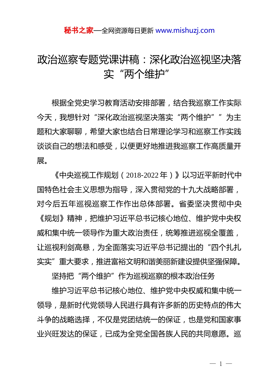 秘书之家—全网资源每日更新 www.mishuzj.com政治巡察专题党课讲稿:深化政治巡视坚决落实“两个维护”根据全党史学习教育活动安排部署,结合我巡察工作实际今天,我想针对“深化政治巡视坚决落实“两个维护””为主题和大家聊聊,希望大家也结合日常理论学习和巡察工作实践谈谈自己的想法和感受,以便更好地推进我巡察工作高质量开展。《中央巡视工作规划(2018-2022 年)》以习近平新时代中国特色社会主义思想为指导,深入贯彻党的十九大战略部署,对今后五年巡视巡察工作作出总体部署。省委坚决贯彻中央《规划》精神,把维护习近平总书记核心地位、维护党中央权威和集中统一领导作为重大政治责任,统筹推进巡视全覆盖,让巡视利剑高悬,为全面落实习近平总书记提出的“四个扎扎实实”重大要求,推进富裕文明和谐美丽新建设提供坚强保障。坚持把“两个维护”作为巡视巡察的根本政治任务维护习近平总书记核心地位、维护党中央权威和集中统一领导,是新时代党领导人民进行具有许多新的历史特点的伟大斗争的战略选择,不仅是党团结统一的保证,也是党和国家事业兴旺发达的保证,已成为全党全国各族人民的共同意愿。巡— 1 —秘书之家—全网资源每日更新 www.mishuzj.com视巡察作为党内自上而下的政治监督,省委自觉遵循党章和宪法,牢固树立政治意识、大局意识、核心意识、看齐意识,把“两个维护”作为根本政治任务,不断深化政治巡视巡察,推动各级党组织和党员干部不断增强对习近平总书记核心地位的政治认同、思想认同、情感认同,自觉在思想上政治上行动上同以习近平同志为核心的党中央保持高度一致,全力维护党中央权威和集中统一领导。赵乐际同志强调,维护习近平总书记核心地位、维护党中央权威和集中统一领导,是新时代巡视工作的“纲”和“魂”。各级巡视巡察机构认真学习领会和贯彻落实这一要求,把巡视巡察的聚焦点、着力点统一到“两个维护”上来,在坚持党的全面领导上聚神、加强党的建设上聚力、推进全面从严治党上聚焦,加强对学习贯彻习近平新时代中国特色社会主义思想和党的十九大精神、贯彻党章和新形势下党内政治生活若干准则、中央政治局关于加强和维护党中央集中统一领导的若干规定精神、落实党的路线方针政策等情况的监督检查,深入发现和推动解决违反政治纪律和政治规矩、违背党的路线方针政策、违规选人用人、违反民主集中制、破坏党内政治生态等问题,充分发挥巡视巡察的政治监督、政治导向作用,确保全省各级党组织和广大党员干部坚决贯彻党中央和省委重大决策部署,统— 2 —秘书之家—全网资源每日更新 www.mishuzj.com一意志、统一行动、步调一致前进,实现省第十三次党代会确定的各项奋斗目标。坚持把“两个维护”贯穿到扎牢织密巡视巡察监督网建设中巡视巡察是对党组织的全面政治体检,是推动各级党组织自觉做到“两个维护”的重要举措。要按照习近平总书记“坚持党组织建到哪里,巡视巡察就跟进到哪里”的指示要求,进一步完善巡视巡察监督体系,推动深化发展,着力构建横向到边、纵向到底、上下联动的工作格局,扎牢织密监督网,实现巡视巡察监督常态化制度化。推进横向全覆盖。实现一届党委任期内对所管理党组织巡视一遍,是党章的“硬指标”“硬规定”。省委对标中央要求,坚持常规巡视与专项巡视相结合,充分发挥不同巡视方式的优势,全面推进巡视全覆盖。针对脱贫攻坚任务重的省情实际,把市州县作为监督重点,采取“州县同步、以州带县、从县察州、州县相互印证”的方法,同步对市州和所管辖县(市、区)进行巡视,为全面评估本地区政治生态状况,助推脱贫攻坚提供重要依据和支撑。对党委政府各部门、企事业单位、高校、金融单位、群团组织,统筹安排常规巡视,深化专项巡视,强化“机动式”巡视,加大“回头看”力度,打好组合拳,进— 3 —秘书之家—全网资源每日更新 www.mishuzj.com一步强化对问题规律性的认识,增强覆盖实效,指导深化改革、推动事业发展。让“回头看”成为常态,对巡视过的党组织杀“回马枪”,释放不是巡视一次就“万事大吉”的强烈信号,体现党内监督的韧劲和严肃性。用好“机动式”巡视,出其不意,精准...