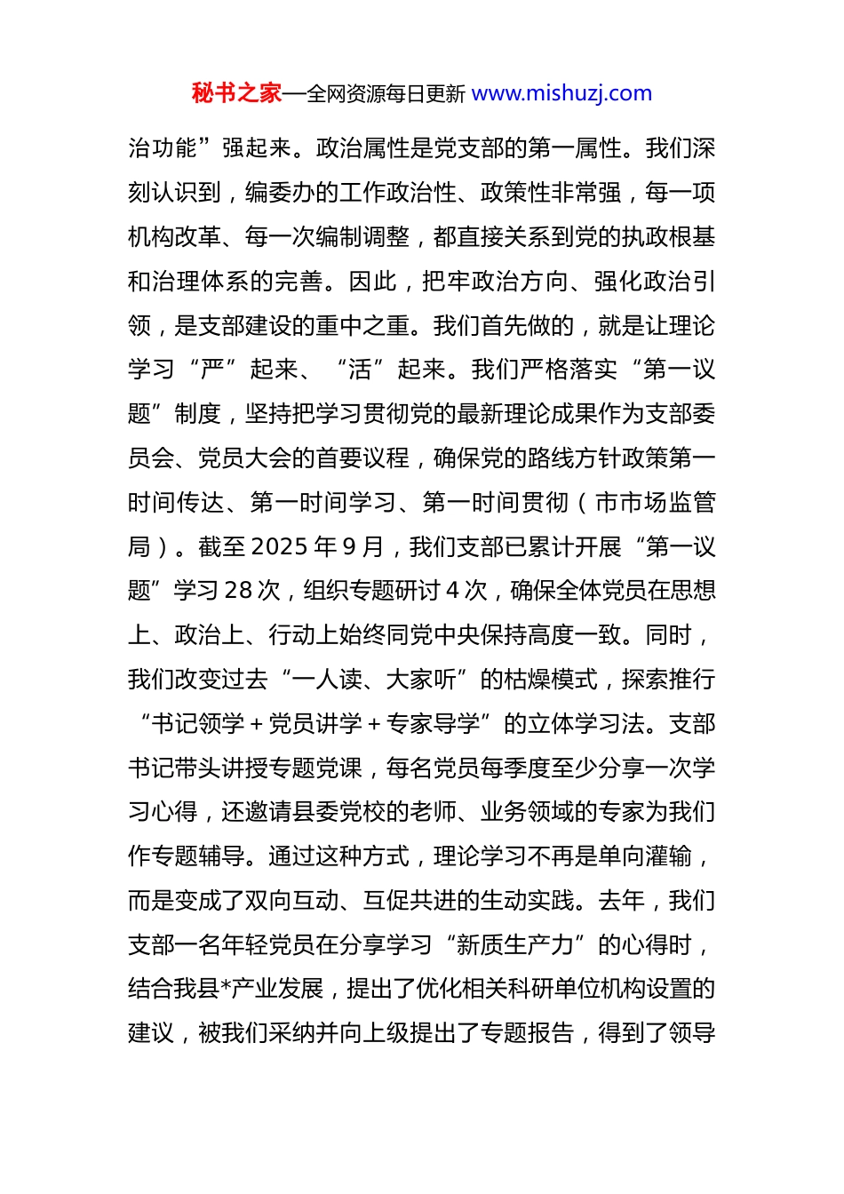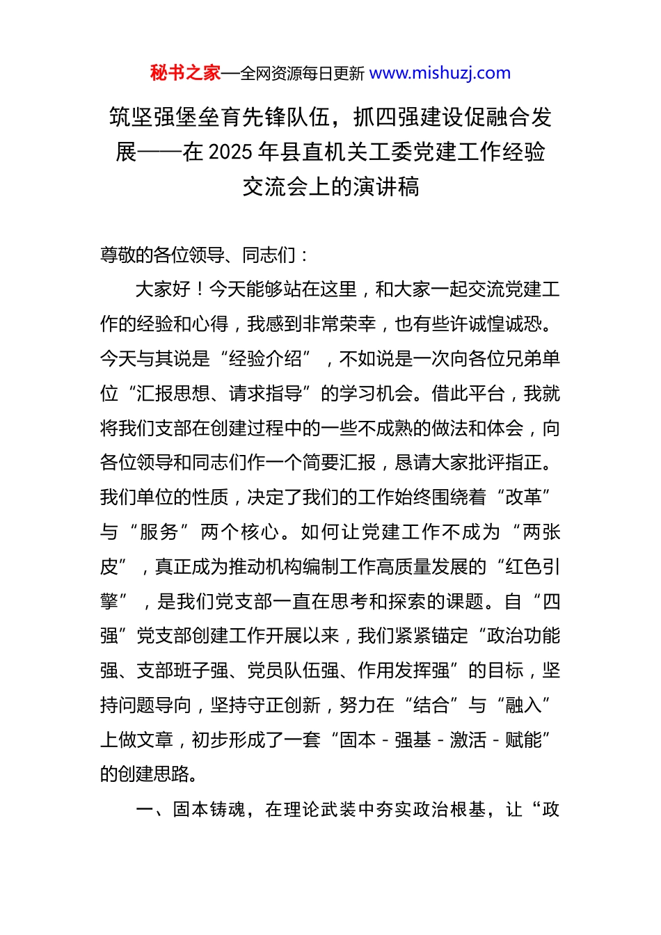 秘书之家—全网资源每日更新 www.mishuzj.com筑坚强堡垒育先锋队伍,抓四强建设促融合发展——在 2025 年县直机关工委党建工作经验交流会上的演讲稿 尊敬的各位领导、同志们:大家好!今天能够站在这里,和大家一起交流党建工作的经验和心得,我感到非常荣幸,也有些许诚惶诚恐。今天与其说是“经验介绍”,不如说是一次向各位兄弟单位“汇报思想、请求指导”的学习机会。借此平台,我就将我们支部在创建过程中的一些不成熟的做法和体会,向各位领导和同志们作一个简要汇报,恳请大家批评指正。我们单位的性质,决定了我们的工作始终围绕着“改革”与“服务”两个核心。如何让党建工作不成为“两张皮”,真正成为推动机构编制工作高质量发展的“红色引擎”,是我们党支部一直在思考和探索的课题。自“四强”党支部创建工作开展以来,我们紧紧锚定“政治功能强、支部班子强、党员队伍强、作用发挥强”的目标,坚持问题导向,坚持守正创新,努力在“结合”与“融入”上做文章,初步形成了一套“固本-强基-激活-赋能”的创建思路。一、固本铸魂,在理论武装中夯实政治根基,让“政秘书之家—全网资源每日更新 www.mishuzj.com治功能”强起来。政治属性是党支部的第一属性。我们深刻认识到,编委办的工作政治性、政策性非常强,每一项机构改革、每一次编制调整,都直接关系到党的执政根基和治理体系的完善。因此,把牢政治方向、强化政治引领,是支部建设的重中之重。我们首先做的,就是让理论学习“严”起来、“活”起来。我们严格落实“第一议题”制度,坚持把学习贯彻党的最新理论成果作为支部委员会、党员大会的首要议程,确保党的路线方针政策第一时间传达、第一时间学习、第一时间贯彻(市市场监管局)。截至 2025 年 9 月,我们支部已累计开展“第一议题”学习 28 次,组织专题研讨 4 次,确保全体党员在思想上、政治上、行动上始终同党中央保持高度一致。同时,我们改变过去“一人读、大家听”的枯燥模式,探索推行“书记领学+党员讲学+专家导学”的立体学习法。支部书记带头讲授专题党课,每名党员每季度至少分享一次学习心得,还邀请县委党校的老师、业务领域的专家为我们作专题辅导。通过这种方式,理论学习不再是单向灌输,而是变成了双向互动、互促共进的生动实践。去年,我们支部一名年轻党员在分享学习“新质生产力”的心得时,结合我县*产业发展,提出了优化相关科研单位机构设置的建议,被我们采纳并向上级提出了专题报告,得到了领导秘书之家—全网资源每日更新 www.mishuzj.com的肯定。这让我们真切感受到,理论学习学深了、悟透了,是能够直接转化为服务发展的具体思路和有效举措的。二、强基固垒,在优化结构中锻造战斗核心,让“支部班子”强起来。俗话说,“火车跑得快,全靠车头带”。支部班子就是党支部的“火车头”,班子的强弱,直接决定了支部的战斗力。在建强支部班子方面,我们重点抓了“选”和“育”两个环节。在“选”上,我们坚持德才兼备、以德为先的原则,严格按照规范程序进行换届选举(市市场监管局)。我们特别注重把那些政治上靠得住、工作上有本事、作风上过得硬、群众中有威信的优秀青年党员,选拔到支部委员会中来(市市场监管局)。目前,我们新一届支委班子平均年龄下降到了 38 岁,本科及以上学历占比达到 100%,班子结构更加年轻化、知识化、专业化,整个班子充满了朝气和活力。在“育”上,我们着力提升支委班子的履职能力。一方面,我们建立了支委学习日制度,定期组织学习《中国共产党支部工作条例(试行)》等党内法规,让大家真正成为党务工作的“明白人”。另一方面,我们积极“走出去”,先后选派支委委员参加市直机关工委举办的新任党支部书记示范培训班和党务干部能力提升培训班,开阔视野,增长才干秘书之家—全网资源每日更新 www.mishuzj.com(市市场监管局)。同时,我们着力完善议事决策机制,制定了《党支部委员会议事规则》,明确了议事范围和程序,坚持民主集中制,凡属重大事项均由支委会集体研究决定,确保决策的科学化、民主化。通过这一系列举措,支部班子的凝聚力、向心力和战斗力显著增...