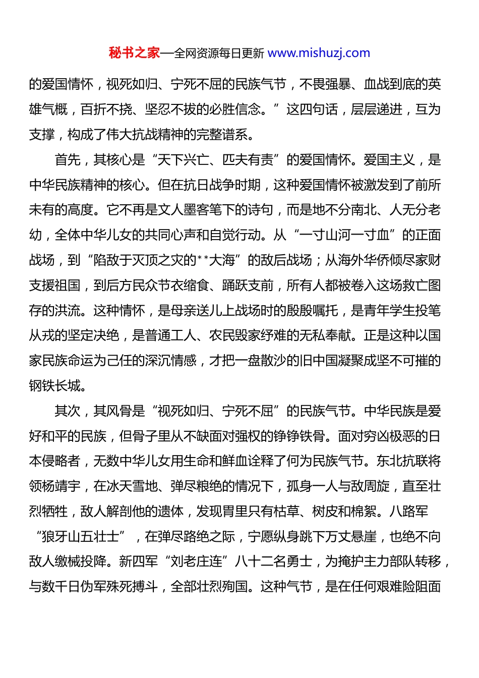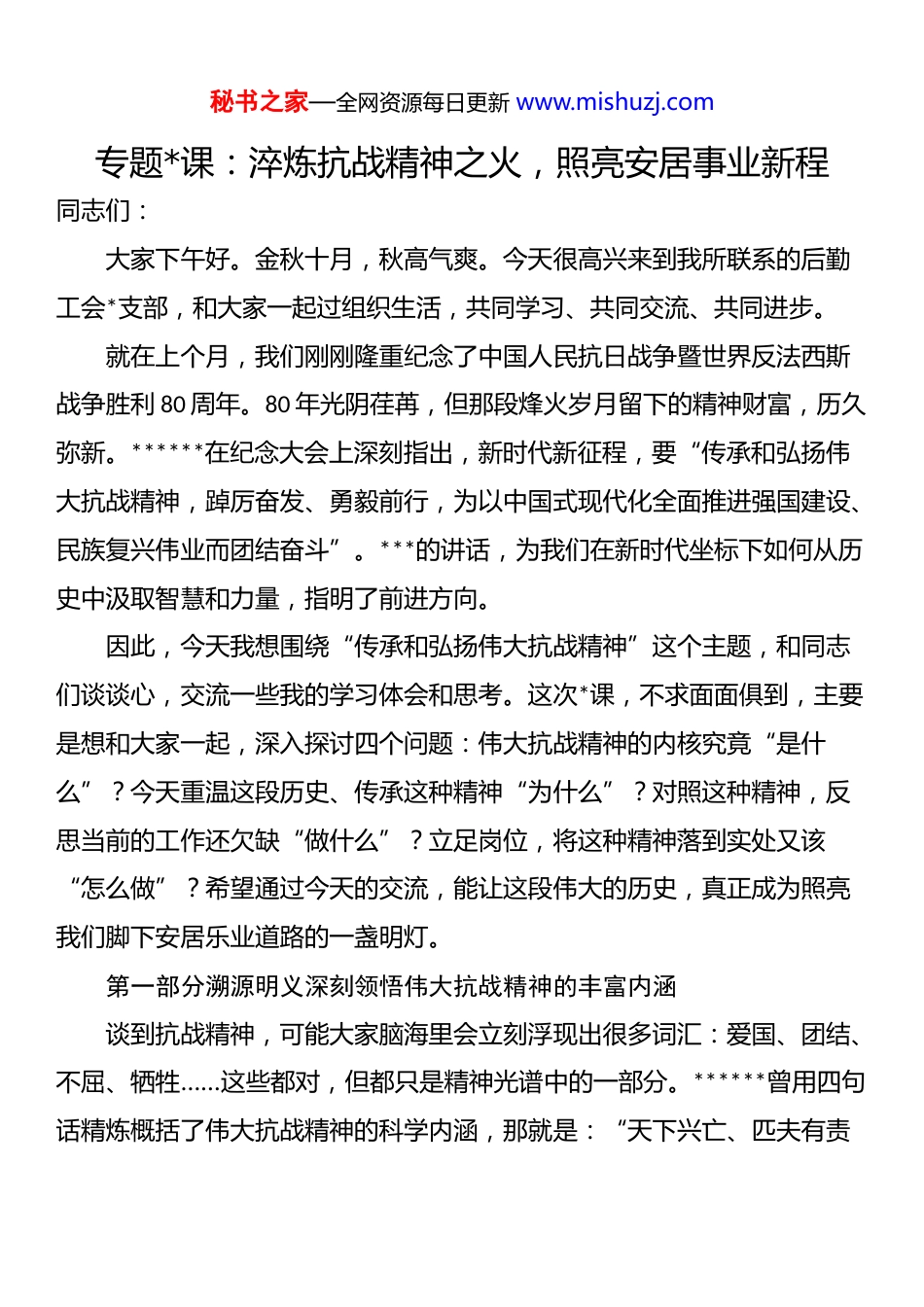 秘书之家—全网资源每日更新 www.mishuzj.com专题*课:淬炼抗战精神之火,照亮安居事业新程同志们:大家下午好。金秋十月,秋高气爽。今天很高兴来到我所联系的后勤工会*支部,和大家一起过组织生活,共同学习、共同交流、共同进步。就在上个月,我们刚刚隆重纪念了中国人民抗日战争暨世界反法西斯战争胜利 80 周年。80 年光阴荏苒,但那段烽火岁月留下的精神财富,历久弥新。******在纪念大会上深刻指出,新时代新征程,要“传承和弘扬伟大抗战精神,踔厉奋发、勇毅前行,为以中国式现代化全面推进强国建设、民族复兴伟业而团结奋斗”。***的讲话,为我们在新时代坐标下如何从历史中汲取智慧和力量,指明了前进方向。因此,今天我想围绕“传承和弘扬伟大抗战精神”这个主题,和同志们谈谈心,交流一些我的学习体会和思考。这次*课,不求面面俱到,主要是想和大家一起,深入探讨四个问题:伟大抗战精神的内核究竟“是什么”?今天重温这段历史、传承这种精神“为什么”?对照这种精神,反思当前的工作还欠缺“做什么”?立足岗位,将这种精神落到实处又该“怎么做”?希望通过今天的交流,能让这段伟大的历史,真正成为照亮我们脚下安居乐业道路的一盏明灯。第一部分溯源明义深刻领悟伟大抗战精神的丰富内涵谈到抗战精神,可能大家脑海里会立刻浮现出很多词汇:爱国、团结、不屈、牺牲……这些都对,但都只是精神光谱中的一部分。******曾用四句话精炼概括了伟大抗战精神的科学内涵,那就是:“天下兴亡、匹夫有责秘书之家—全网资源每日更新 www.mishuzj.com的爱国情怀,视死如归、宁死不屈的民族气节,不畏强暴、血战到底的英雄气概,百折不挠、坚忍不拔的必胜信念。”这四句话,层层递进,互为支撑,构成了伟大抗战精神的完整谱系。首先,其核心是“天下兴亡、匹夫有责”的爱国情怀。爱国主义,是中华民族精神的核心。但在抗日战争时期,这种爱国情怀被激发到了前所未有的高度。它不再是文人墨客笔下的诗句,而是地不分南北、人无分老幼,全体中华儿女的共同心声和自觉行动。从“一寸山河一寸血”的正面战场,到“陷敌于灭顶之灾的**大海”的敌后战场;从海外华侨倾尽家财支援祖国,到后方民众节衣缩食、踊跃支前,所有人都被卷入这场救亡图存的洪流。这种情怀,是母亲送儿上战场时的殷殷嘱托,是青年学生投笔从戎的坚定决绝,是普通工人、农民毁家纾难的无私奉献。正是这种以国家民族命运为己任的深沉情感,才把一盘散沙的旧中国凝聚成坚不可摧的钢铁长城。其次,其风骨是“视死如归、宁死不屈”的民族气节。中华民族是爱好和平的民族,但骨子里从不缺面对强权的铮铮铁骨。面对穷凶极恶的日本侵略者,无数中华儿女用生命和鲜血诠释了何为民族气节。东北抗联将领杨靖宇,在冰天雪地、弹尽粮绝的情况下,孤身一人与敌周旋,直至壮烈牺牲,敌人解剖他的遗体,发现胃里只有枯草、树皮和棉絮。八路军“狼牙山五壮士”,在弹尽路绝之际,宁愿纵身跳下万丈悬崖,也绝不向敌人缴械投降。新四军“刘老庄连”八十二名勇士,为掩护主力部队转移,与数千日伪军殊死搏斗,全部壮烈殉国。这种气节,是在任何艰难险阻面秘书之家—全网资源每日更新 www.mishuzj.com前都压不垮、打不倒的脊梁。它告诉世界,中国人民不可欺、中华民族不可侮!再者,其胆魄是“不畏强暴、血战到底”的英雄气概。抗日战争,是一场敌我力量极其悬殊的战争。当时日本的工业产值是中国的 6 倍,钢产量是中国的近 140 倍。面对这样一个武装到牙齿的强大敌人,“亡国论”一度甚嚣尘上。但是,中国人民没有被吓倒。从淞沪会战的寸土必争,到台儿庄战役的浴血大捷;从平型关的首次亮剑,到百团大战的主动出击,中国军民以大无畏的英雄气概,用血肉之躯筑起了新的长城。这种气概,是张自忠将军“为国家民族死之决心,海不清,石不烂,决不半点改变”的遗书,是左权将军“十字岭上,与日寇相搏,直到最后一息”的壮举。它展现的是一种敢于斗争、敢于胜利的无畏精神,一种“明知山有虎,偏向虎山行”的革命乐观主义。最后,其支撑是“百折不挠、坚忍不拔”的必胜信念。十四年抗战,漫长而艰苦,充满了挫折与牺牲。...