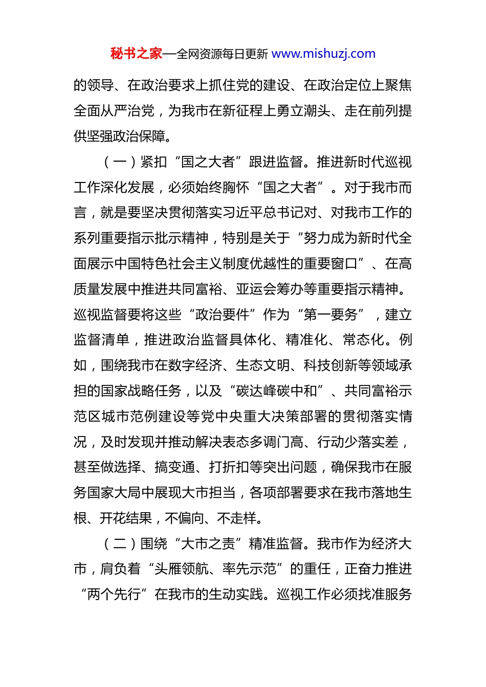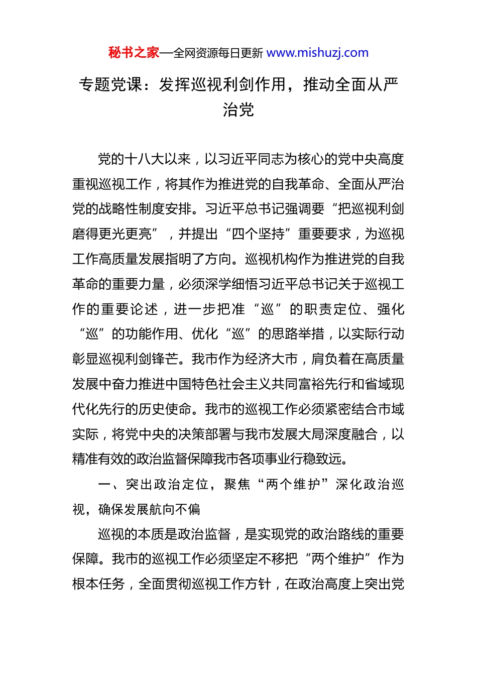 秘书之家—全网资源每日更新 www.mishuzj.com专题党课:发挥巡视利剑作用,推动全面从严治党 党的十八大以来,以习近平同志为核心的党中央高度重视巡视工作,将其作为推进党的自我革命、全面从严治党的战略性制度安排。习近平总书记强调要“把巡视利剑磨得更光更亮”,并提出“四个坚持”重要要求,为巡视工作高质量发展指明了方向。巡视机构作为推进党的自我革命的重要力量,必须深学细悟习近平总书记关于巡视工作的重要论述,进一步把准“巡”的职责定位、强化“巡”的功能作用、优化“巡”的思路举措,以实际行动彰显巡视利剑锋芒。我市作为经济大市,肩负着在高质量发展中奋力推进中国特色社会主义共同富裕先行和省域现代化先行的历史使命。我市的巡视工作必须紧密结合市域实际,将党中央的决策部署与我市发展大局深度融合,以精准有效的政治监督保障我市各项事业行稳致远。一、突出政治定位,聚焦“两个维护”深化政治巡视,确保发展航向不偏巡视的本质是政治监督,是实现党的政治路线的重要保障。我市的巡视工作必须坚定不移把“两个维护”作为根本任务,全面贯彻巡视工作方针,在政治高度上突出党秘书之家—全网资源每日更新 www.mishuzj.com的领导、在政治要求上抓住党的建设、在政治定位上聚焦全面从严治党,为我市在新征程上勇立潮头、走在前列提供坚强政治保障。(一)紧扣“国之大者”跟进监督。推进新时代巡视工作深化发展,必须始终胸怀“国之大者”。对于我市而言,就是要坚决贯彻落实习近平总书记对、对我市工作的系列重要指示批示精神,特别是关于“努力成为新时代全面展示中国特色社会主义制度优越性的重要窗口”、在高质量发展中推进共同富裕、亚运会筹办等重要指示精神。巡视监督要将这些“政治要件”作为“第一要务”,建立监督清单,推进政治监督具体化、精准化、常态化。例如,围绕我市在数字经济、生态文明、科技创新等领域承担的国家战略任务,以及“碳达峰碳中和”、共同富裕示范区城市范例建设等党中央重大决策部署的贯彻落实情况,及时发现并推动解决表态多调门高、行动少落实差,甚至做选择、搞变通、打折扣等突出问题,确保我市在服务国家大局中展现大市担当,各项部署要求在我市落地生根、开花结果,不偏向、不走样。(二)围绕“大市之责”精准监督。我市作为经济大市,肩负着“头雁领航、率先示范”的重任,正奋力推进“两个先行”在我市的生动实践。巡视工作必须找准服务秘书之家—全网资源每日更新 www.mishuzj.com保障我市经济社会高质量发展的切入点、着力点。要紧盯我市打造全球数字贸易中心、建设国际知名的旅游休闲中心、打造全国高端装备制造基地、建设新时代文化高地等“强市之要”,紧扣事关我市高质量发展的重点工作、突出问题和风险隐患开展监督。例如,在产业发展方面,关注数字经济核心产业的引领作用发挥、传统产业转型升级、战略性新兴产业培育情况;在城市治理方面,关注超大城市运行安全、城市精细化管理水平;在民生福祉方面,关注公共服务优质共享、“一老一小”问题解决、共同富裕示范区建设的短板弱项。通过精准监督,推动各级党组织和广大党员干部完整准确全面贯彻新发展理念,牢牢把握“经济大省挑大梁、经济大市勇担当”的重大要求,努力让中国式现代化在我市展现出更加可观可感的现实图景。(三)紧盯“关键少数”有效监督。加强对“一把手”和领导班子监督,是党中央对巡视工作的重要要求,也是我市推进全面从严治党向纵深发展的关键环节。巡视具有独特的政治优势、组织优势和群众优势,是破解“一把手”监督难题的有效方式。我市在巡视中,要始终围绕“权”“责”二字深化对“一把手”的监督。既看其在贯彻落实党中央和省委、市委决策部署中是否坚决有力、有秘书之家—全网资源每日更新 www.mishuzj.com无权力寻租和腐败问题,又看其管党治党政治责任是否层层压实;既看“一把手”个人廉洁自律情况,又看其对身边工作人员、家属子女的教育管理情况;既看“八小时内”的工作作风和履职成效,又关注“八小时外”的生活圈、社交圈是否清朗;既听取党员干部的评价,更注重收集企业、群众和服务对象的口碑。例如,在...